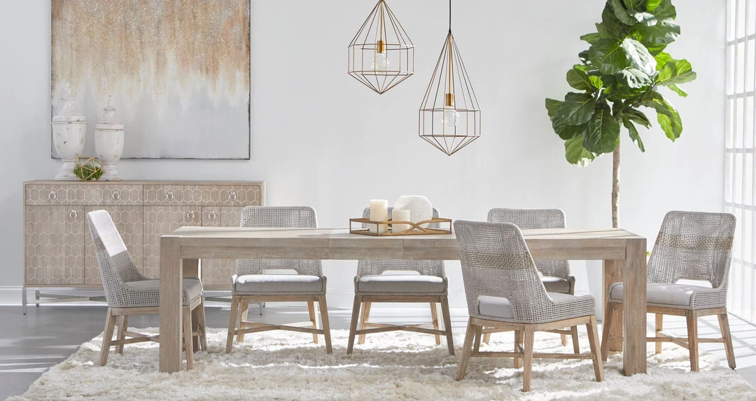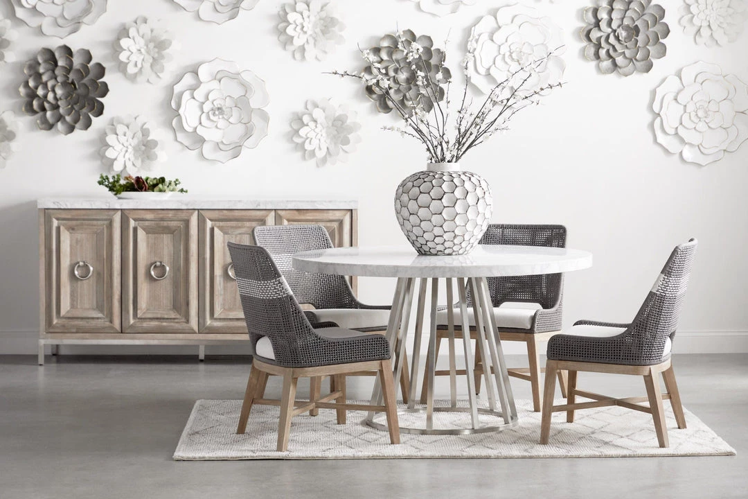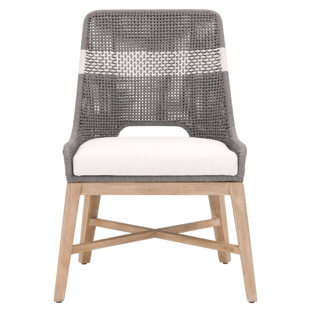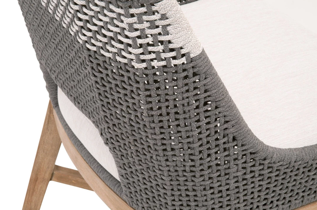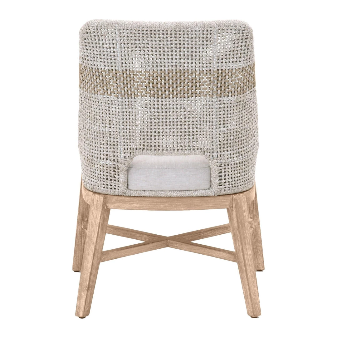 The Tapestry Dining Chair features an interwoven rope pattern, an “X” stretcher base design, solid wood frame, a fixed seat cushion, and outdoor performance fabric (specially treated to be water repellent and reduce fabric absorption of liquid, soil and stains).