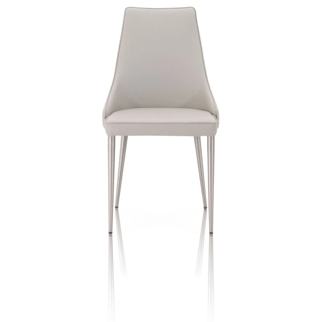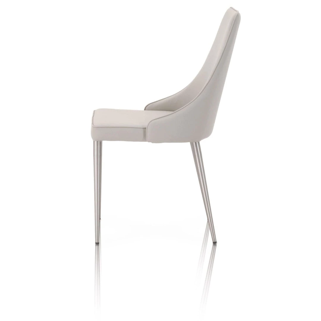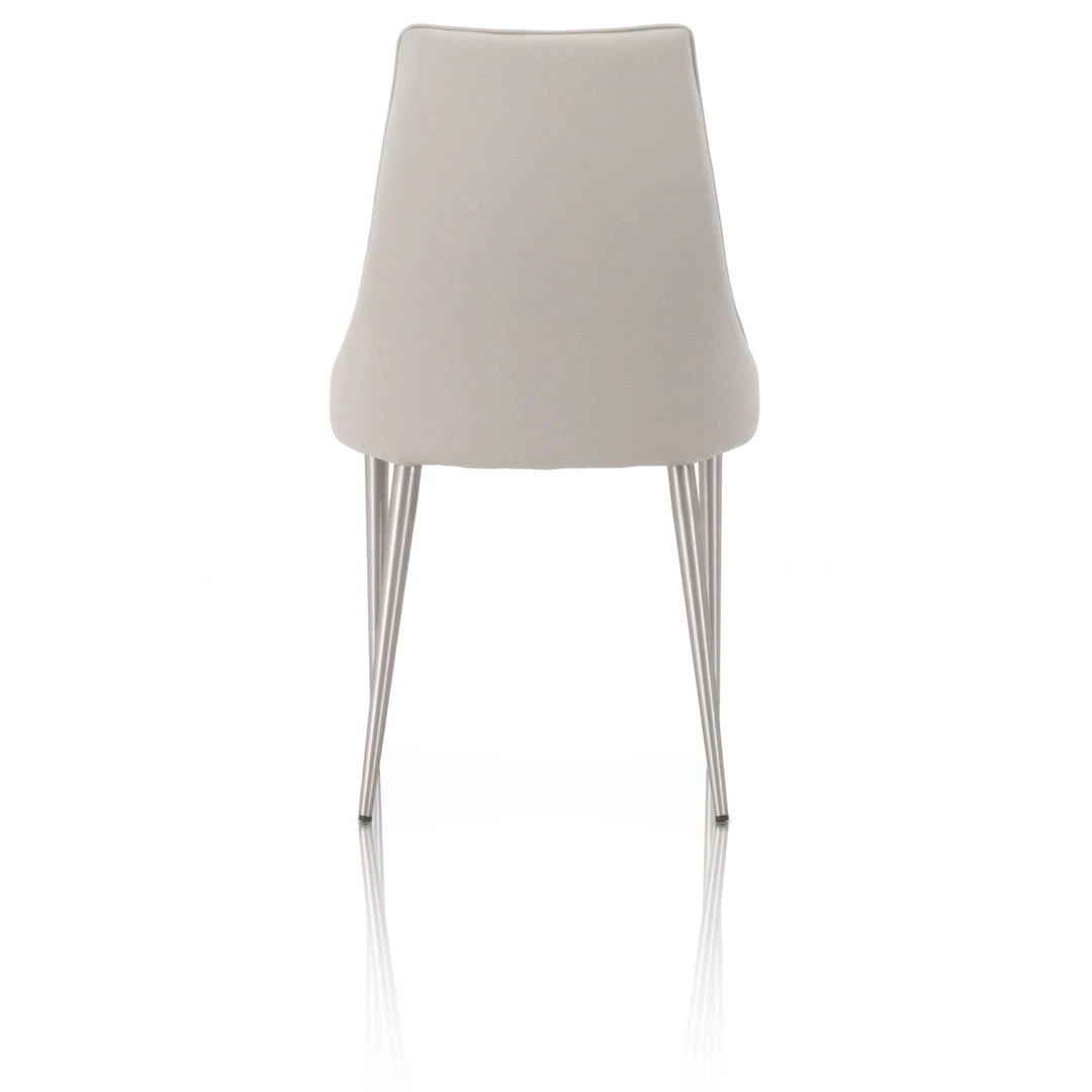 With a curved seat back, beautiful light gray synthetic leather, and brushed stainless steel legs, the Ivy Dining Chair gives the modern look with great comfort. Meridian Collection’s Synthetic Leather should be cleaned with oil-based products such as Murphy’s Oil. Alcohol-based cleaners should not be used.