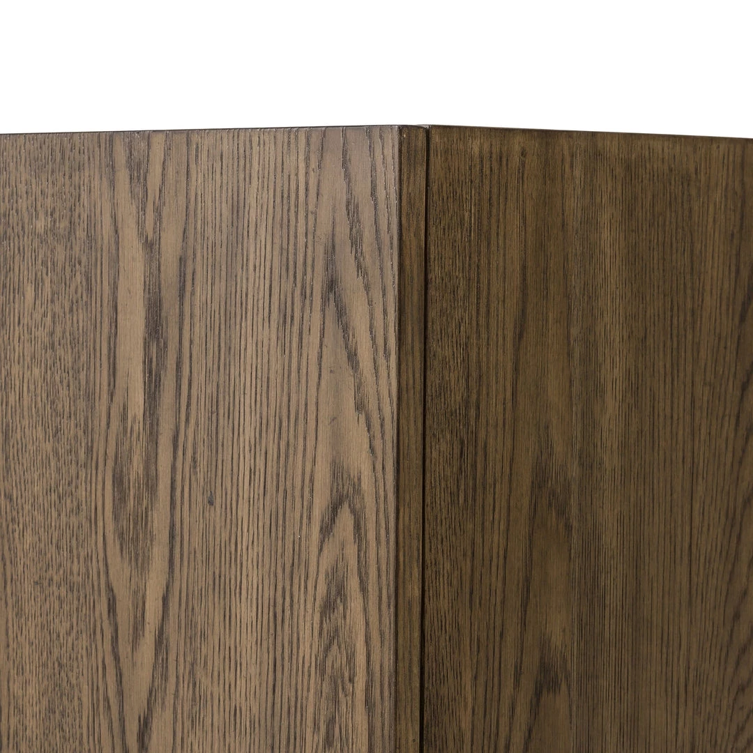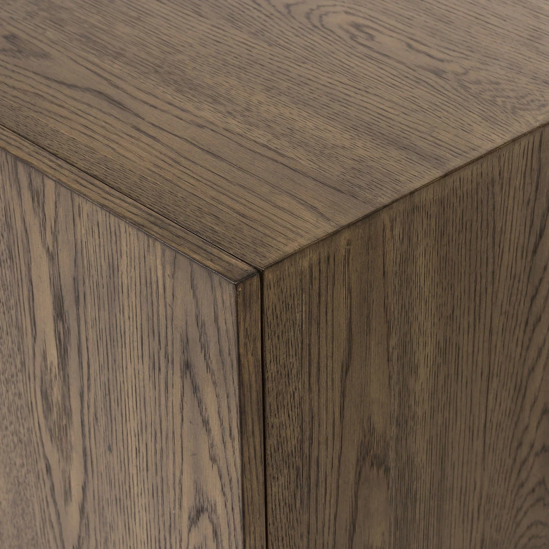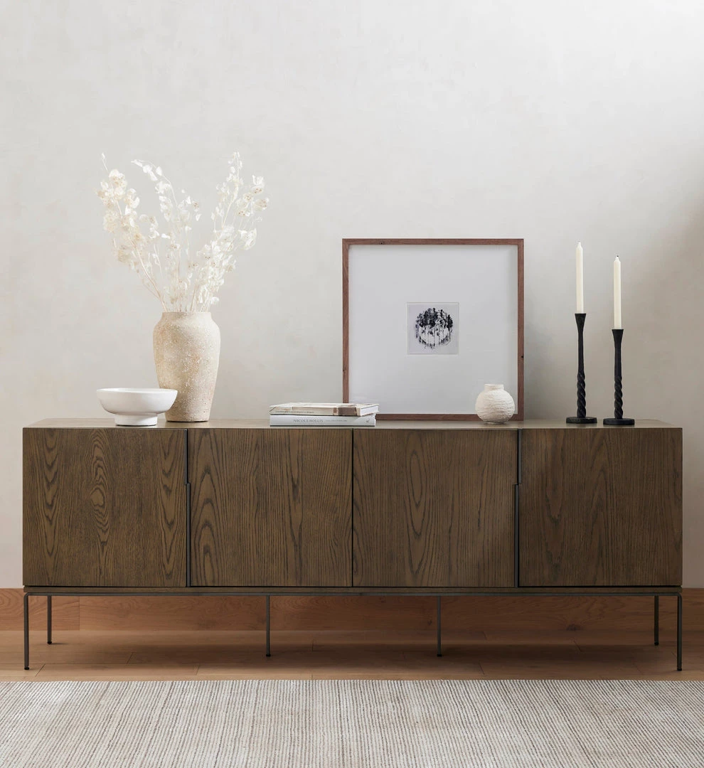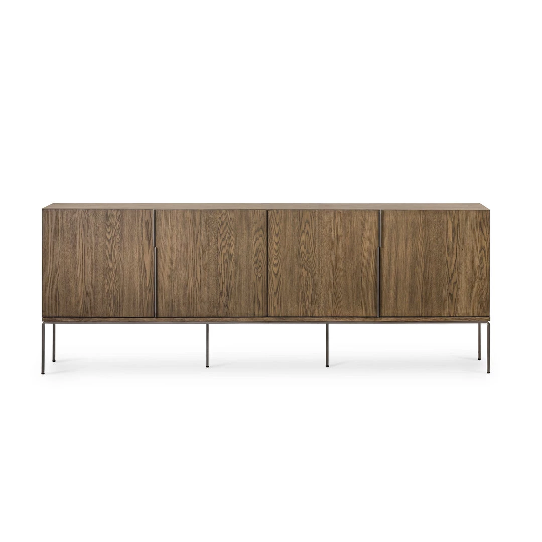 Finished in a light gunmetal, offset iron hardware adds eye-catching interest to this streamlined oak sideboard, a rich hazel finish bringing extra depth to mid-century-inspired storage.
