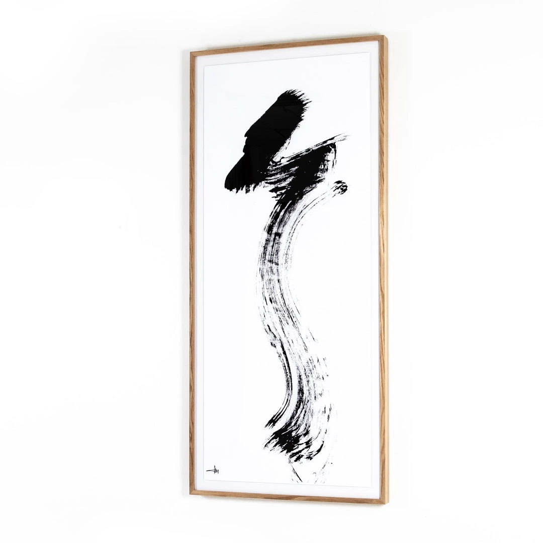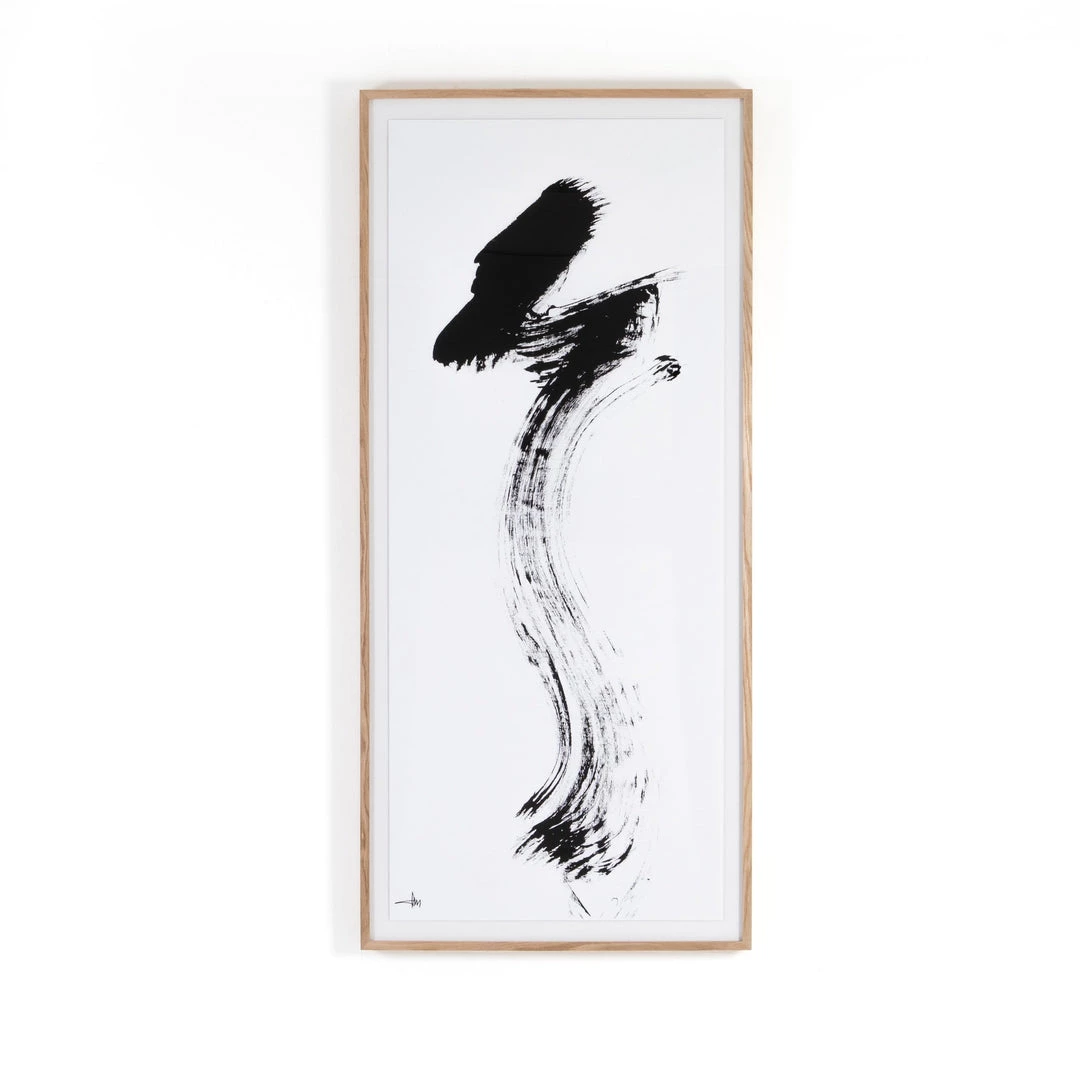 Texas-based painter Johan Manschot keeps it stark and simple, with a big black brushstroke on clean-white canvas. Printed on top-quality watercolor paper and framed within natural oak for a museum-quality look. Handmade in Austin, Texas.