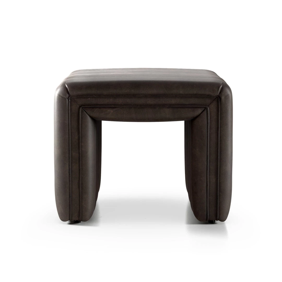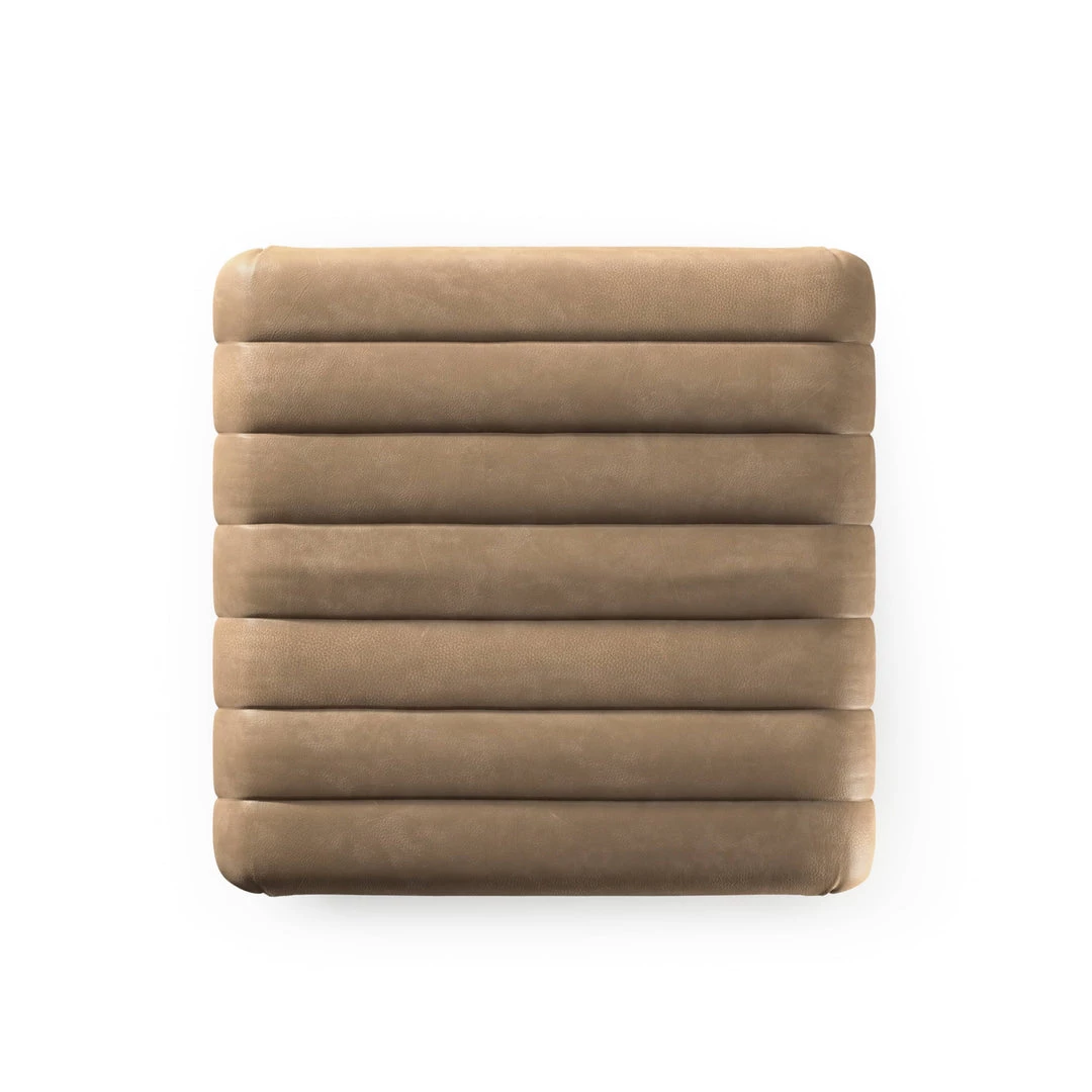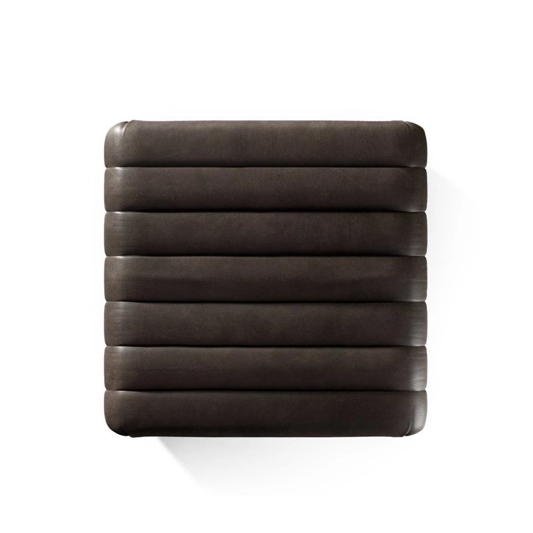 Layer in an extra surface or added seating by way of a top-grain leather ottoman in a rich deep brown, with dramatic channeling for great texture.