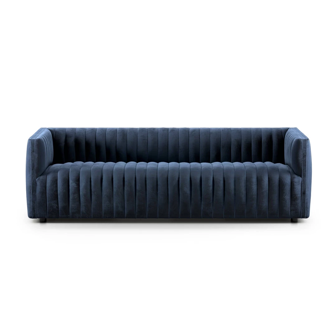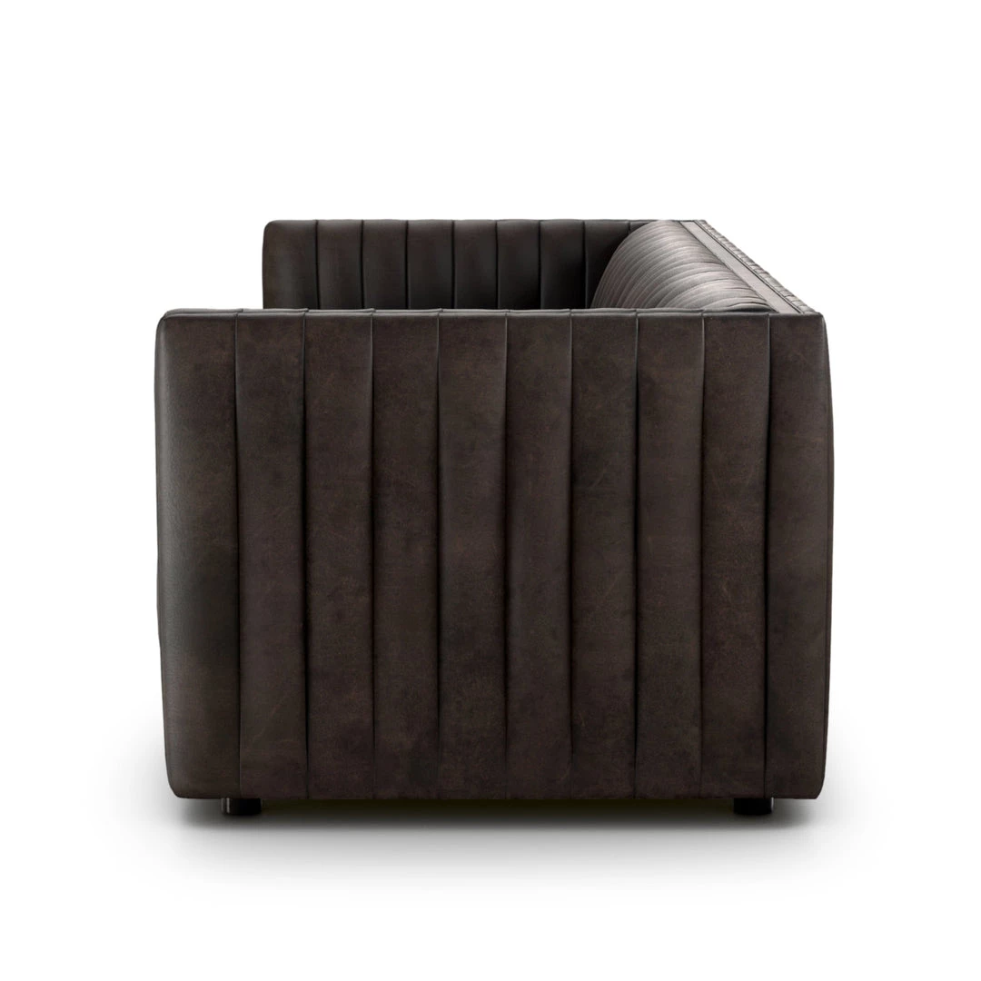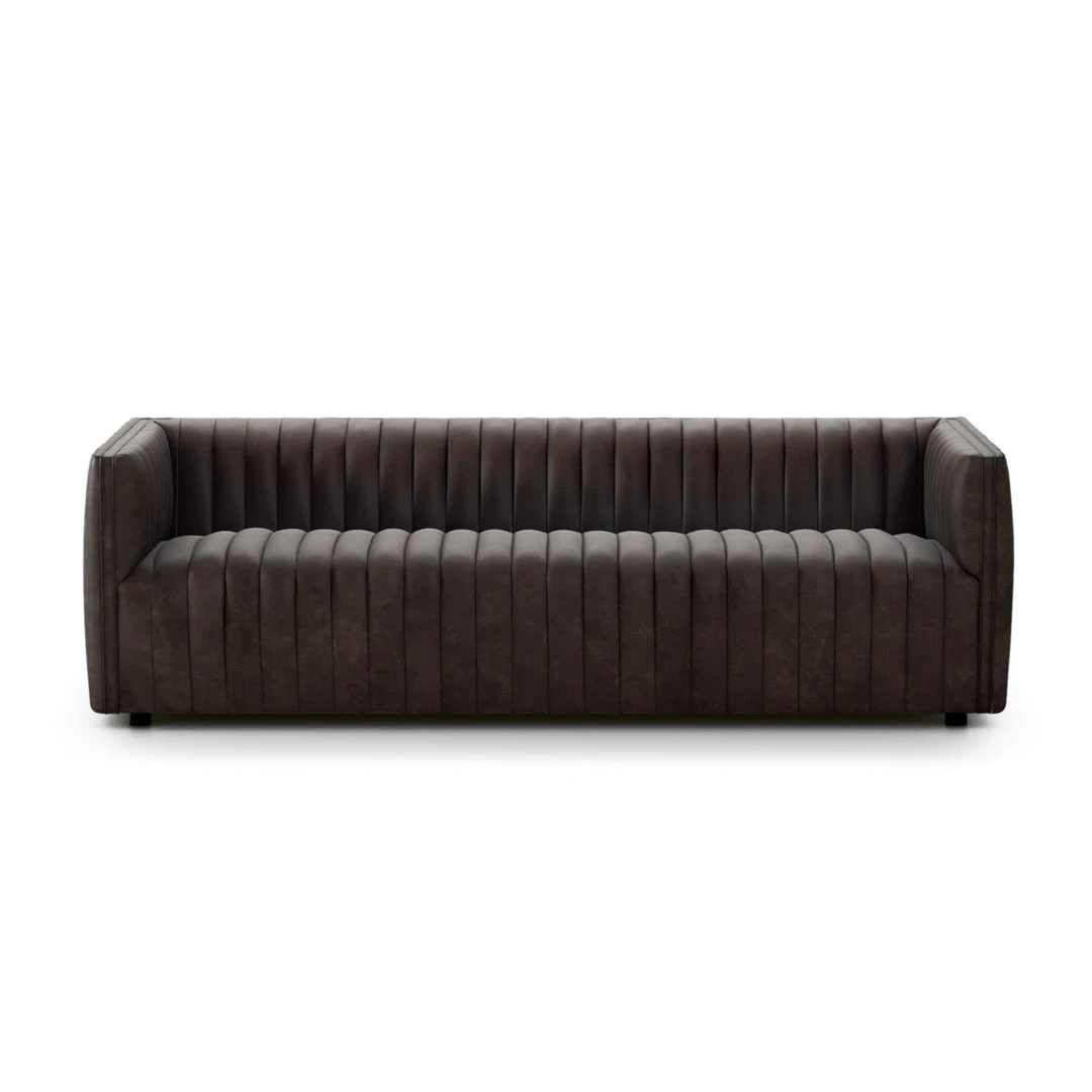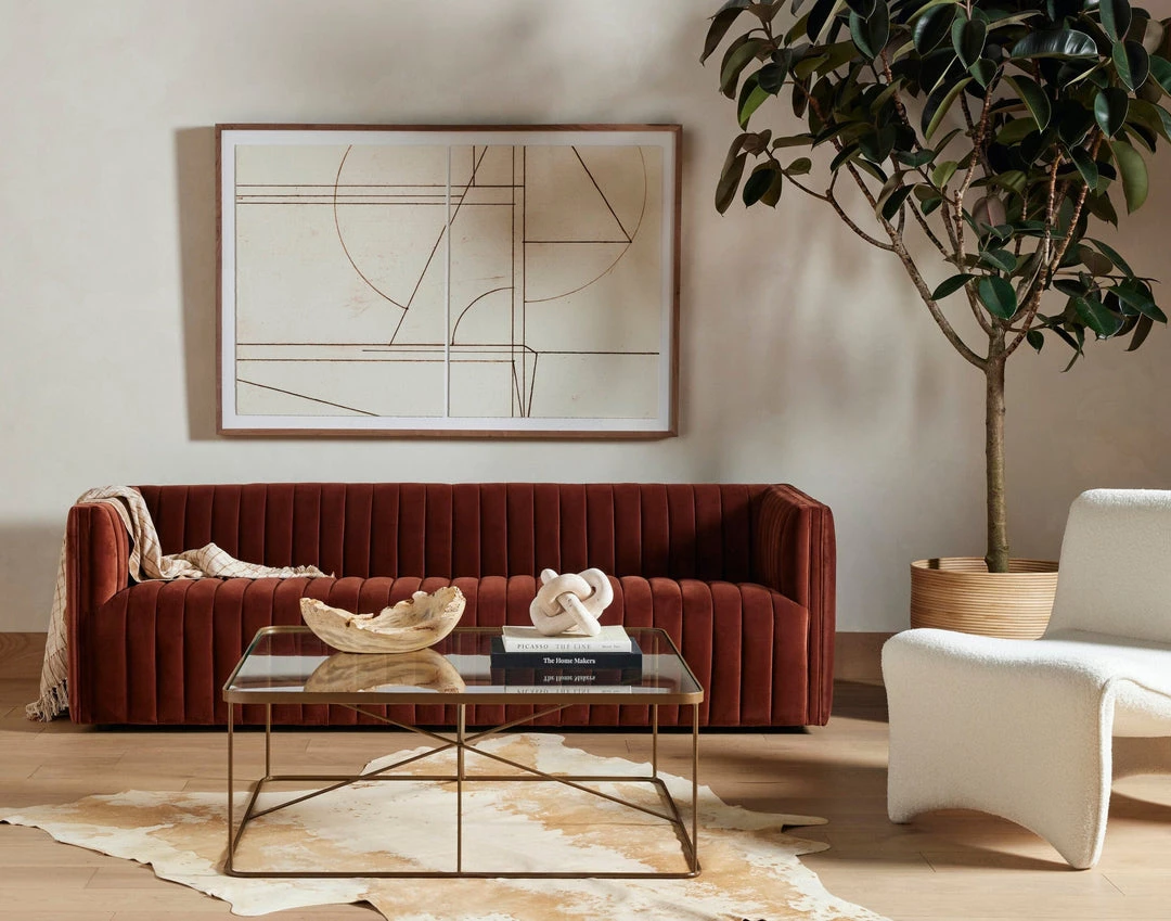 Velvety poly-blend in a rich auburn hue takes on dramatic channeling for trend-forward texture on this sumptuous seating.