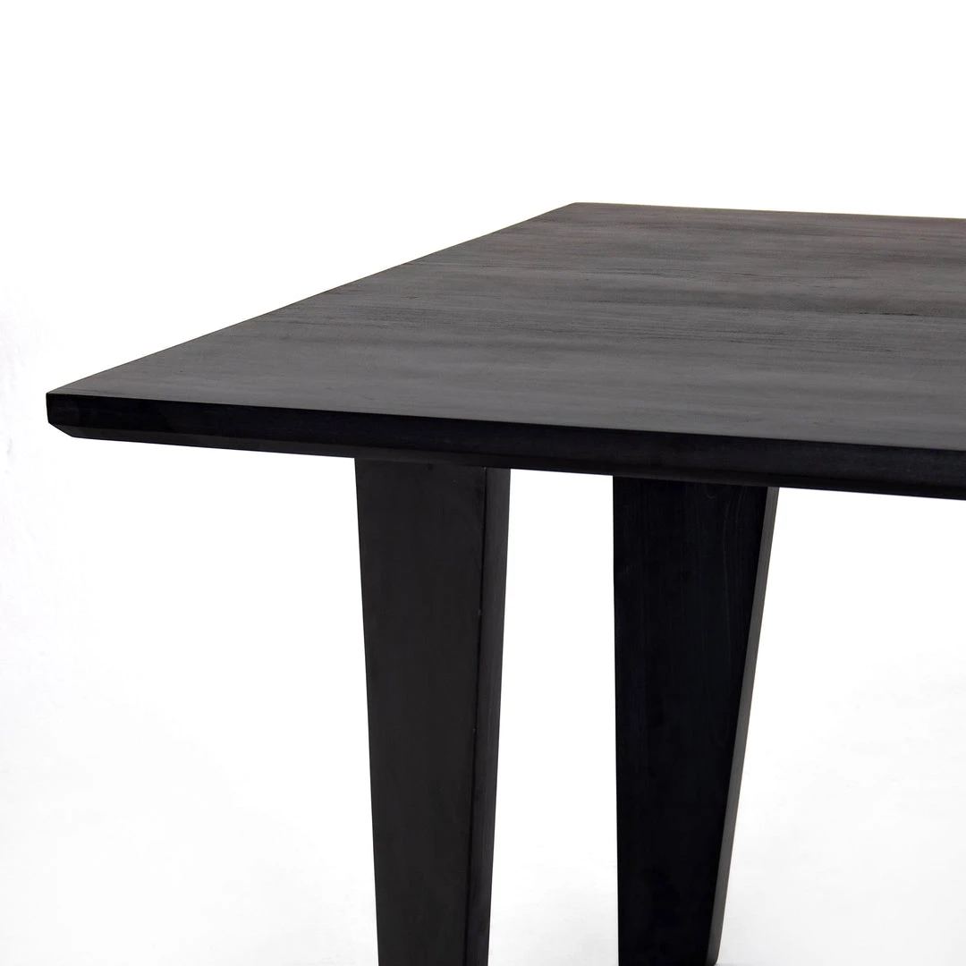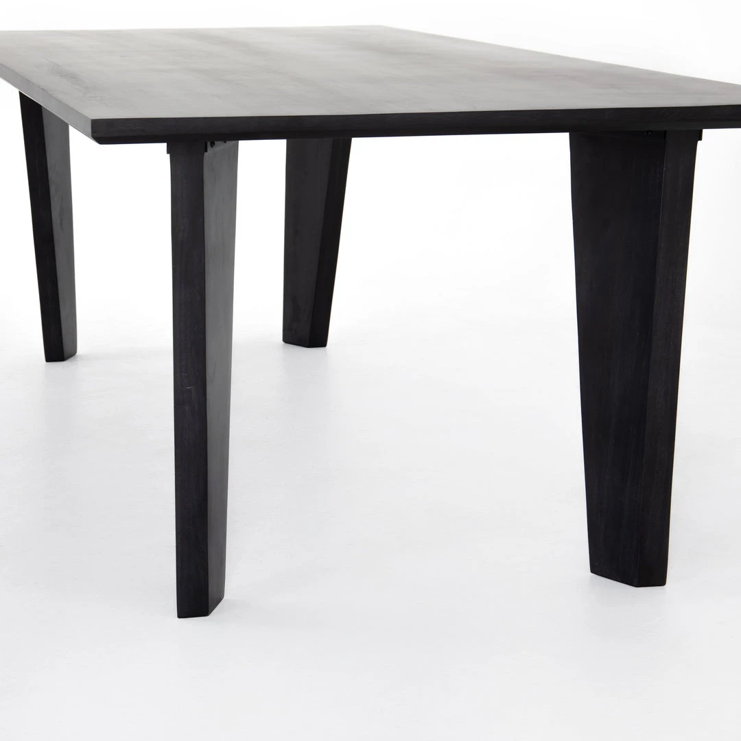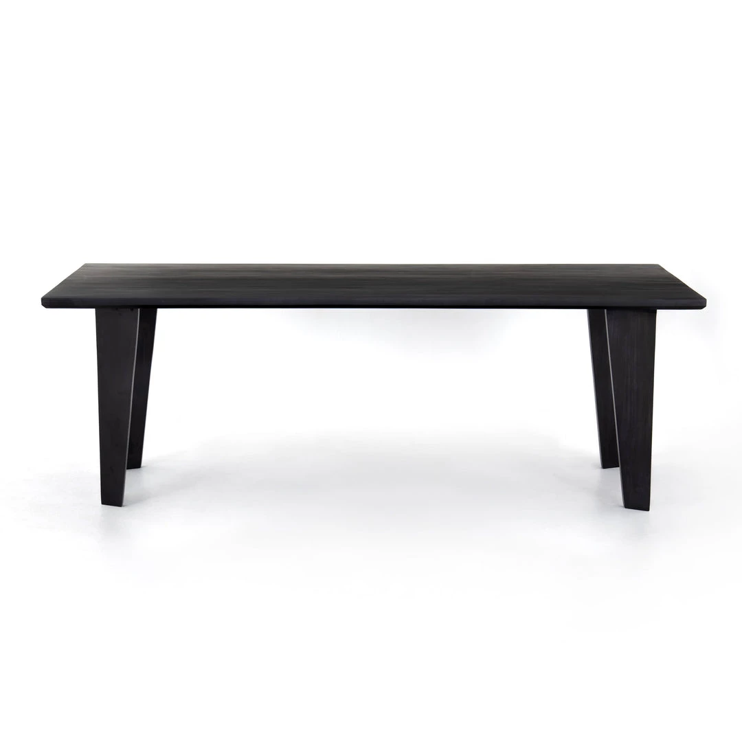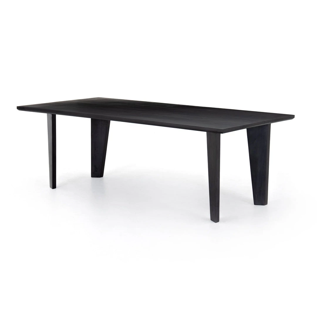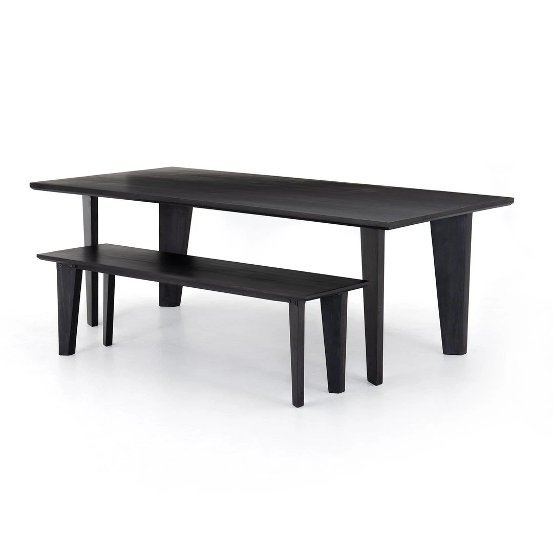 Solid, black-washed poplar forms a clean, linear-driven dining table with chamfered edging and square-tapered legs, each angled inward for a look of subtle movement. Option to pair with matching dining bench.