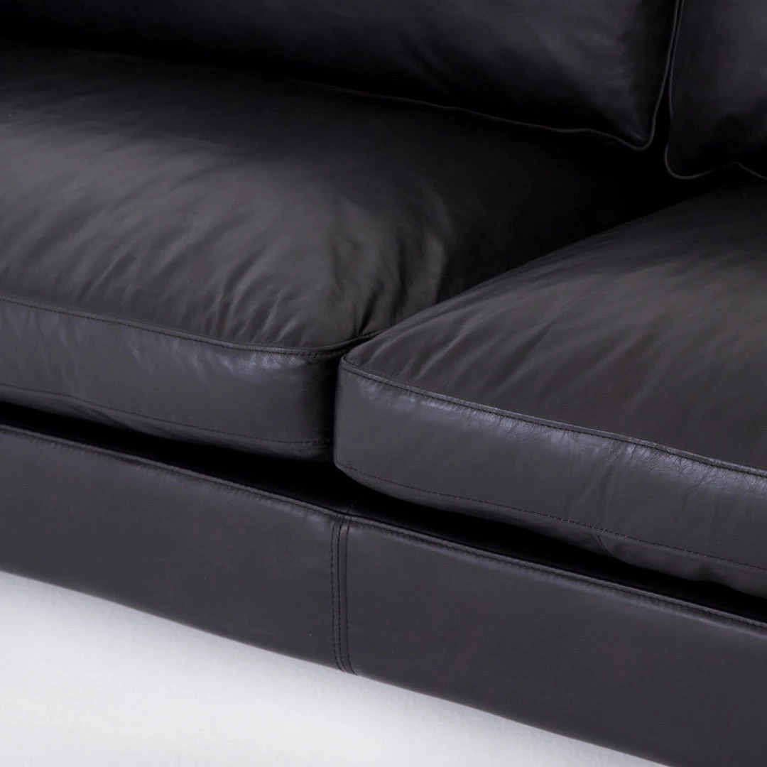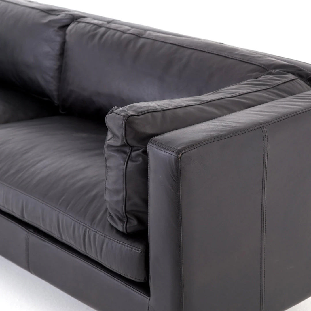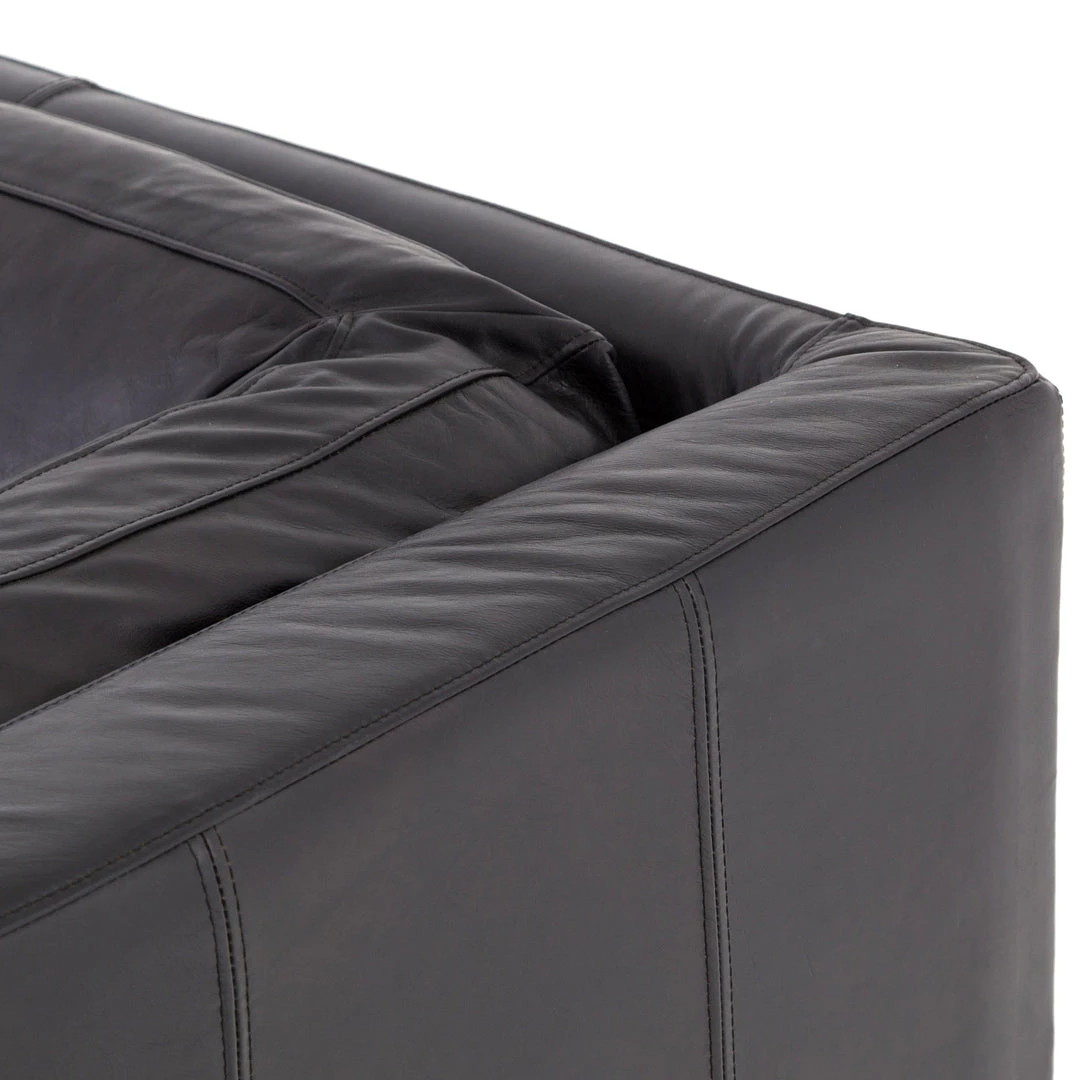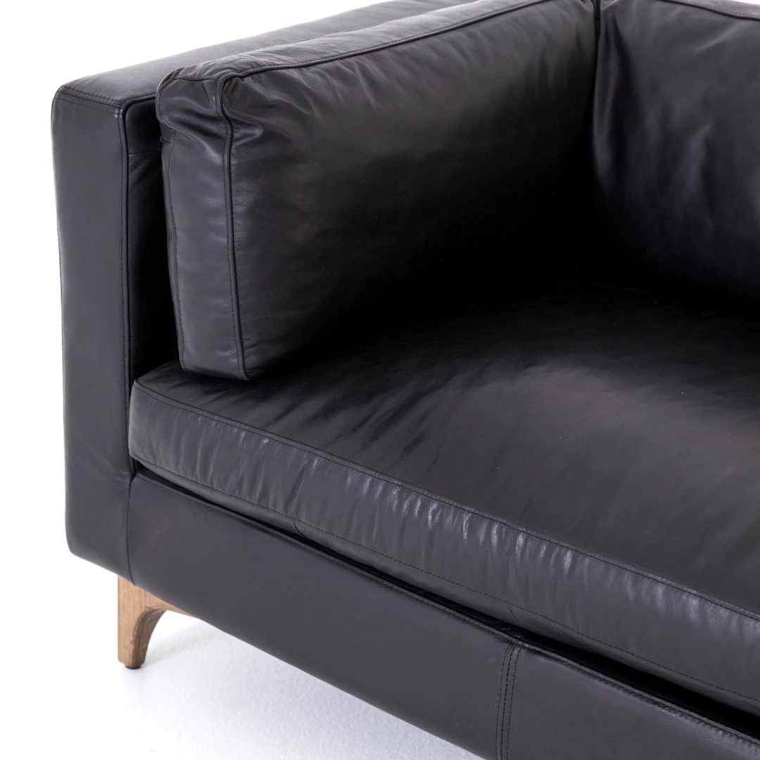 Mid-century modern undergoes a trend-forward refresh. Jet black top-grain leather offers a soft, buttery sit. Legs of weathered oak stay stout, allowing leather to stand front-and-center.