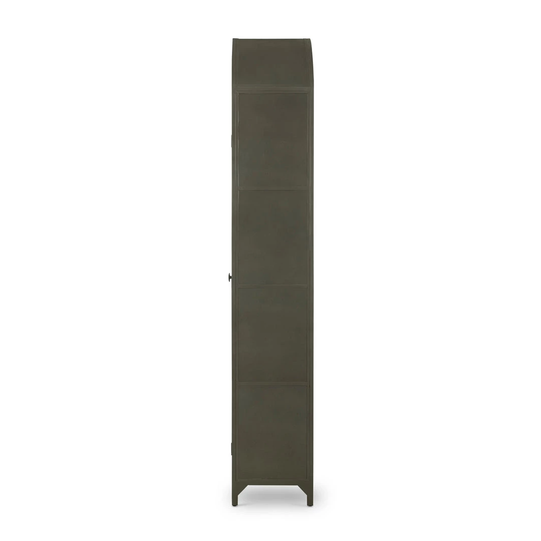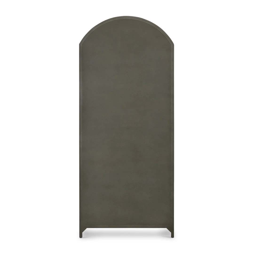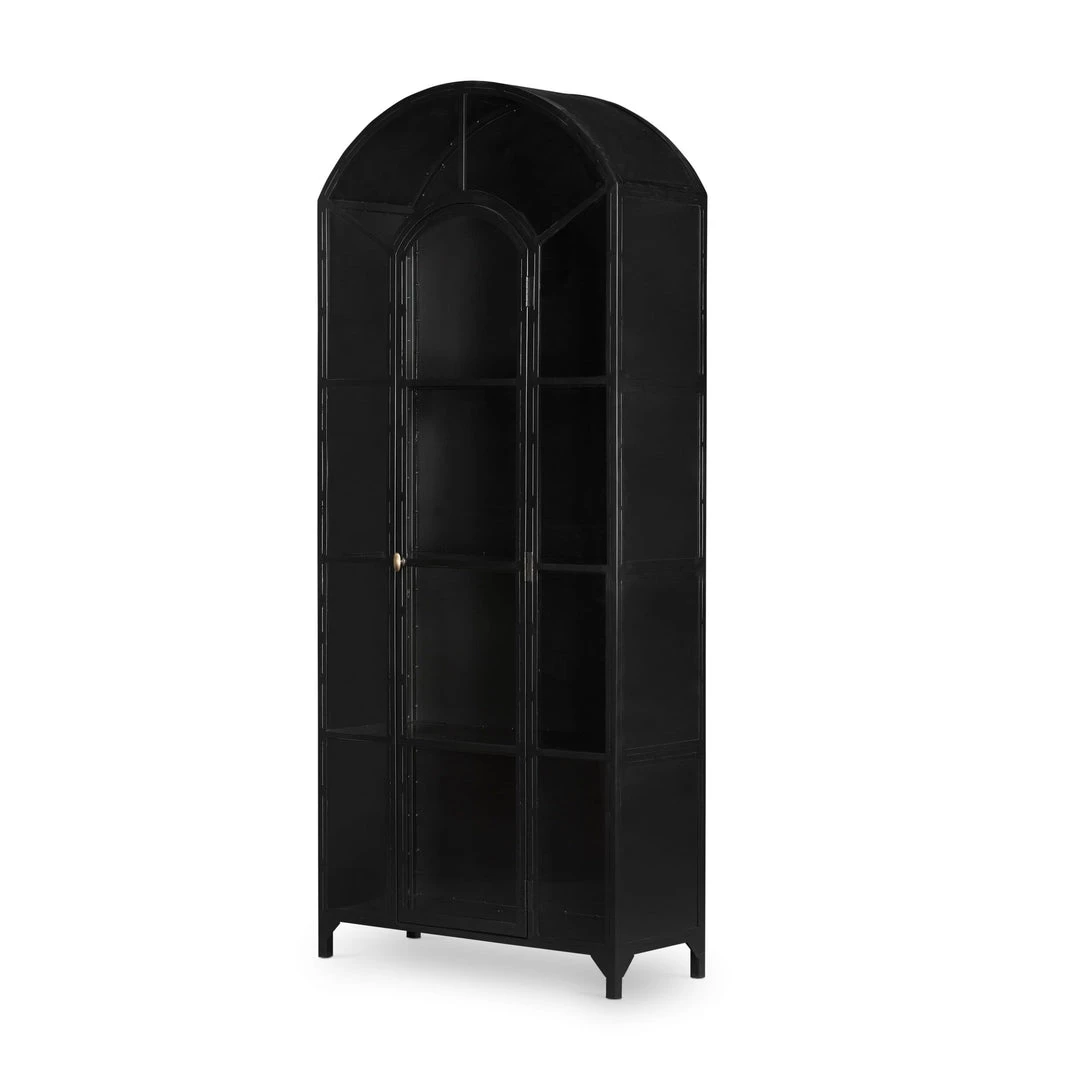 Display barware, books, or other treasures in an arch-topped cabinet. Solid iron sheeting is finished in soft, matte black with contrasting brass hardware.