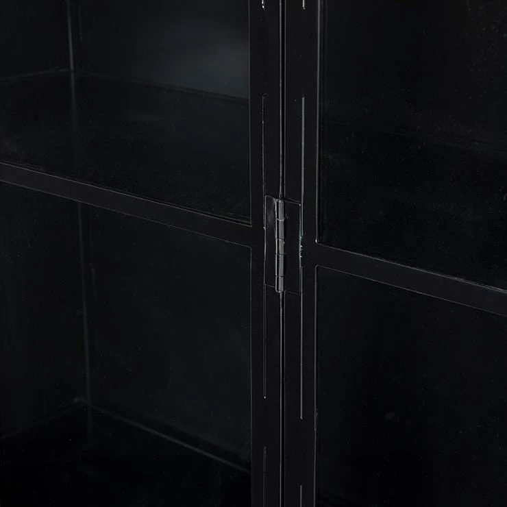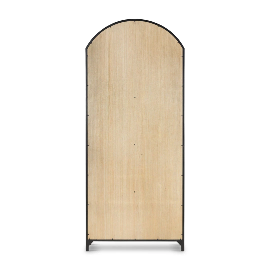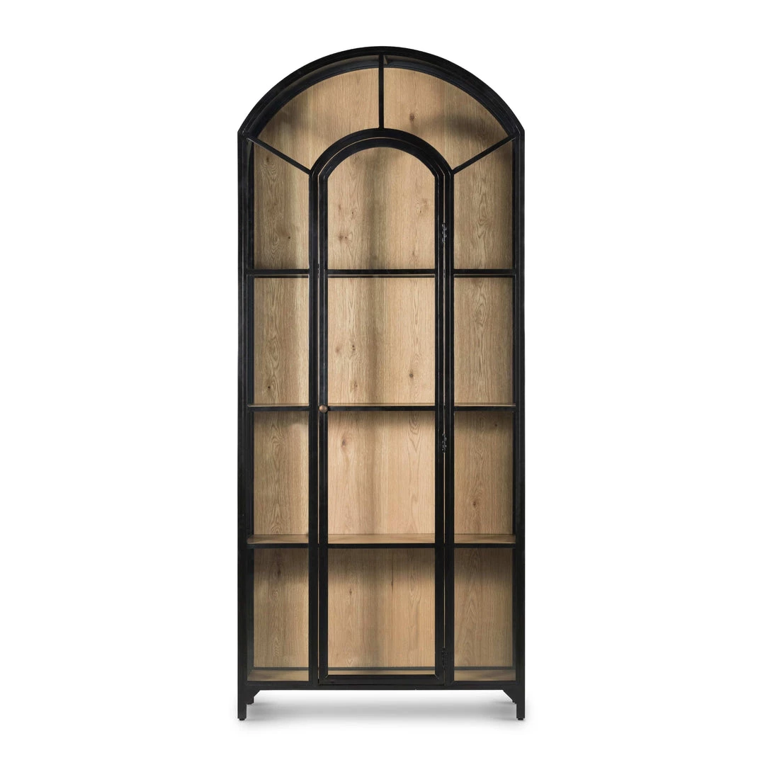 Display barware, books and keepsakes in beautifully arched cabinetry. Solid iron sheeting is finished in a soft, matte black with contrasting brass hardware. Glass fronts allow back paneling of light oak veneer to show, for an eye-catching contrast of color.