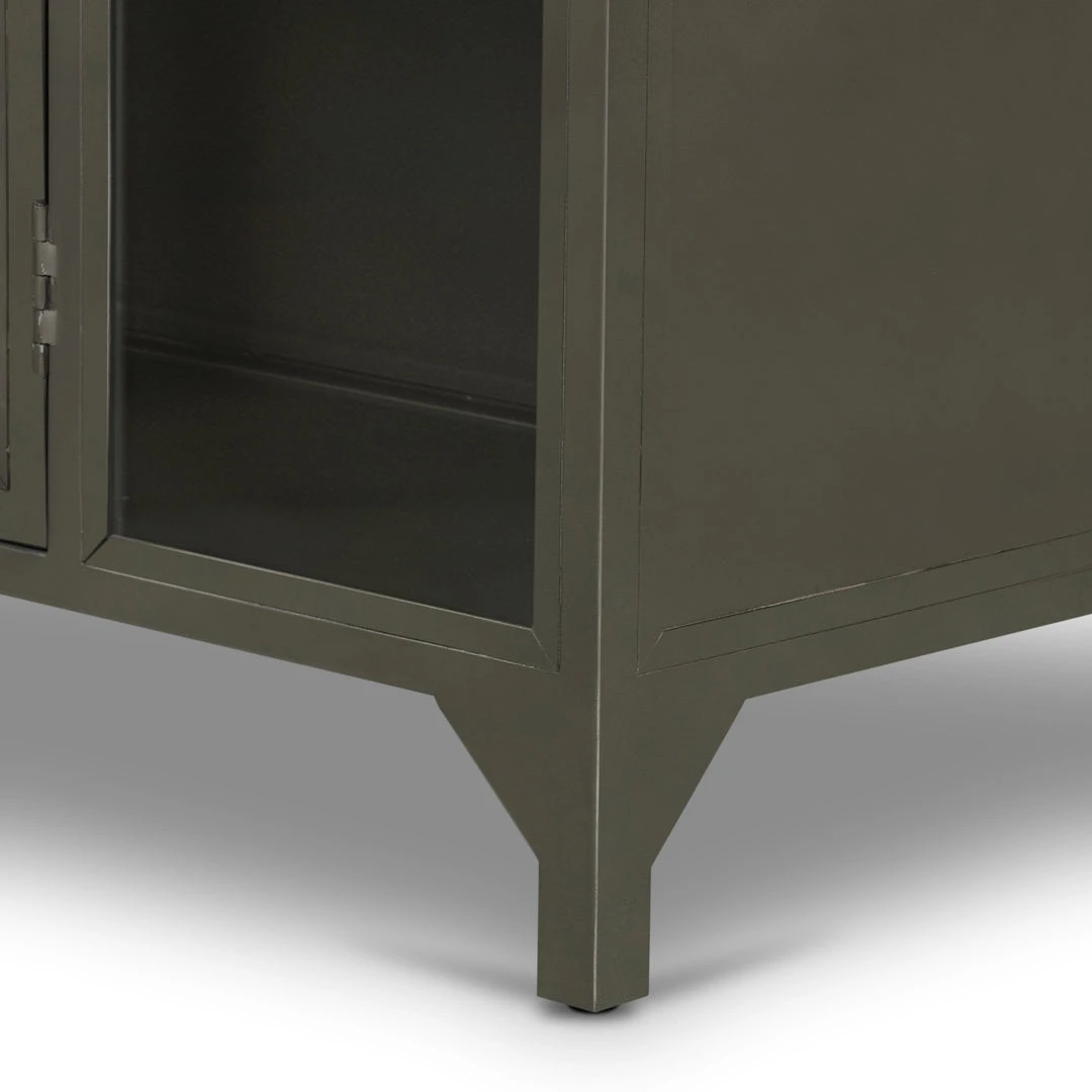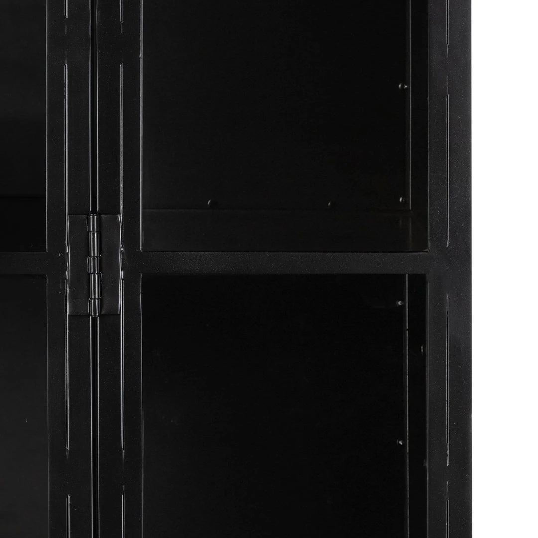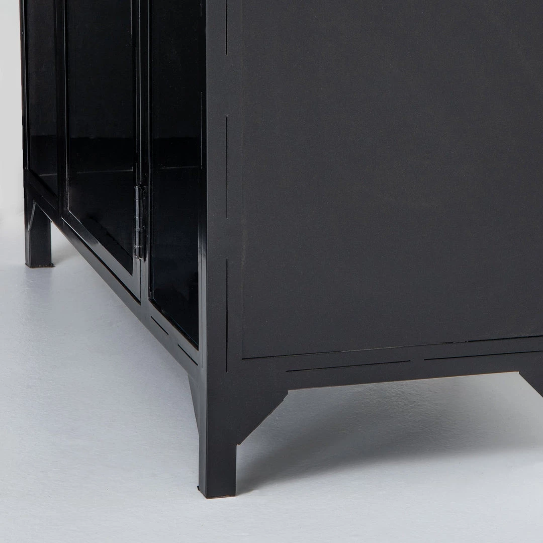 Display barware, books and keepsakes in beautifully arched cabinetry. Solid iron sheeting is finished in a soft, matte black with contrasting brass hardware. Glass fronts allow back paneling of light oak veneer to show, for an eye-catching contrast of color.