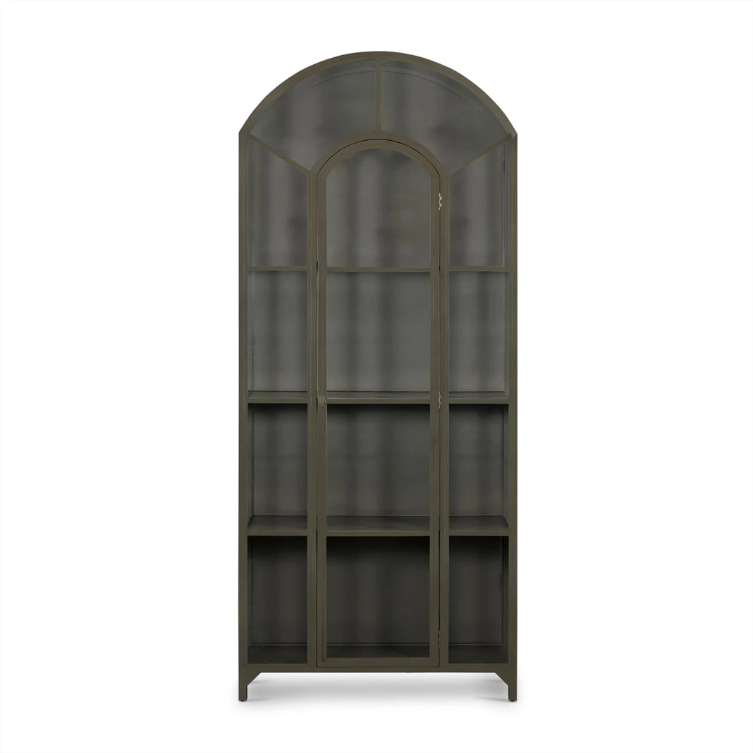 Display barware, books and other treasures in beautifully arched cabinetry. Solid iron sheeting is finished in a modern gunmetal with clear glass fronts.