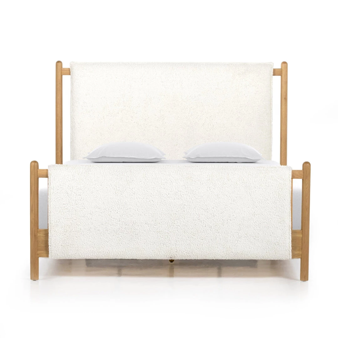 Bring a cozy hygge vibe to the bedroom. Framed by light-finished solid oak, a sling-style bed features faux shearling head and foot boards, for welcoming warmth and trend-forward texture alike.