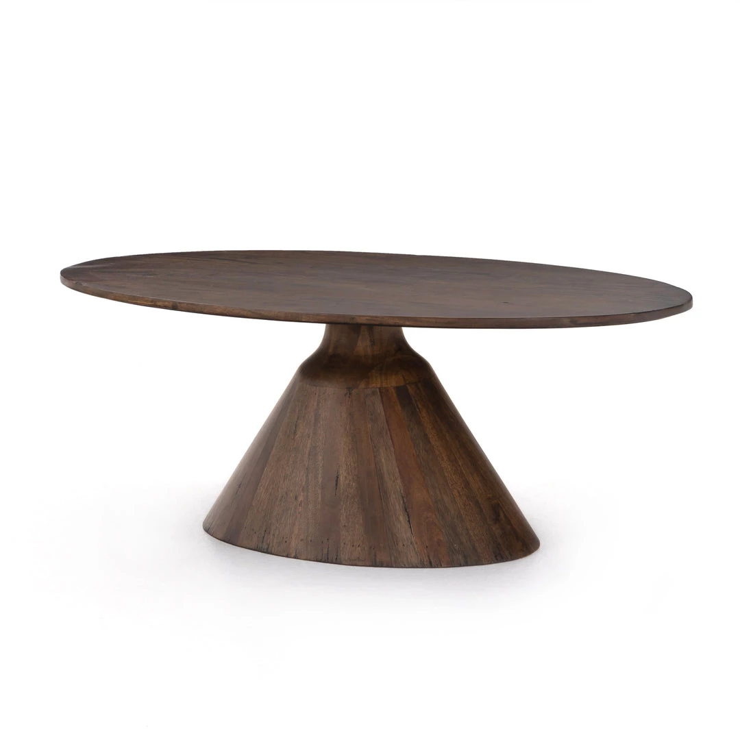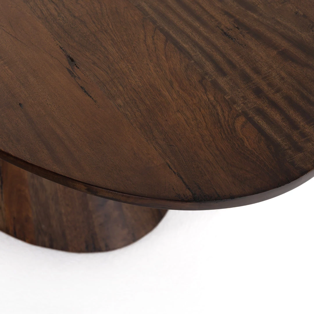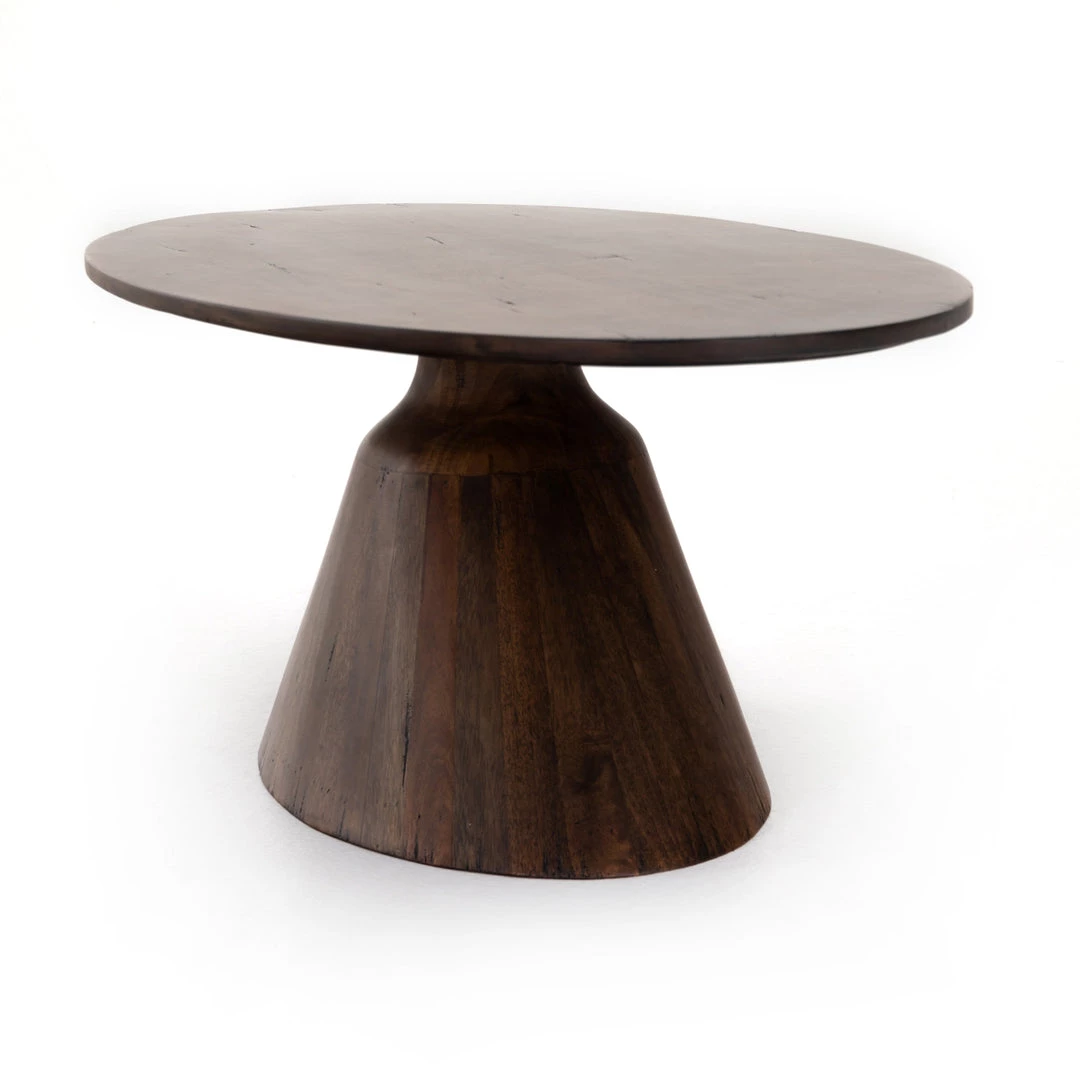 Organically shaped pedestal table takes aesthetic cues from nature. Character-rich knots and grains innate to India-sourced reclaimed woods are retained for display on a dramatically tapered base, then smoothed across the table top for a modern feel.