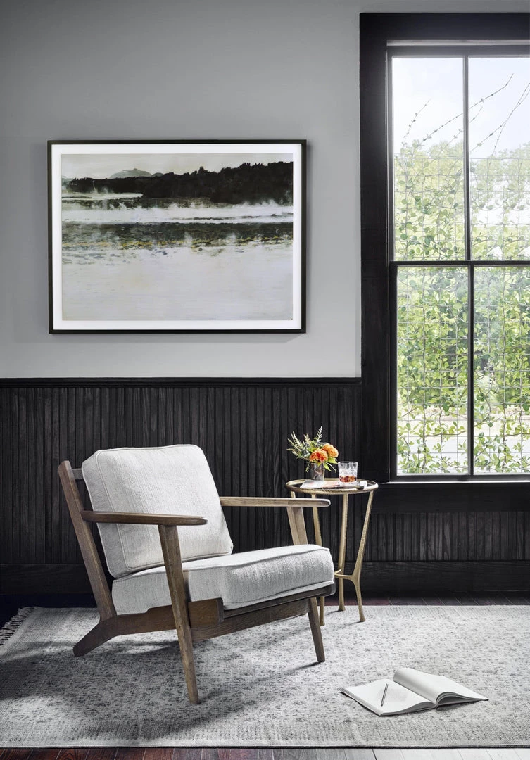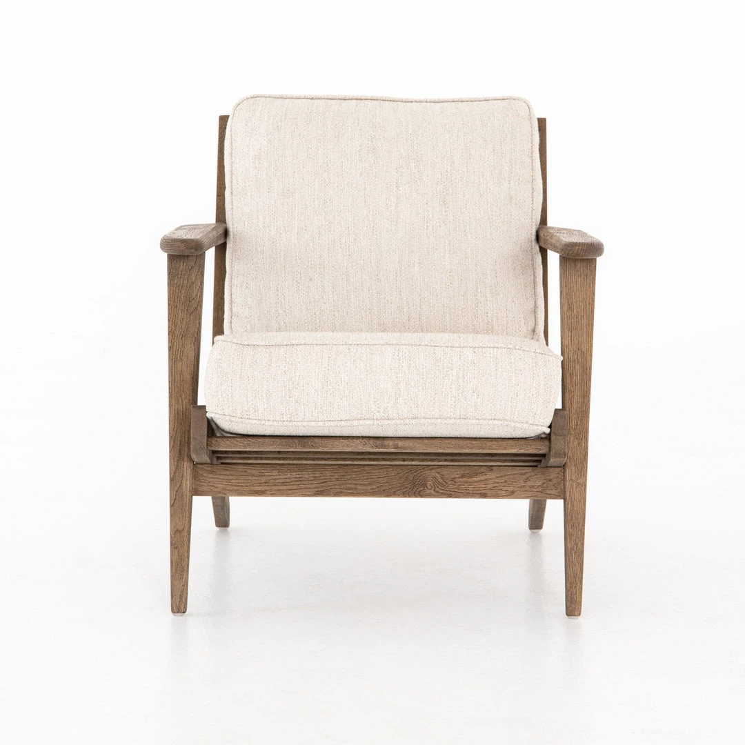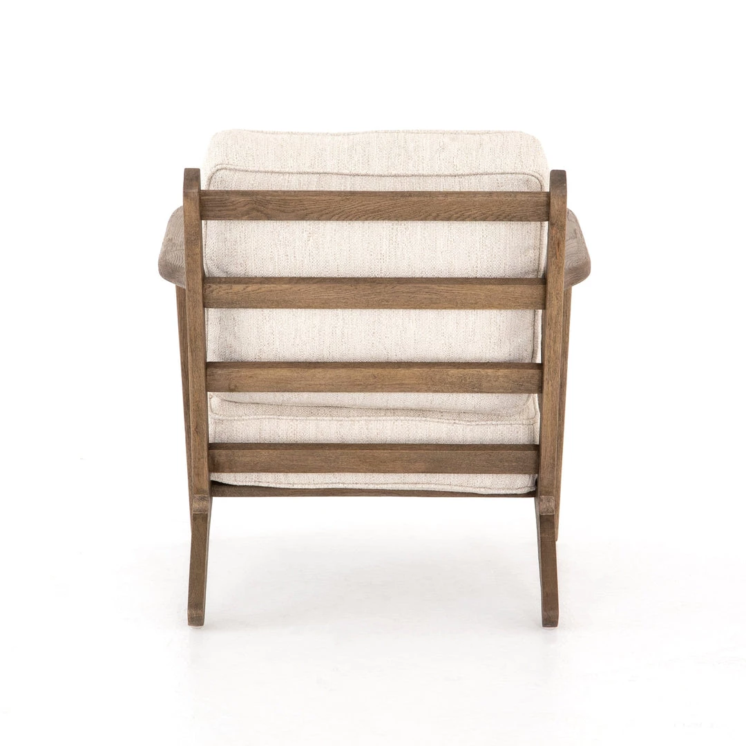 A fresh take on the classic Adirondack emphasizes comfort with thick, neutral cushioning. Wire-brushed oak is finished in a honey grey and hand-distressed for a naturally weathered patina.