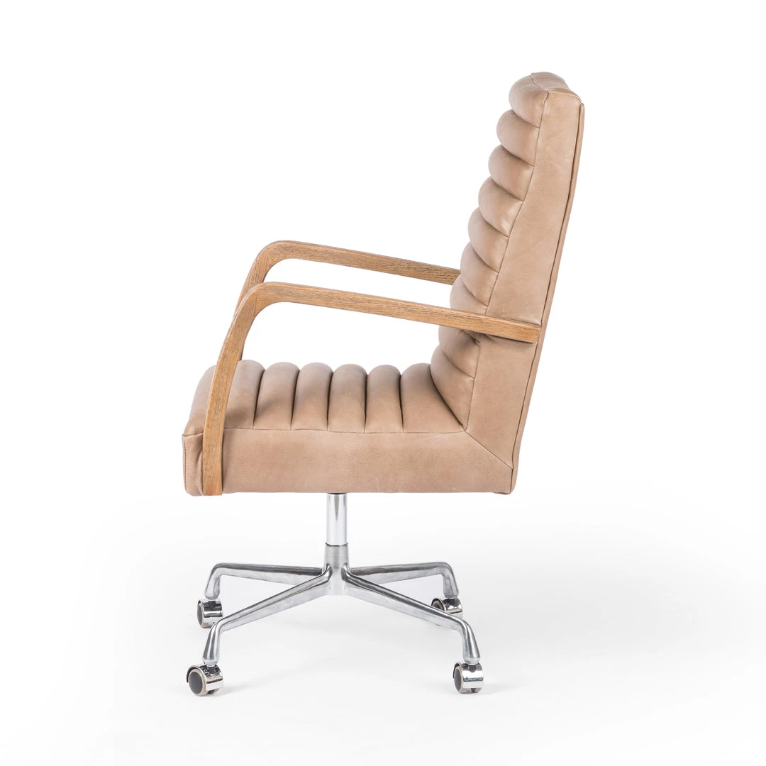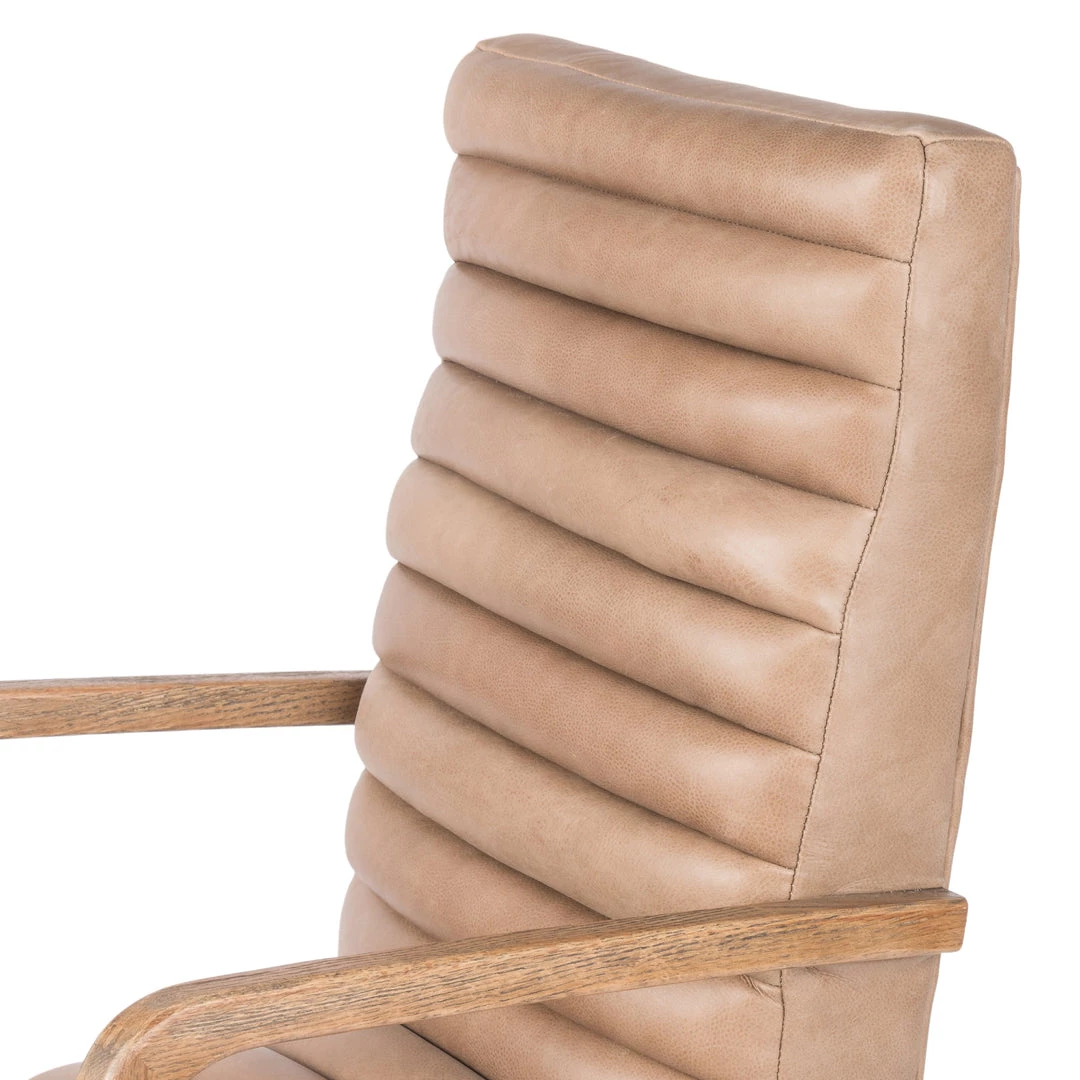 High style. Light tan top-grain leather covers a sculpted seat and back, with elegantly arched arms of solid oak. Stainless steel casters make for ease in the modern workplace. Height not adjustable.