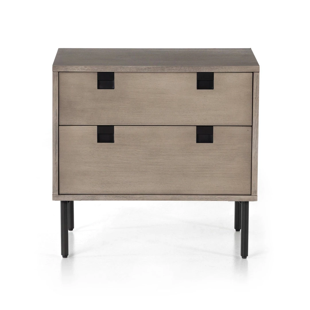 A clean, cubed shape brings a structured-yet-light look to bedside storage, with dual drawers of grey-washed acacia veneer perched atop iron legs finished in an antique bronze. Great solo, even better in pairs.