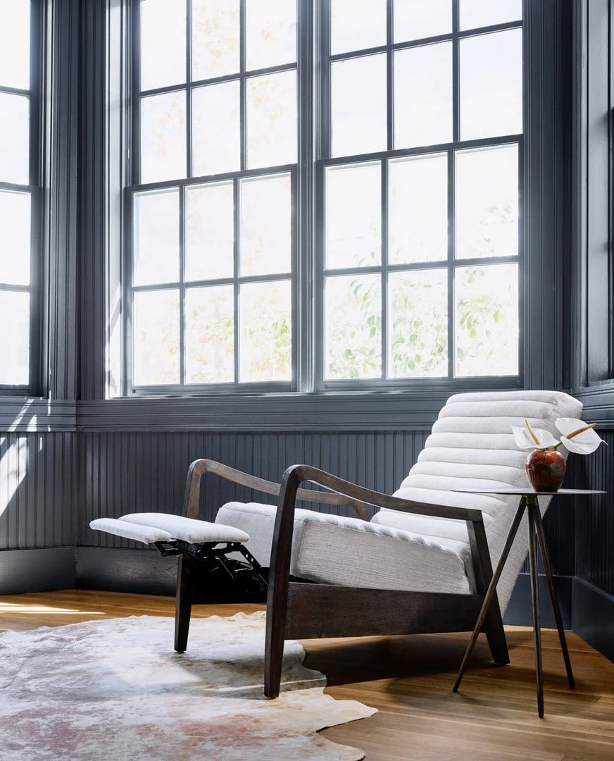 A dramatically shaped mid-century frame, modernized by channel tufting. Black top-grain leather contrasts with natural parawood, for a clean, cool look with vintage airs. A push recliner takes this forward-thinking lounger to the next level.