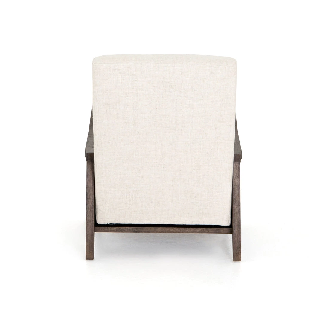A dramatically shaped mid-century frame meets with on-trend channel tufting. Pale, neutral upholstery contrasts with dark sienna brown parawood. A push recliner takes this forward-thinking lounger to the next level.