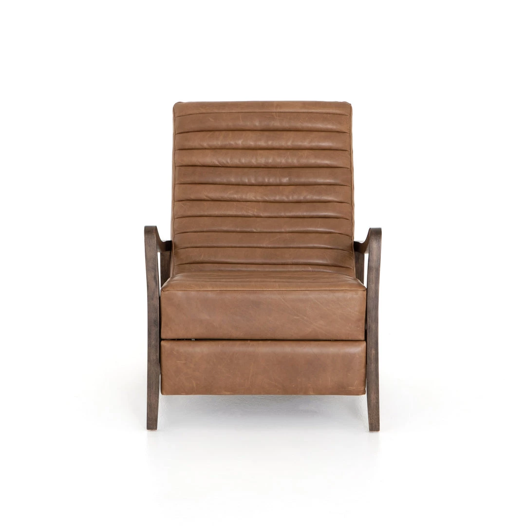 Invitingly curved seat with dramatic horizontal channels is covered in soft, camel-colored top-grain leather. Rich, tonal frame captures alluring negative—and positive—spaces. A push recliner takes this forward-thinking lounger to the next level.