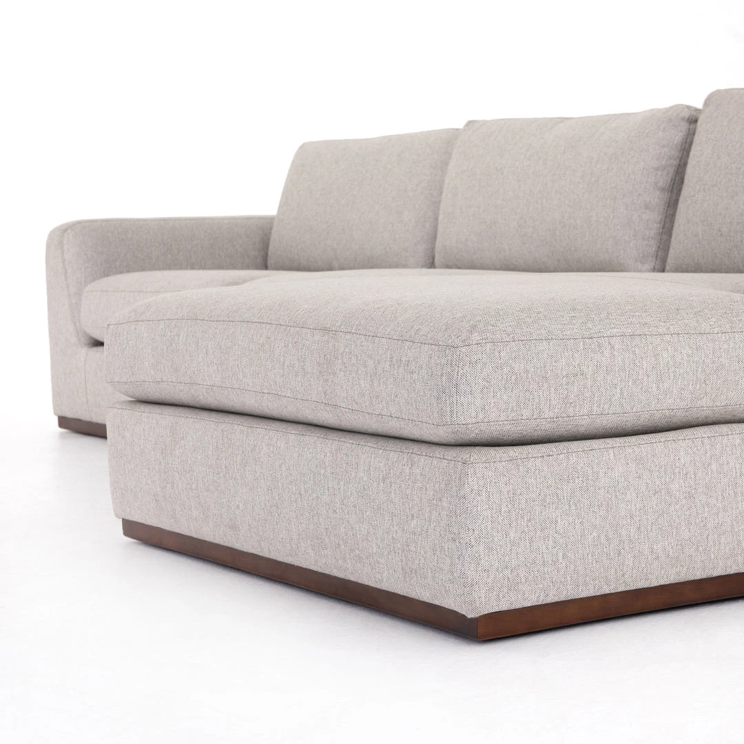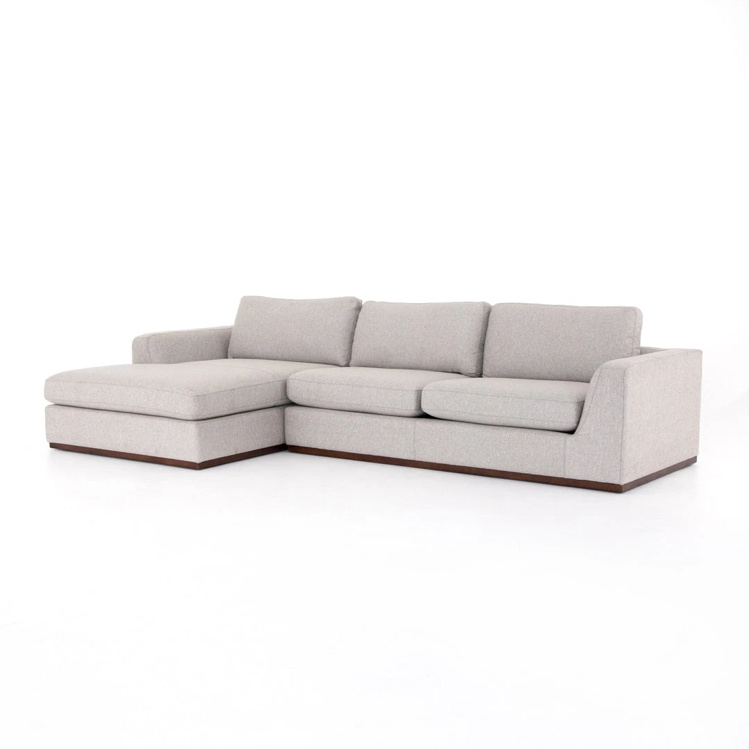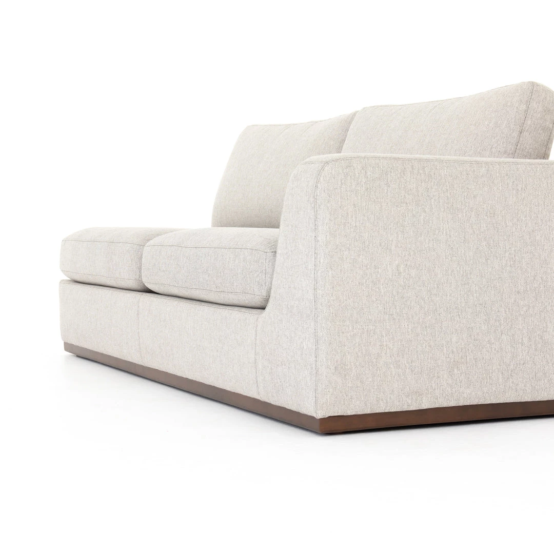 Simply styled for everyday lounging. A textural poly/linen blend covering is made for comfort, with subtly flared sides for shapely effect and a wrapped plinth base. Left arm facing piece to matching sectional.