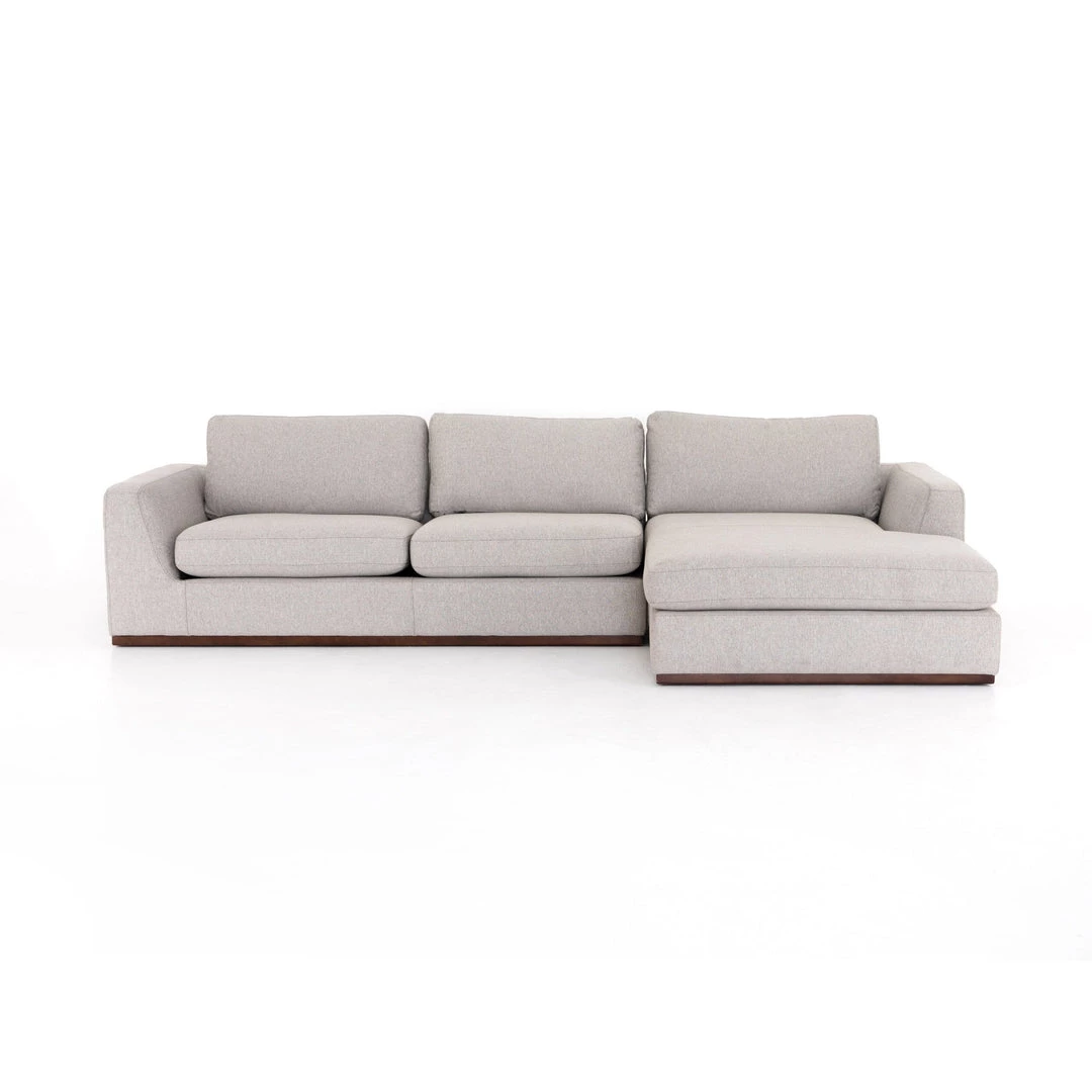 Simply styled for everyday lounging. A textural poly/linen blend covering is made for comfort, with subtly flared sides for shapely effect and a wrapped plinth base. Right arm facing piece to matching sectional.