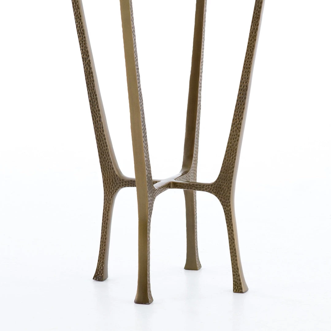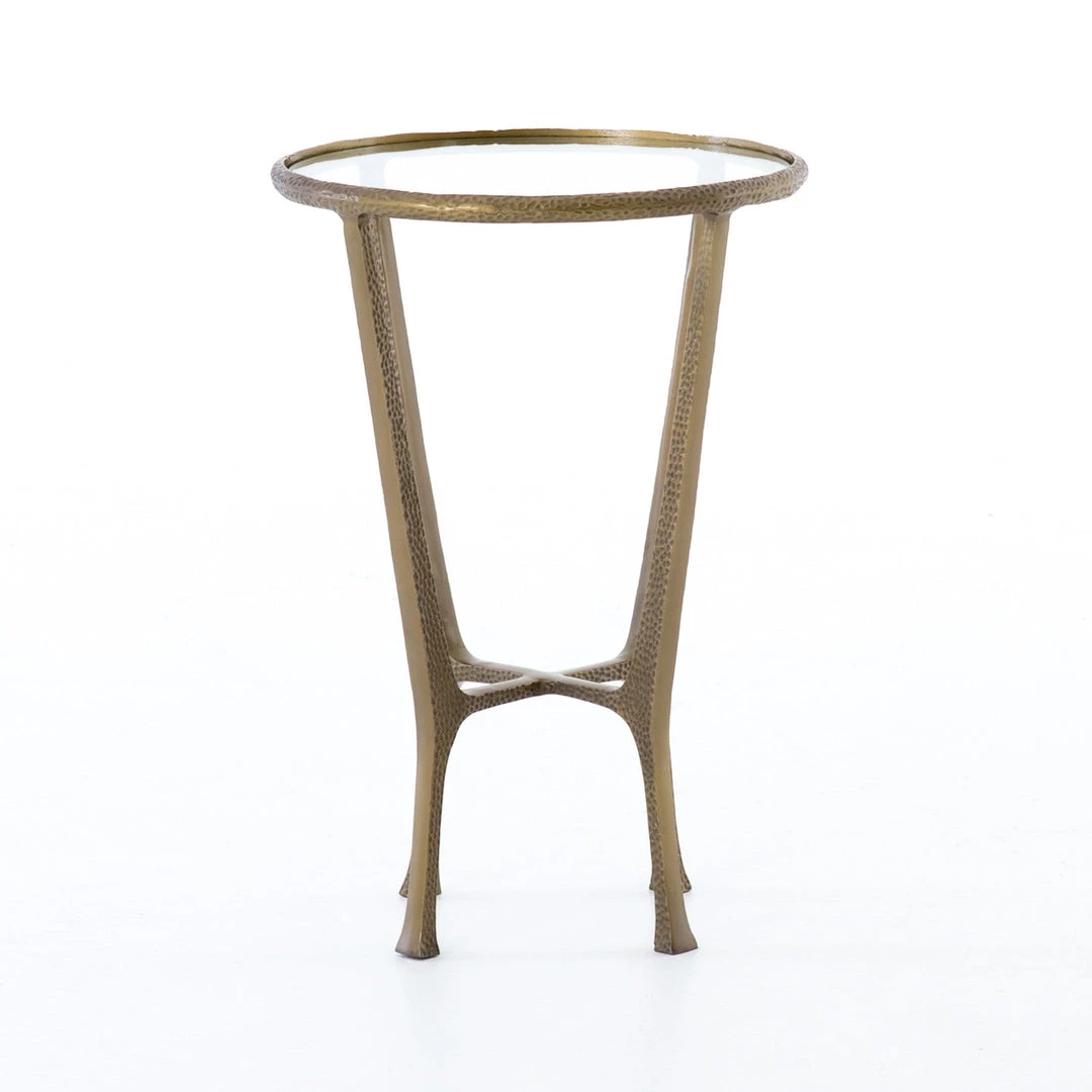 A minimalist design adopts fresh depth via structural spirit. An aged brass finish lends a vintage note to open-styled aluminum. A tempered glass tabletop rounds, bringing a touch of softness to the forward-thinking end table.