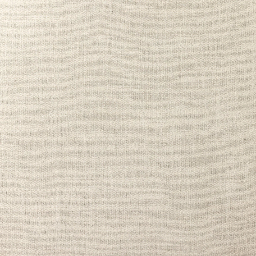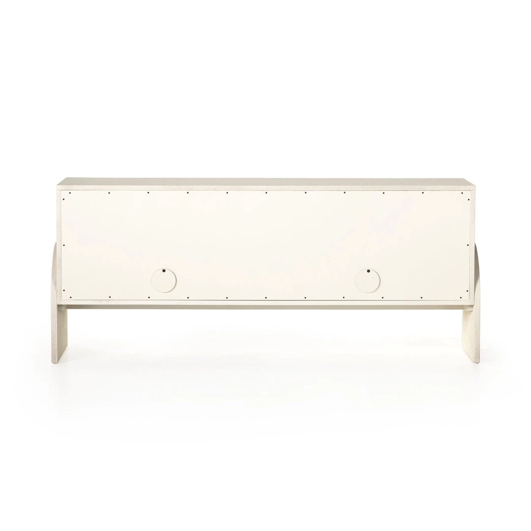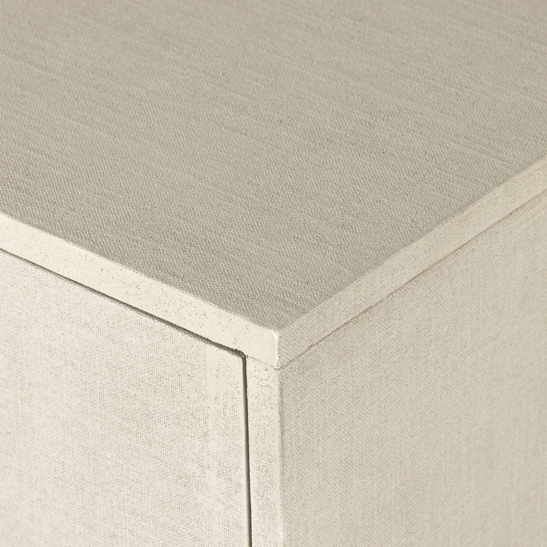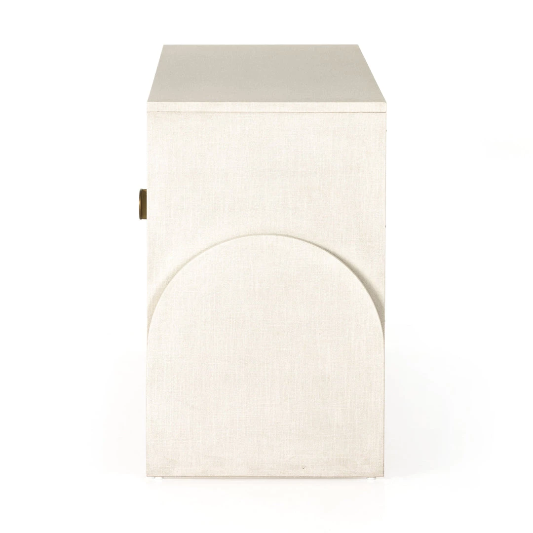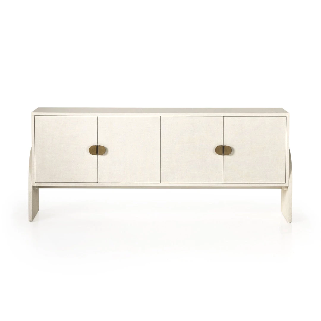 Talk about novelty. Made from painted linen in a light ivory, arched legs soften otherwise clean, modern shaping. Finished in an antique brass, half-moon iron hardware completes the look. Dual rear cutouts for cord management.