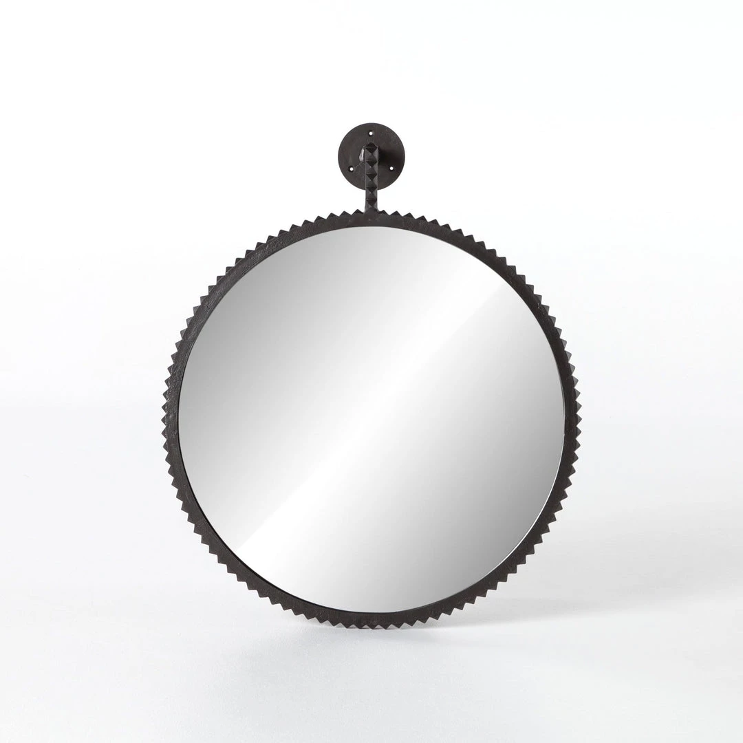 Cast aluminum feels “carved” and is finished in aged bronze to artfully frame a round mirror. Perfectly sized for bathroom or living room spaces.