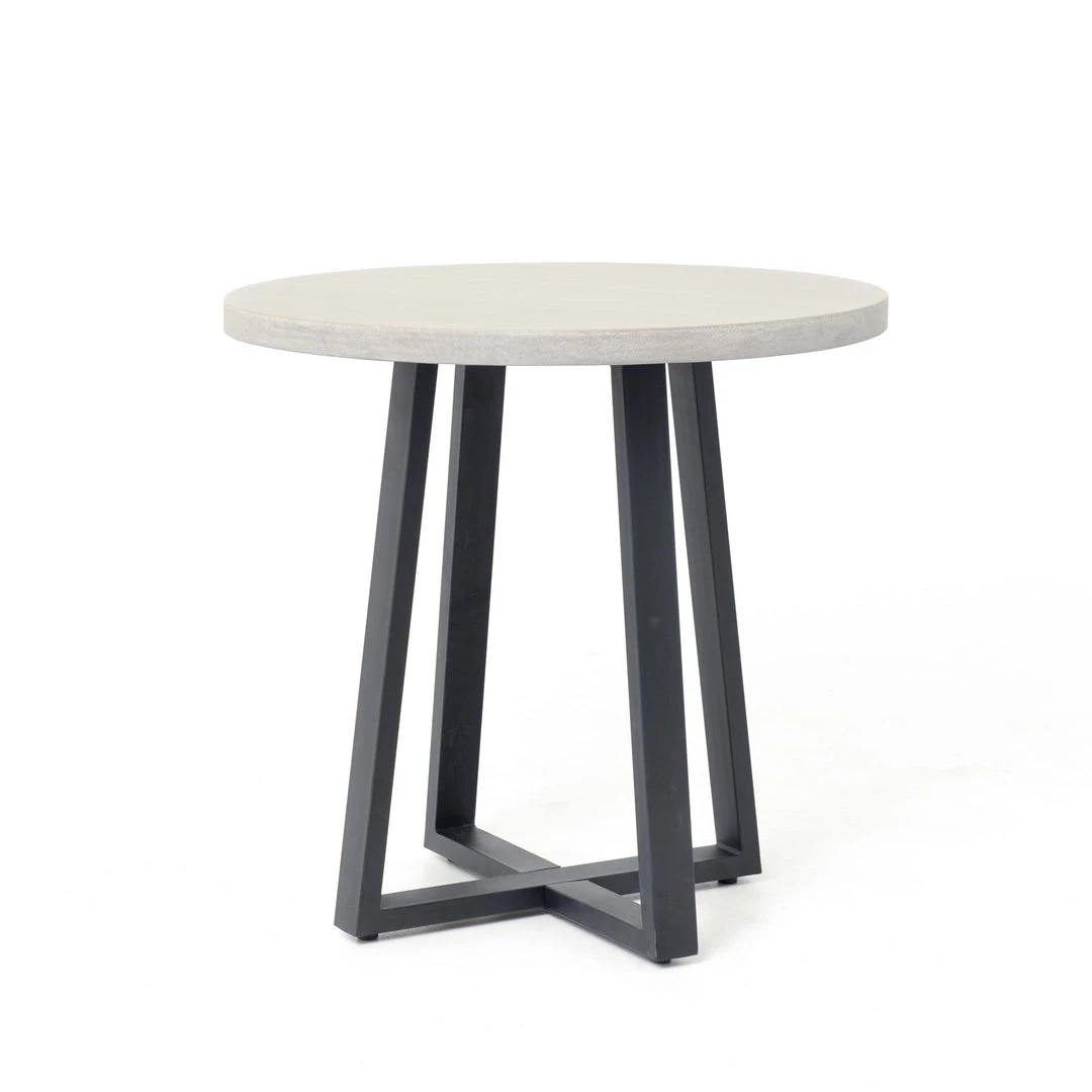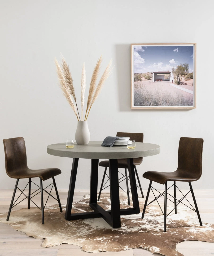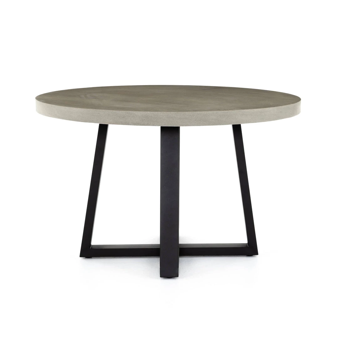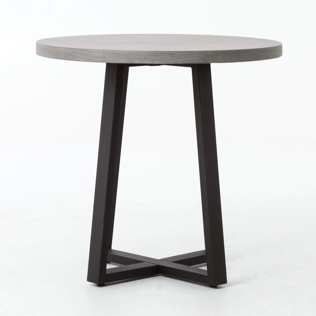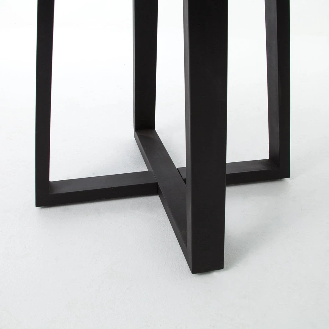 A strikingly simple poly-resin top derived from river sand is polished to a smooth sheen. An angled, matte black iron base adds architectural appeal to this small-scale dining table. Slight color variance is to be expected, and speaks to lava stone’s organic nature. Cover or store indoors during inclement weather and when not in use.