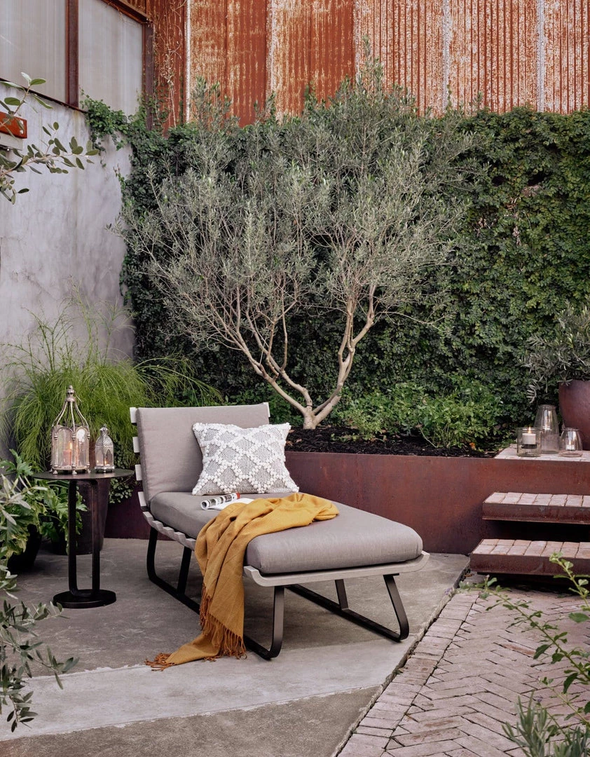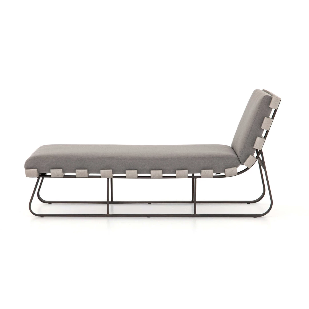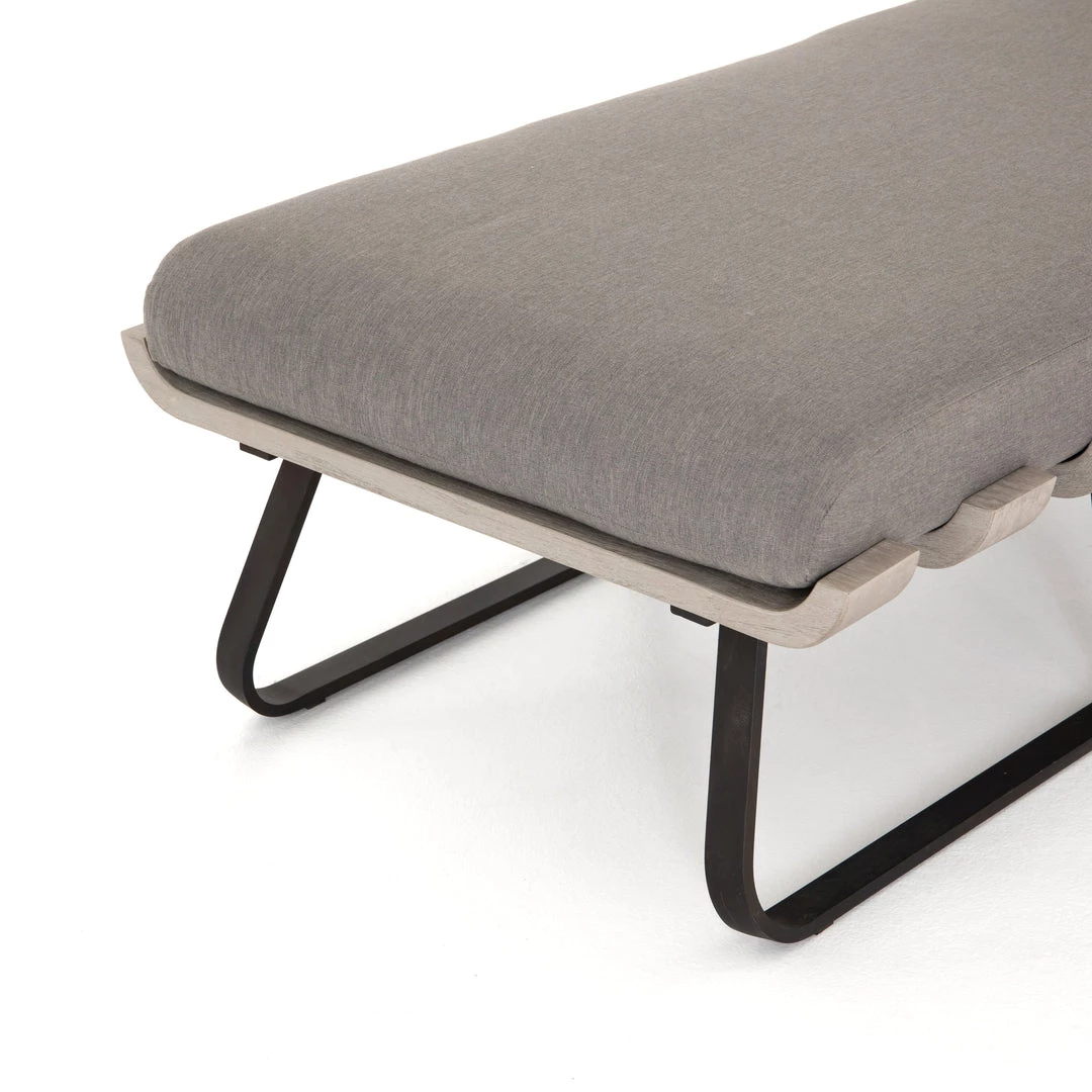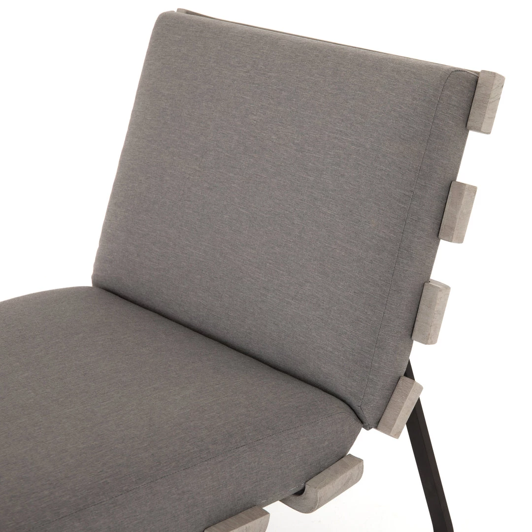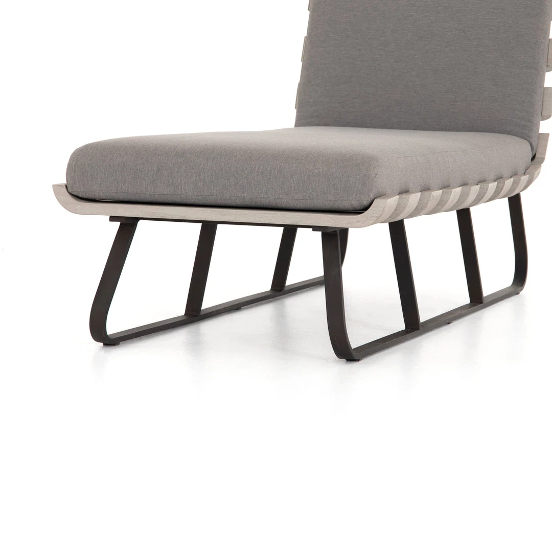 A slatted frame of weathered grey teak supports spacious lounge-style seating in an charcoal. Bronze-finished legs add a modern finishing touch. Cover or store indoors during inclement weather and when not in use.