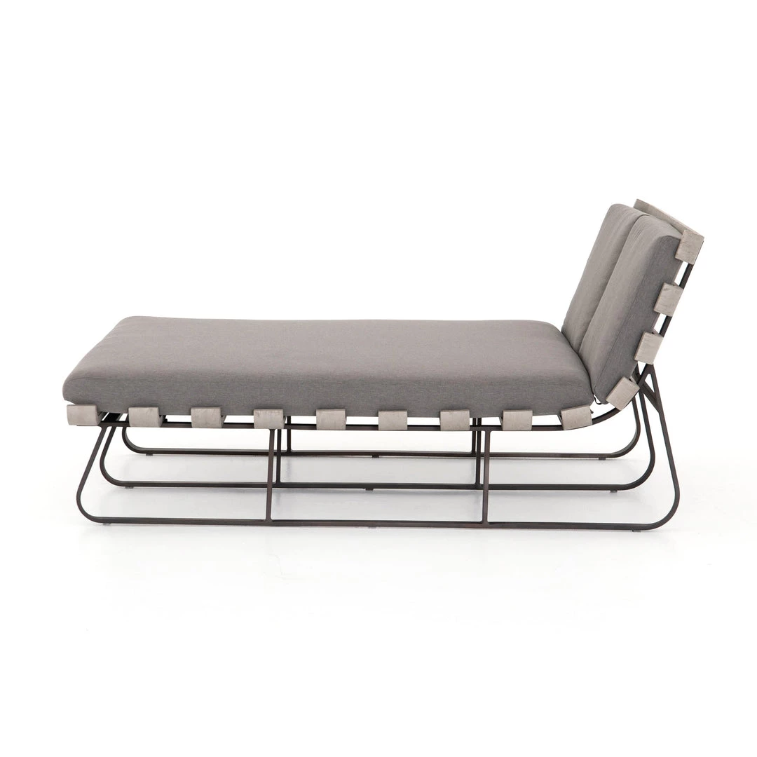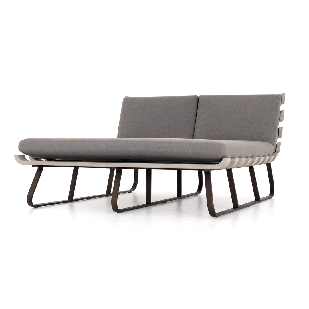Room for two. A slatted frame of weathered grey teak supports daybed-style seating in an inviting charcoal. Bronze-finished legs add a modern finishing touch. Cover or store indoors during inclement weather and when not in use.