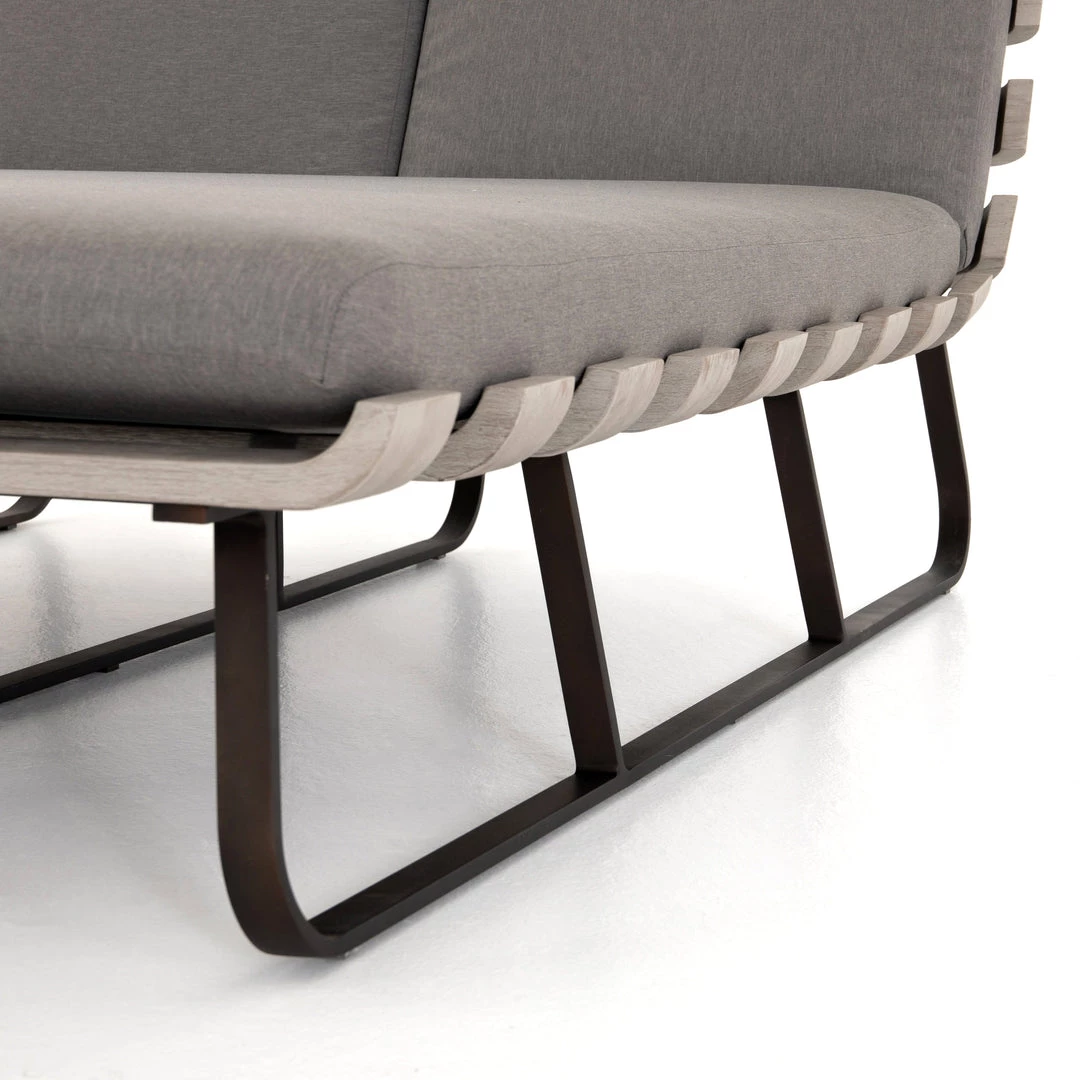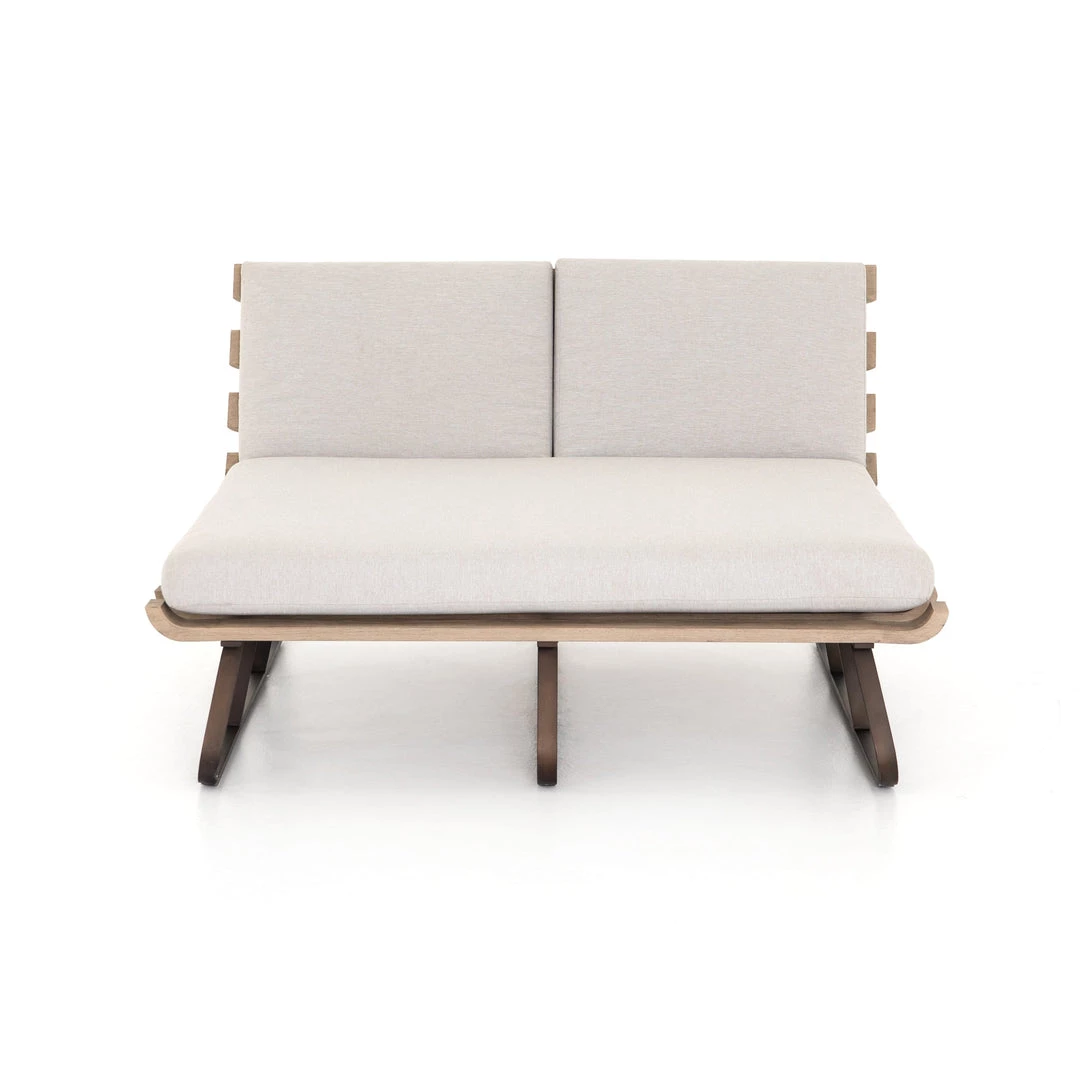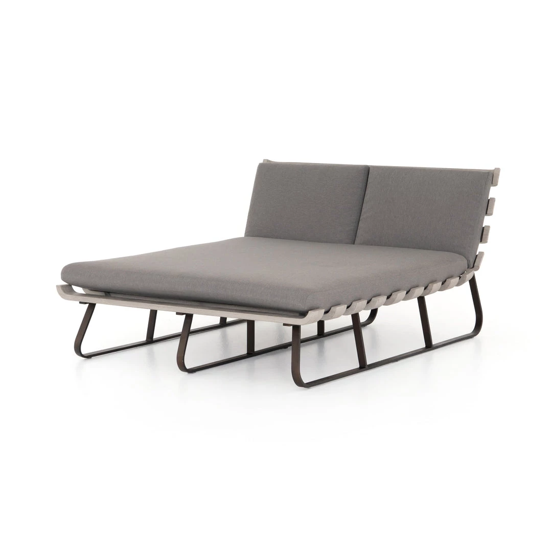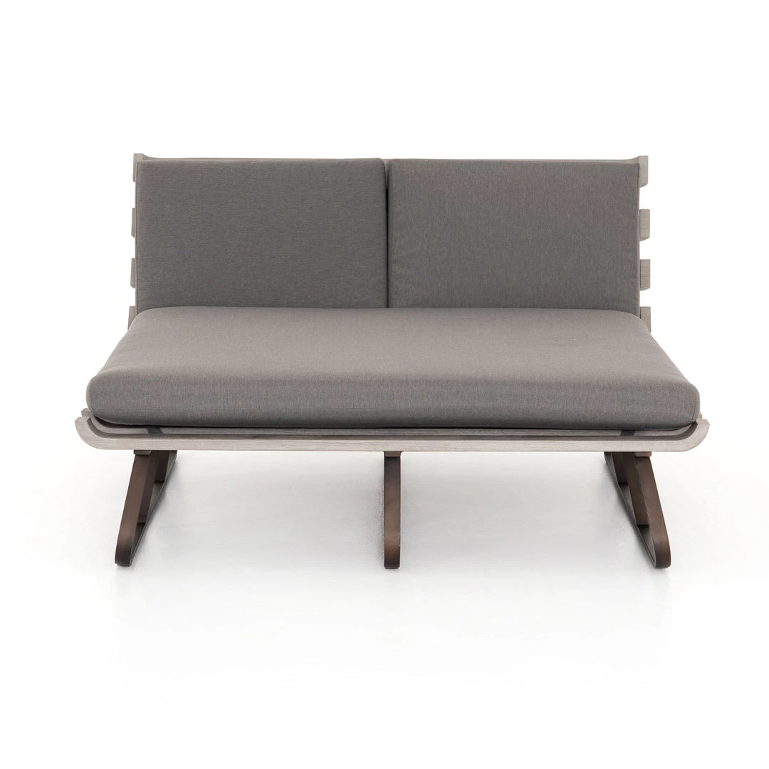 Room for two. A slatted frame of washed brown teak supports daybed-style seating in a neutral stone grey. Bronze-finished legs add a modern touch. Cover or store indoors during inclement weather and when not in use.