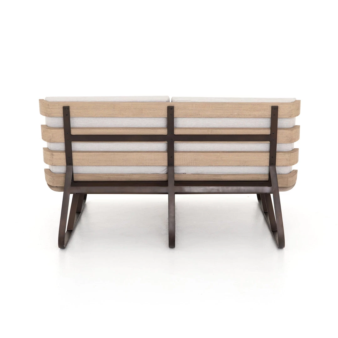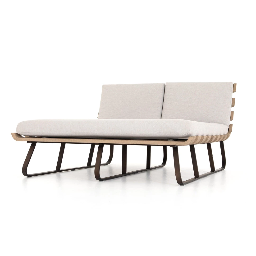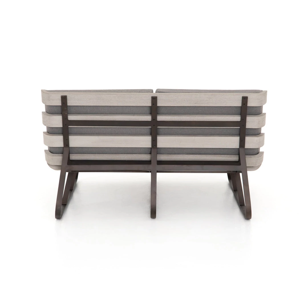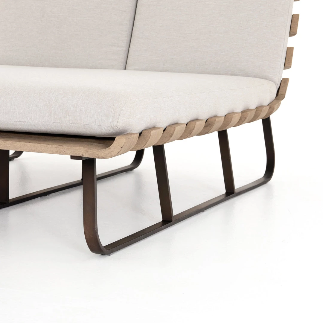Room for two. A slatted frame of washed brown teak supports daybed-style seating in a neutral stone grey. Bronze-finished legs add a modern touch. Cover or store indoors during inclement weather and when not in use.