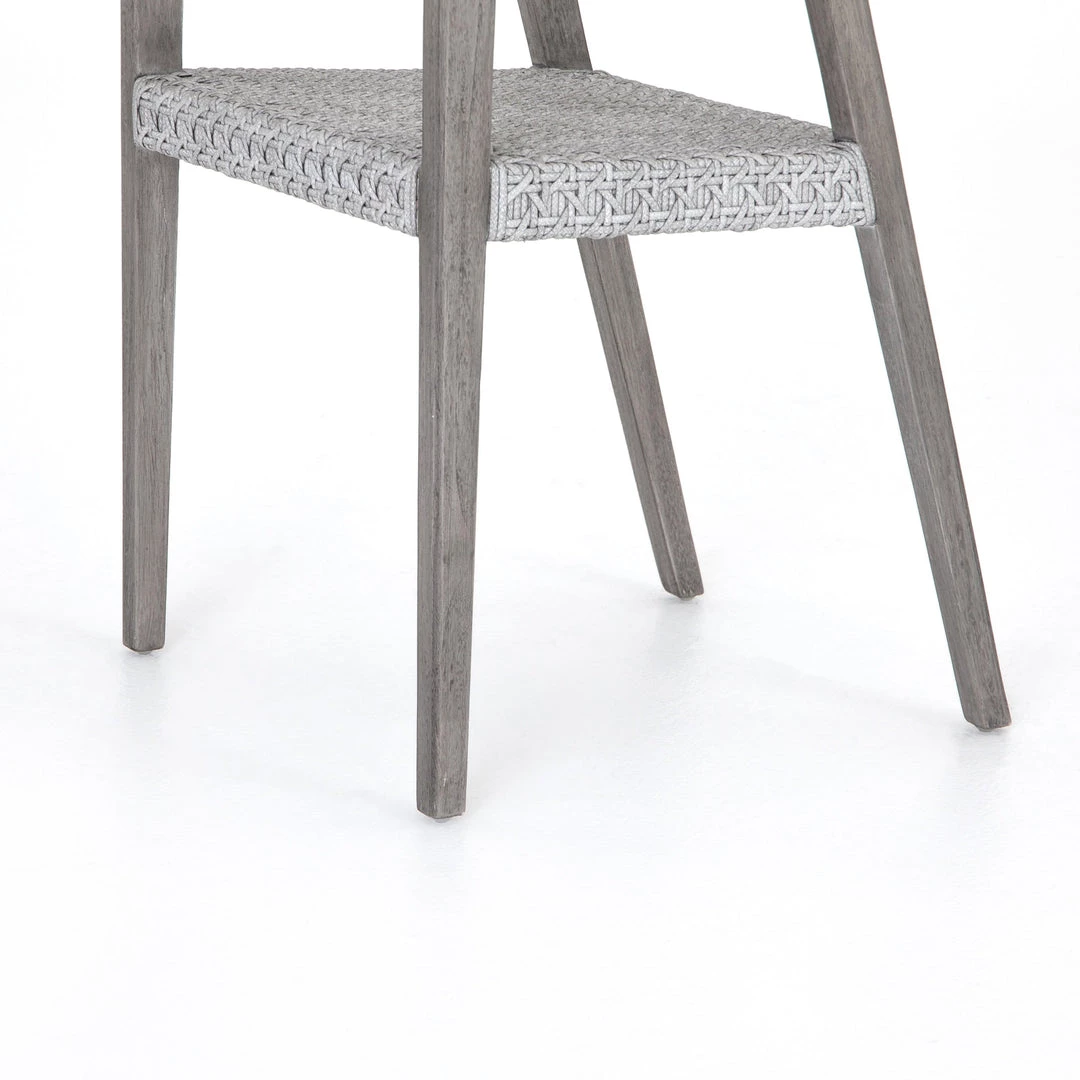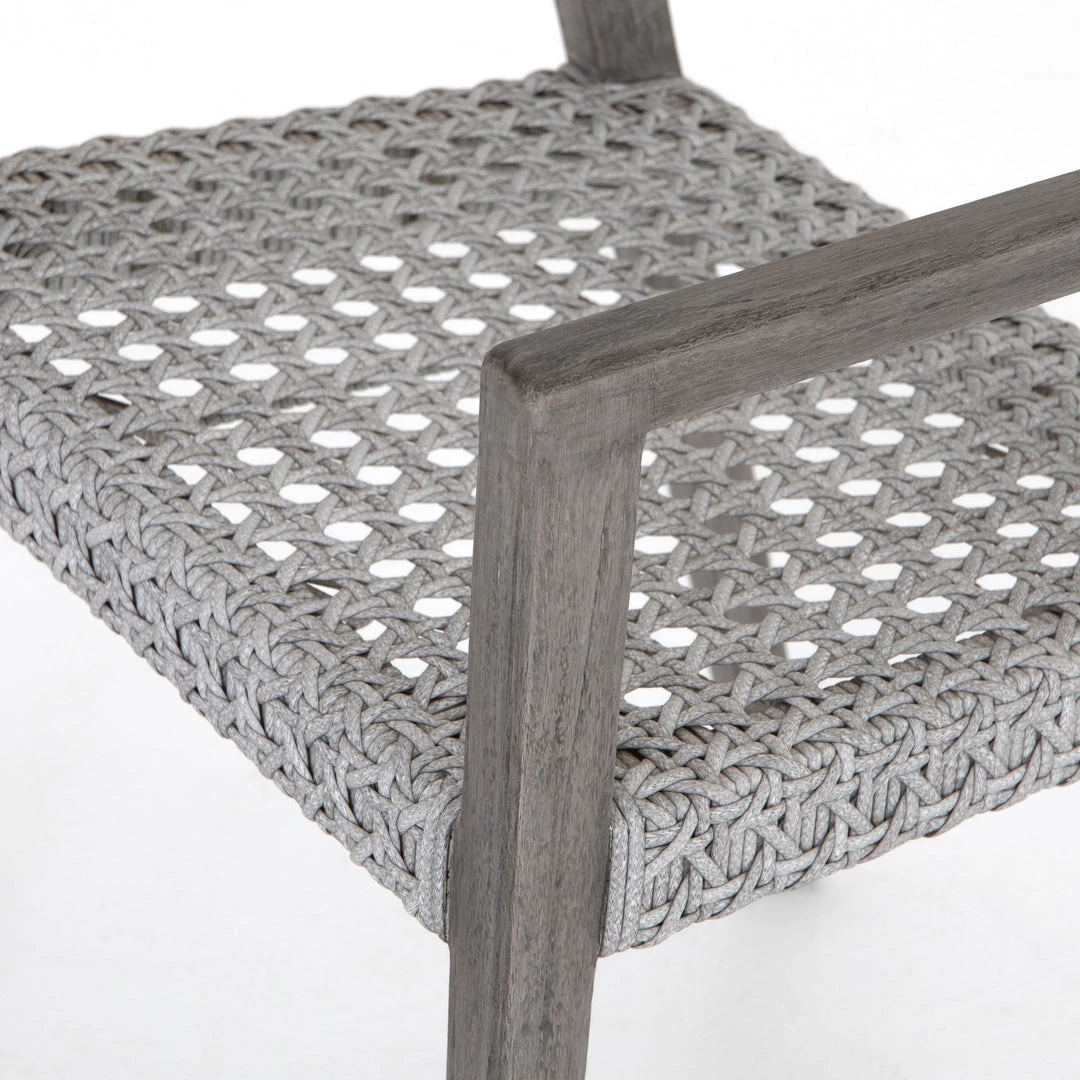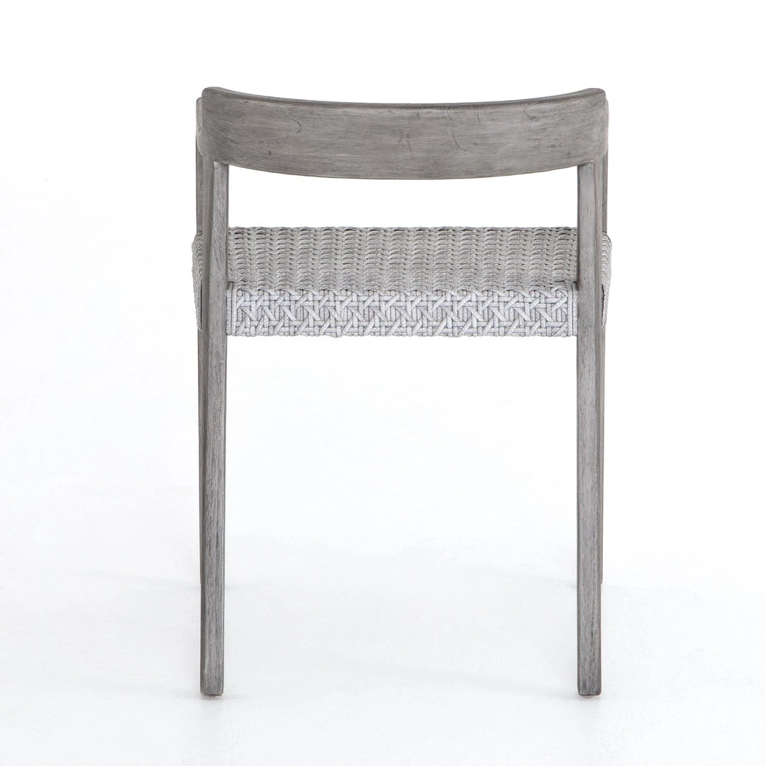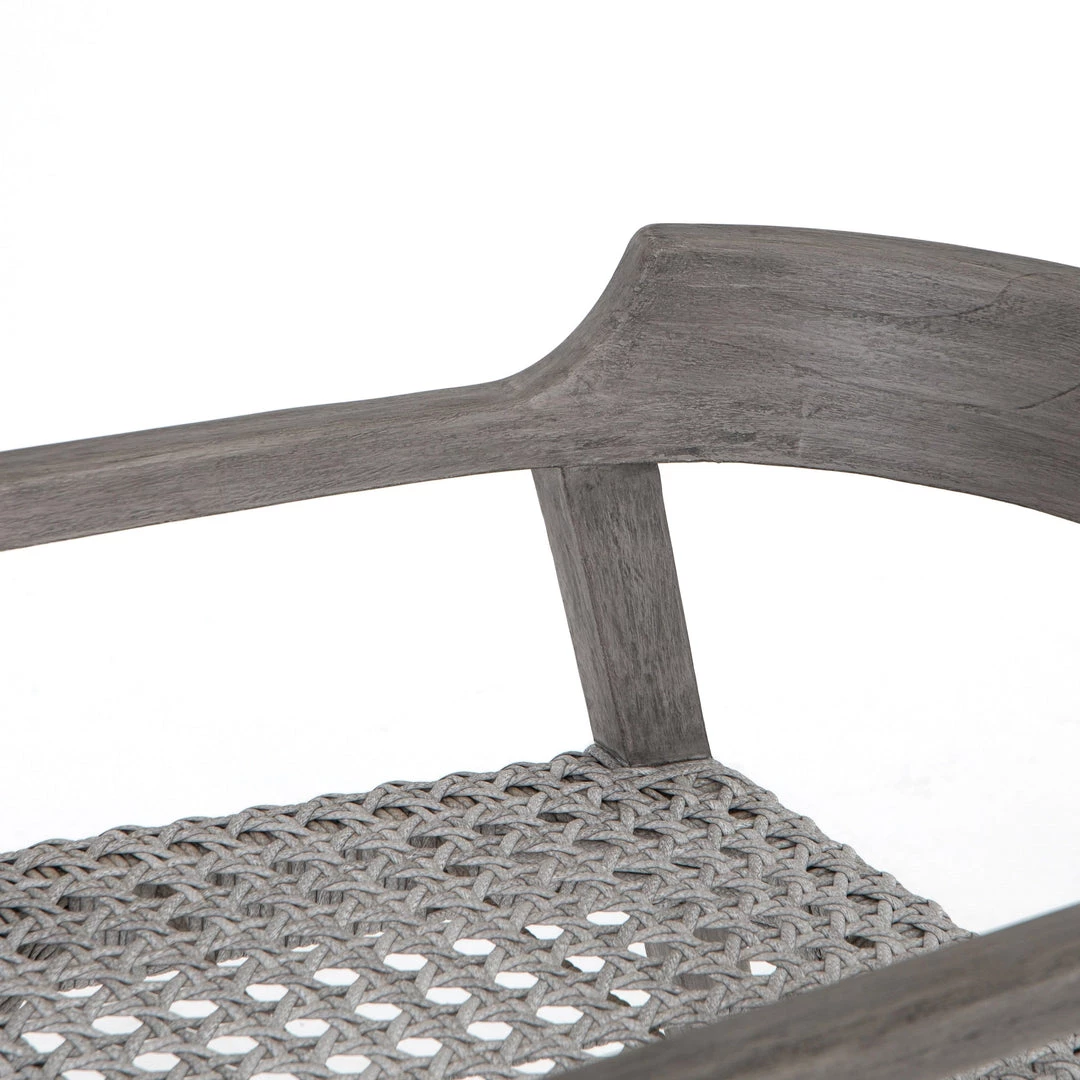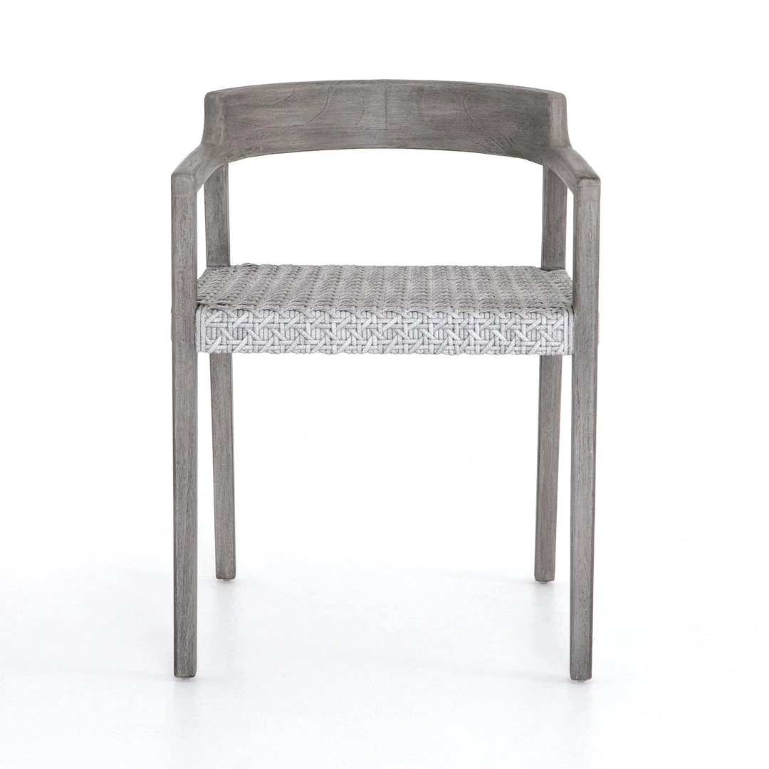 A modern silhouette redefines outdoor styling. Weathered grey-finished teak frames textural cane seating, brining a sleekly monochromatic look to al fresco dining. Cover or store indoors during inclement weather and when not in use.