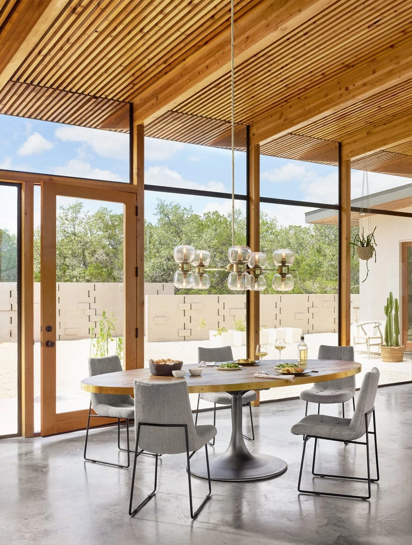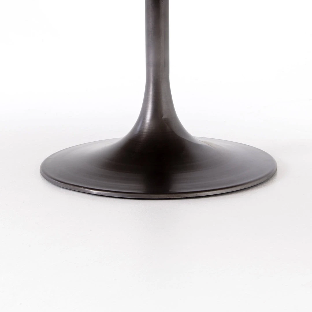 Mixed materials make the table. Classic tulip shaping is recast with a vessel grey iron base and a light, burnt oak oval top banded in polished brass steel with exposed nailheads.