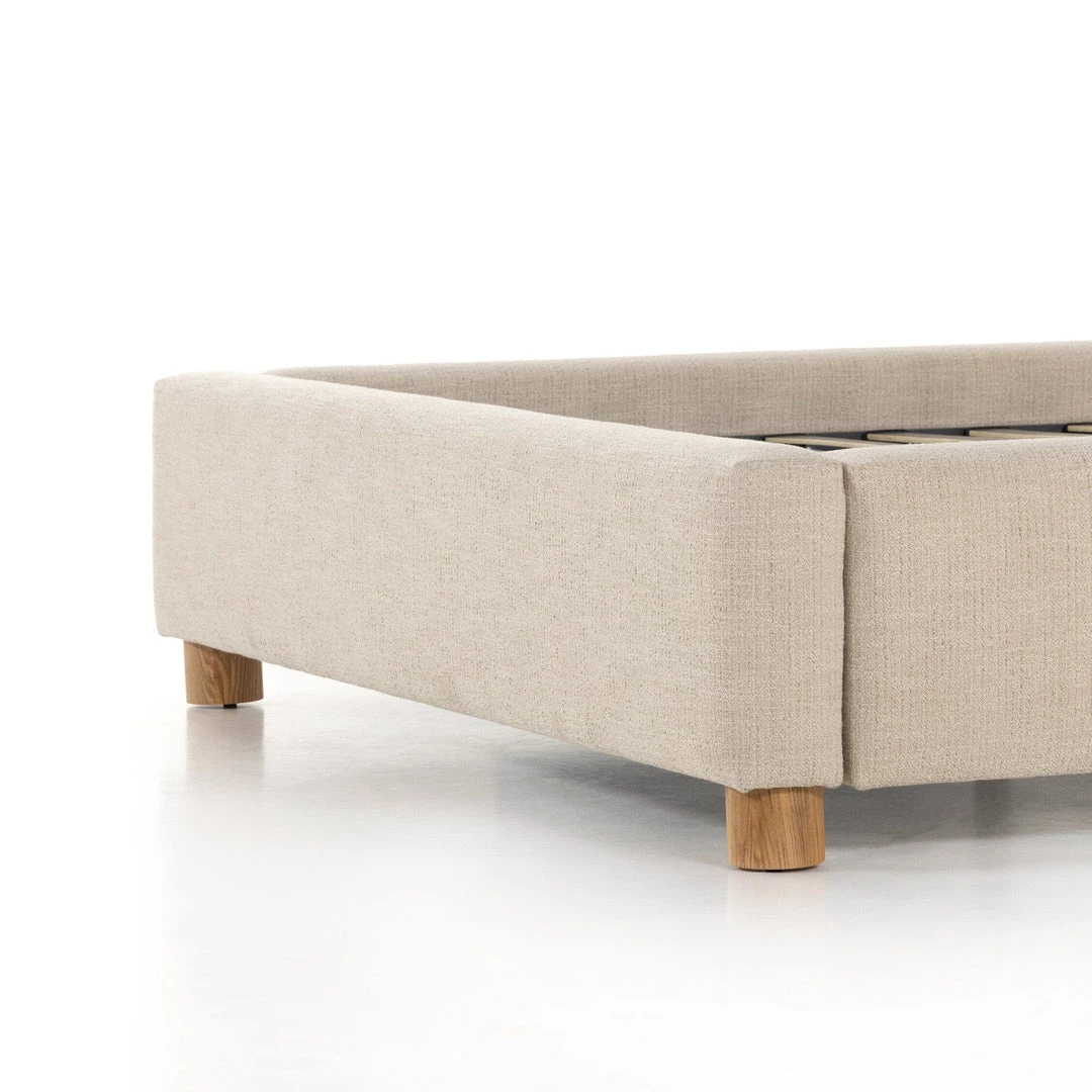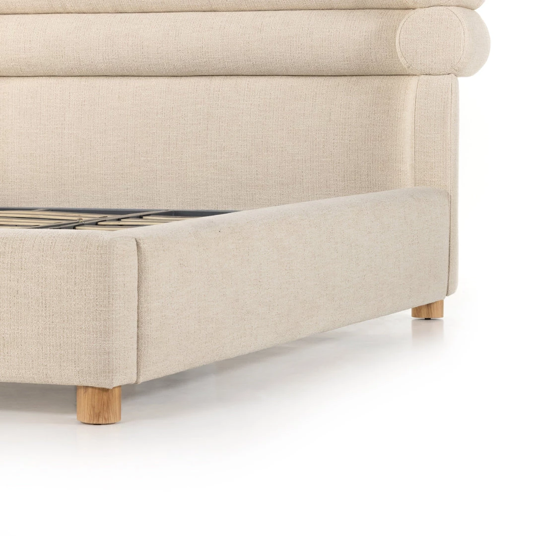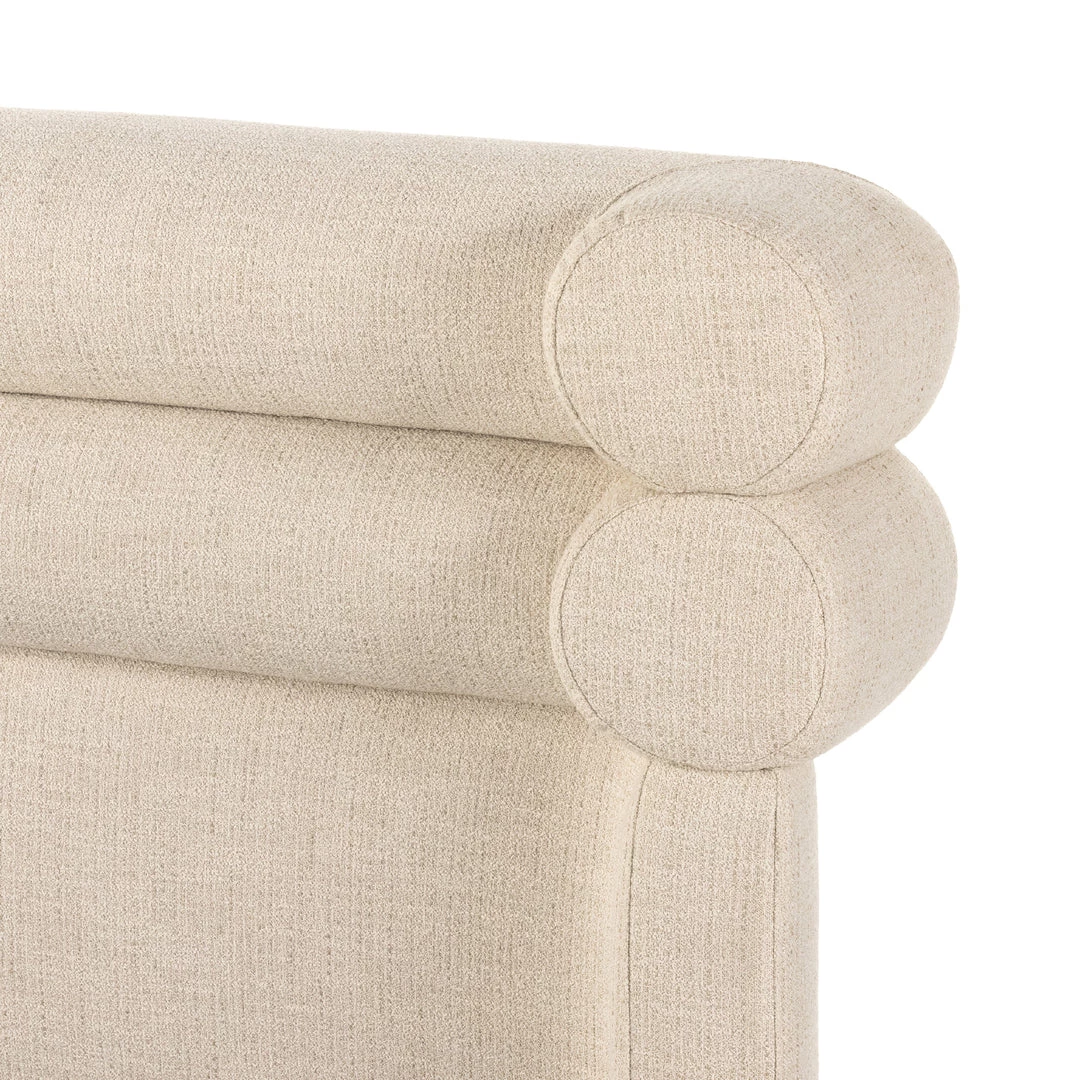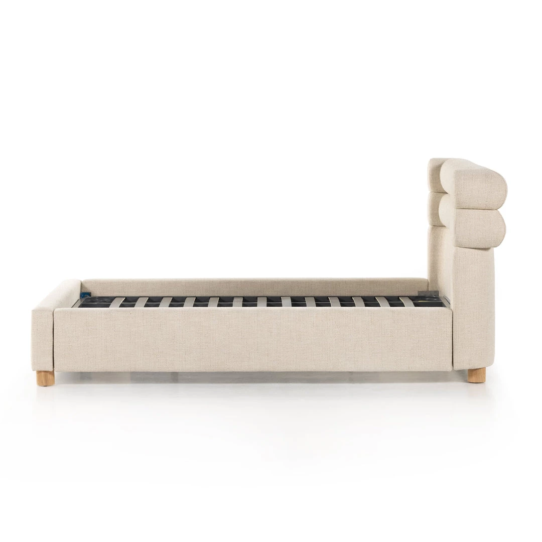 Horizontal channeling brings a clean, linear look to this modern-minded bed upholstered in cream-colored high-performance fabric.