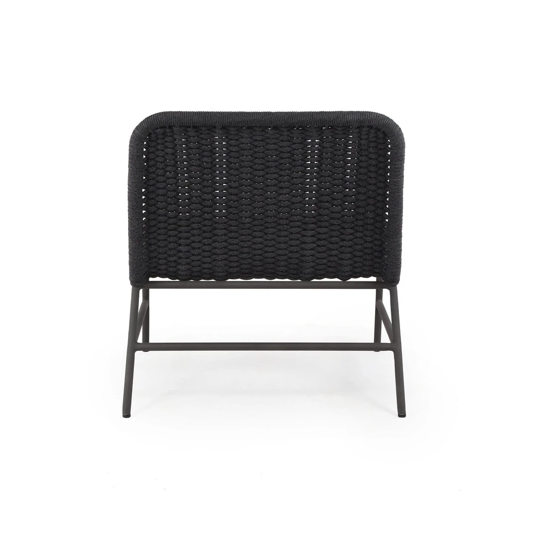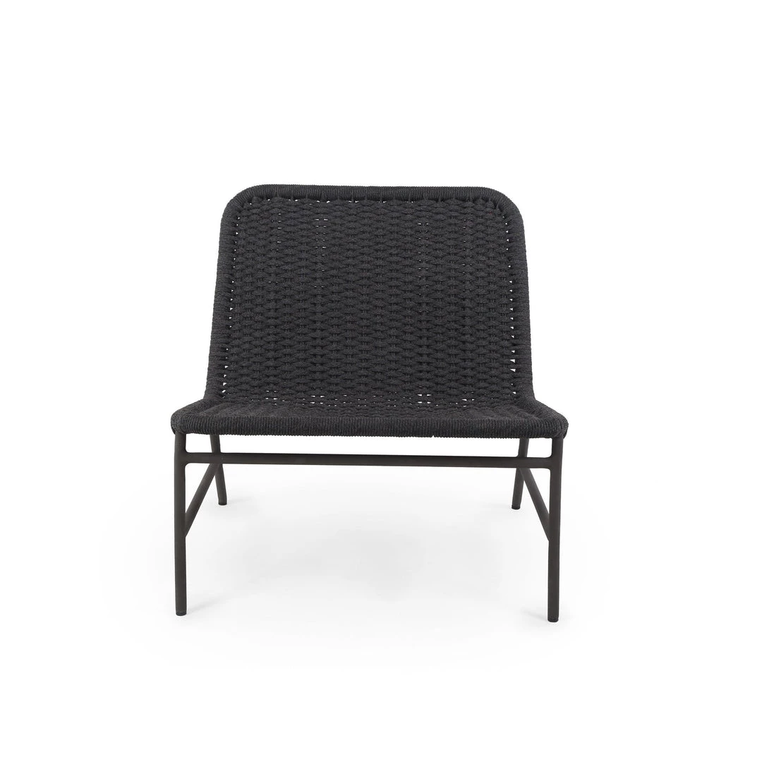 A simple, textural take on outdoor-friendly seating. Black-finished aluminum armless framing welcomes dark grey rope, for a sleek look with underlying depth. Cover or store indoors during inclement weather and when not in use.