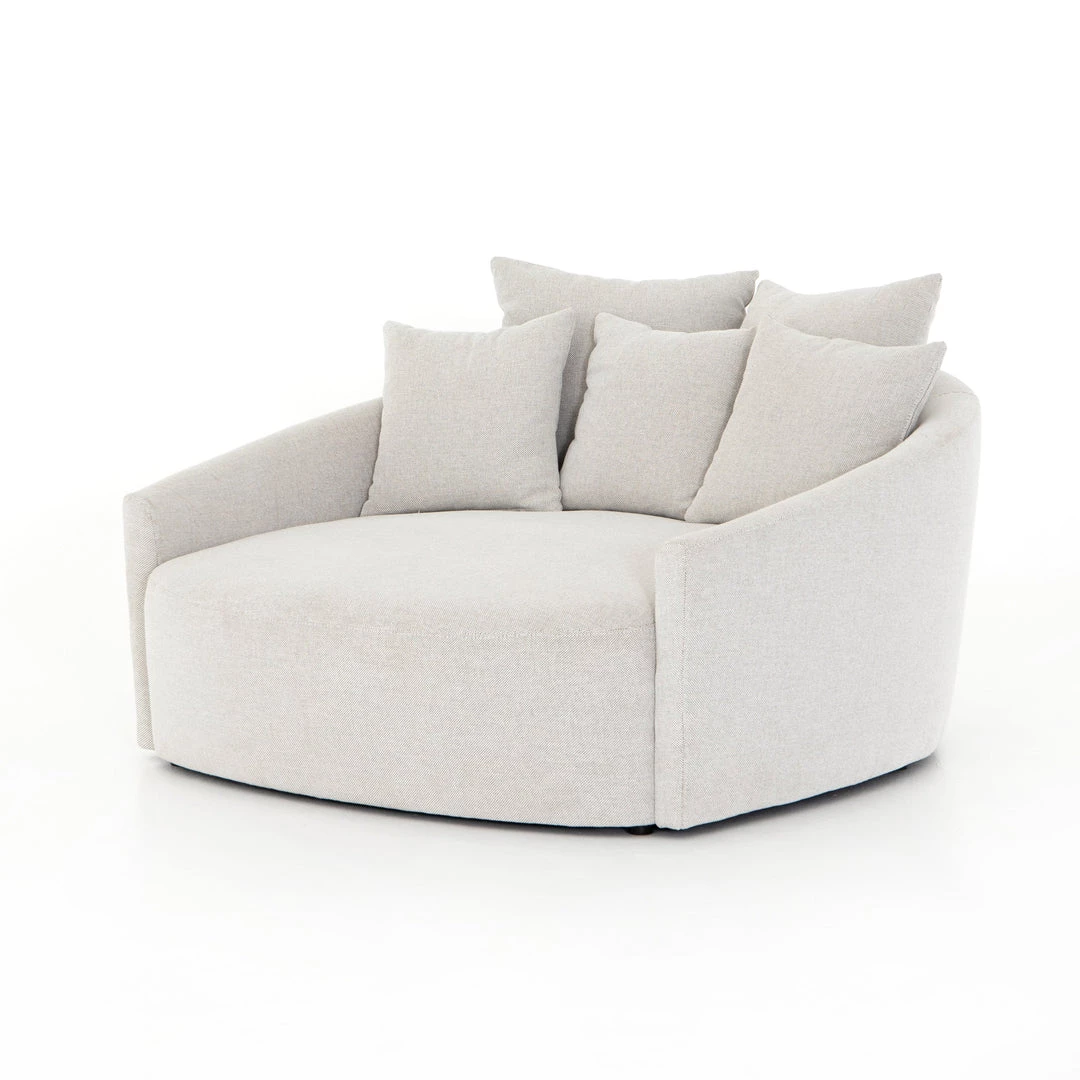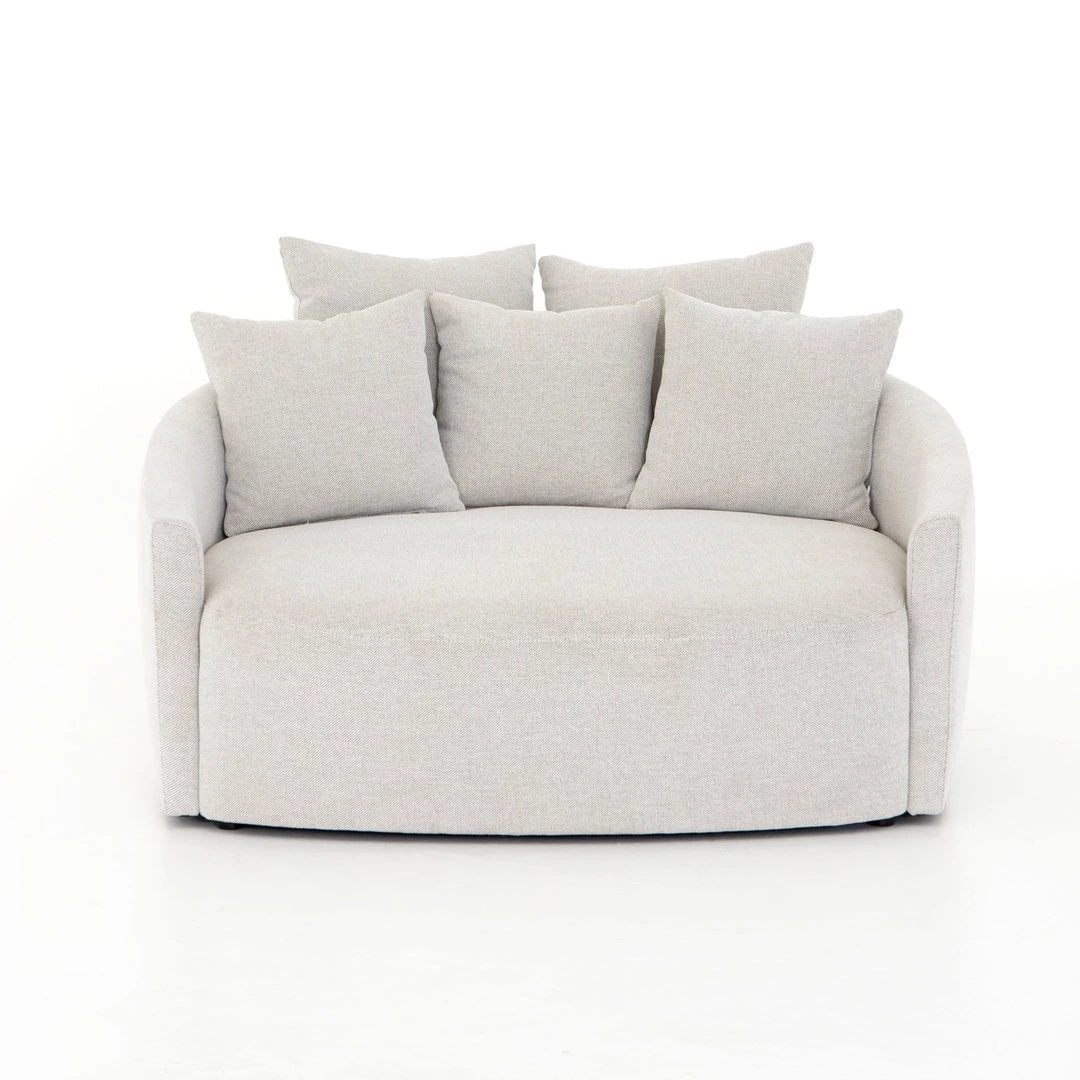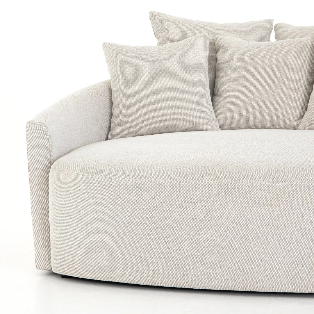 Roomy style. Light grey performance-grade upholstery forms a dramatic U shape for a spacious, sink-in sit. Throw pillows present an added touch of comfort to this sensibly styled media lounger, perfect for movie nights.