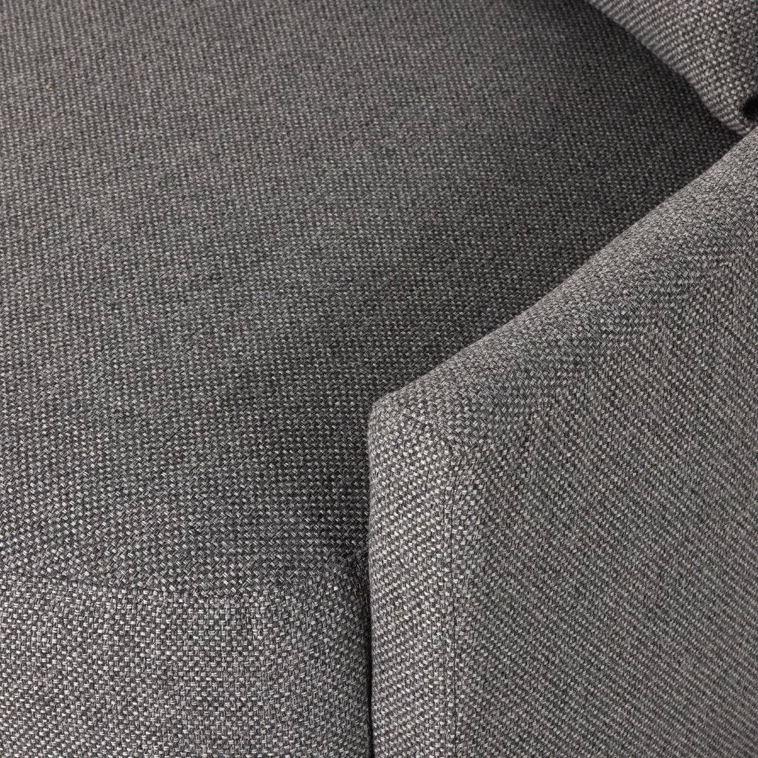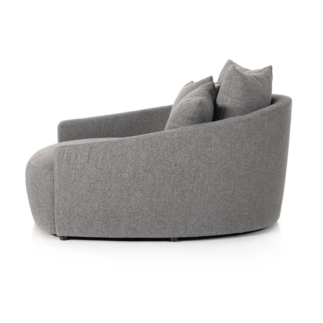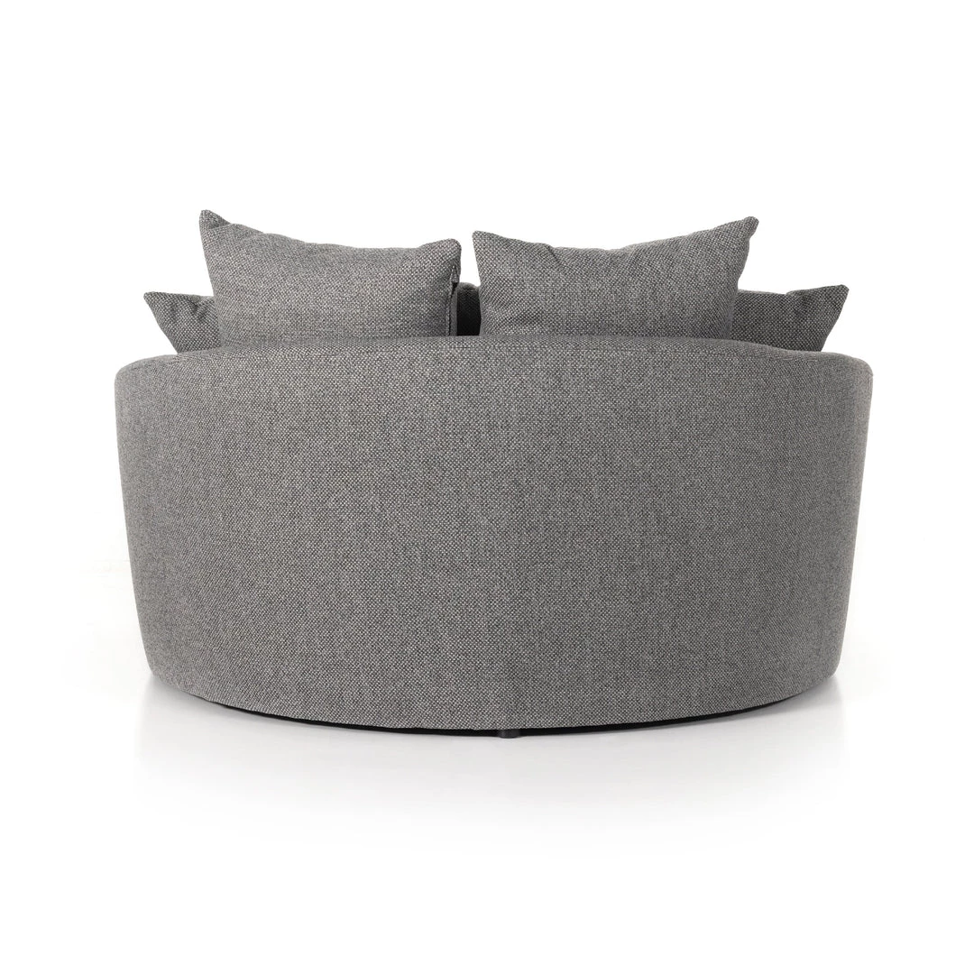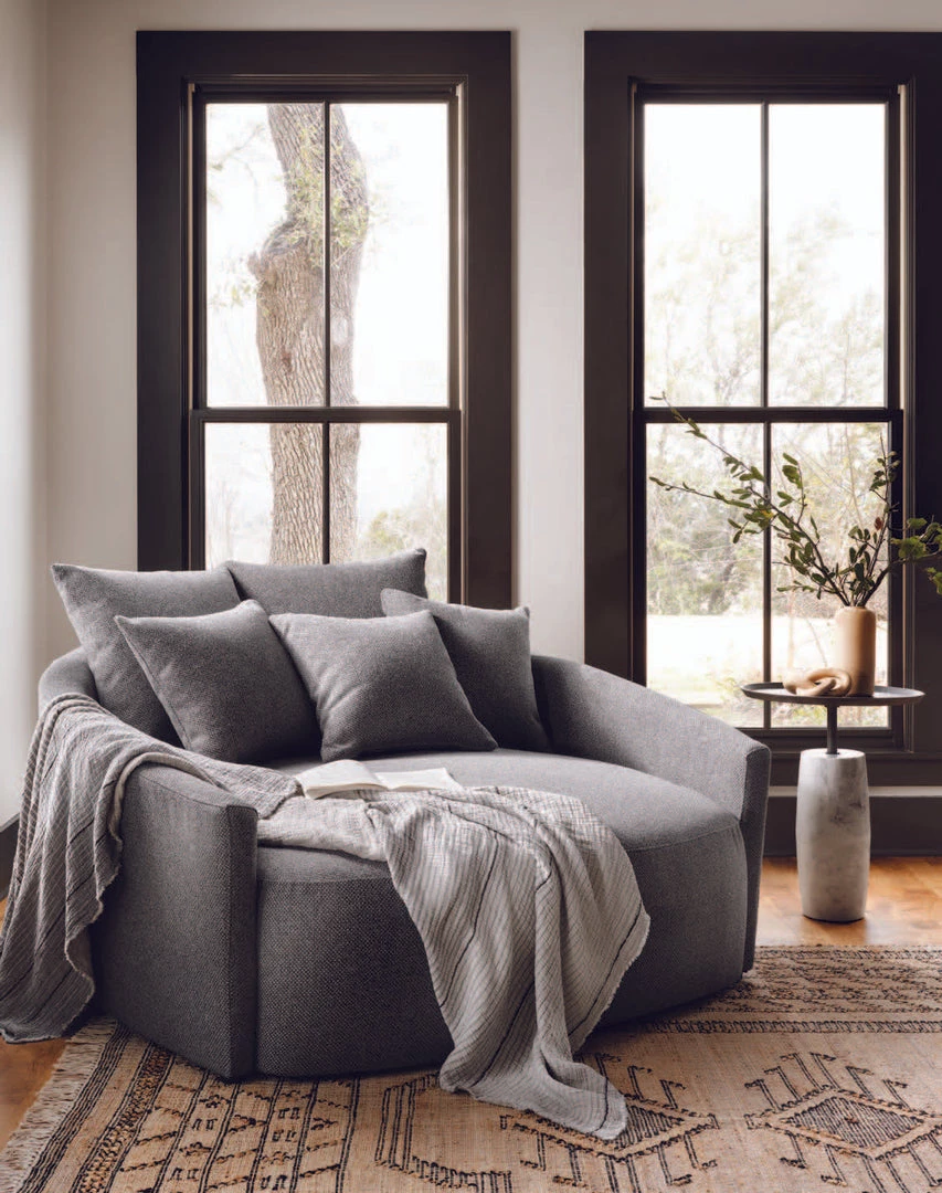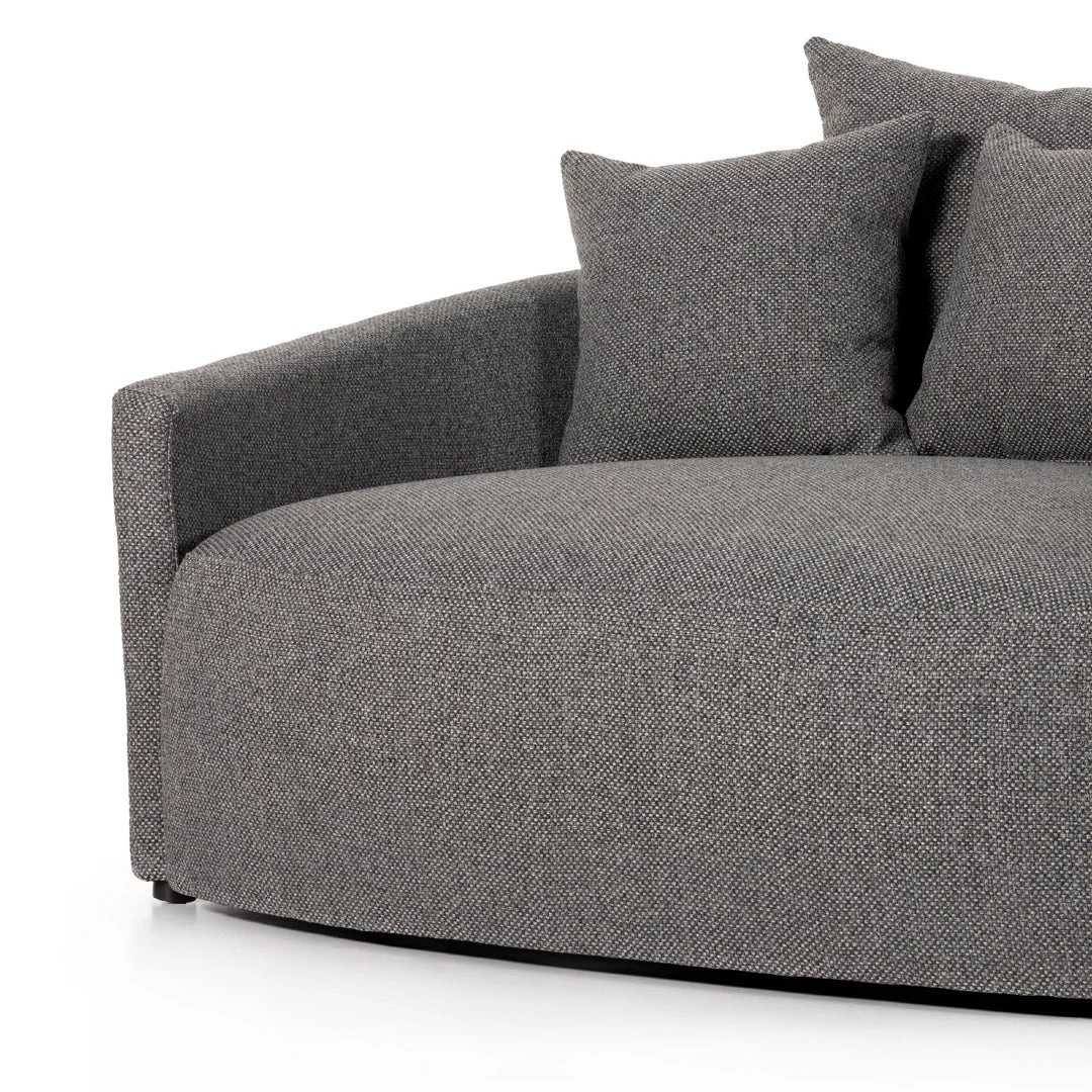Roomy style. Charcoal upholstery covers a dramatic U shape for a spacious, sink-in sit. Throw pillows present an added touch of comfort to this sensibly styled media lounger, perfect for movie nights.