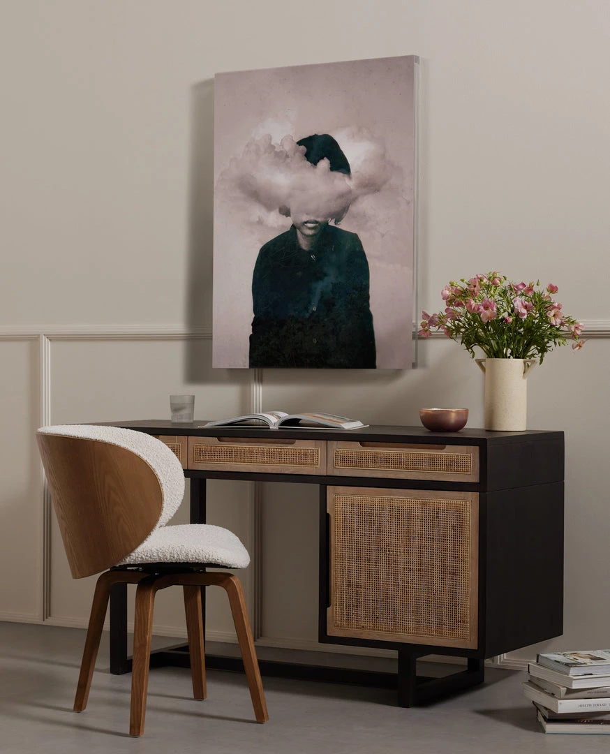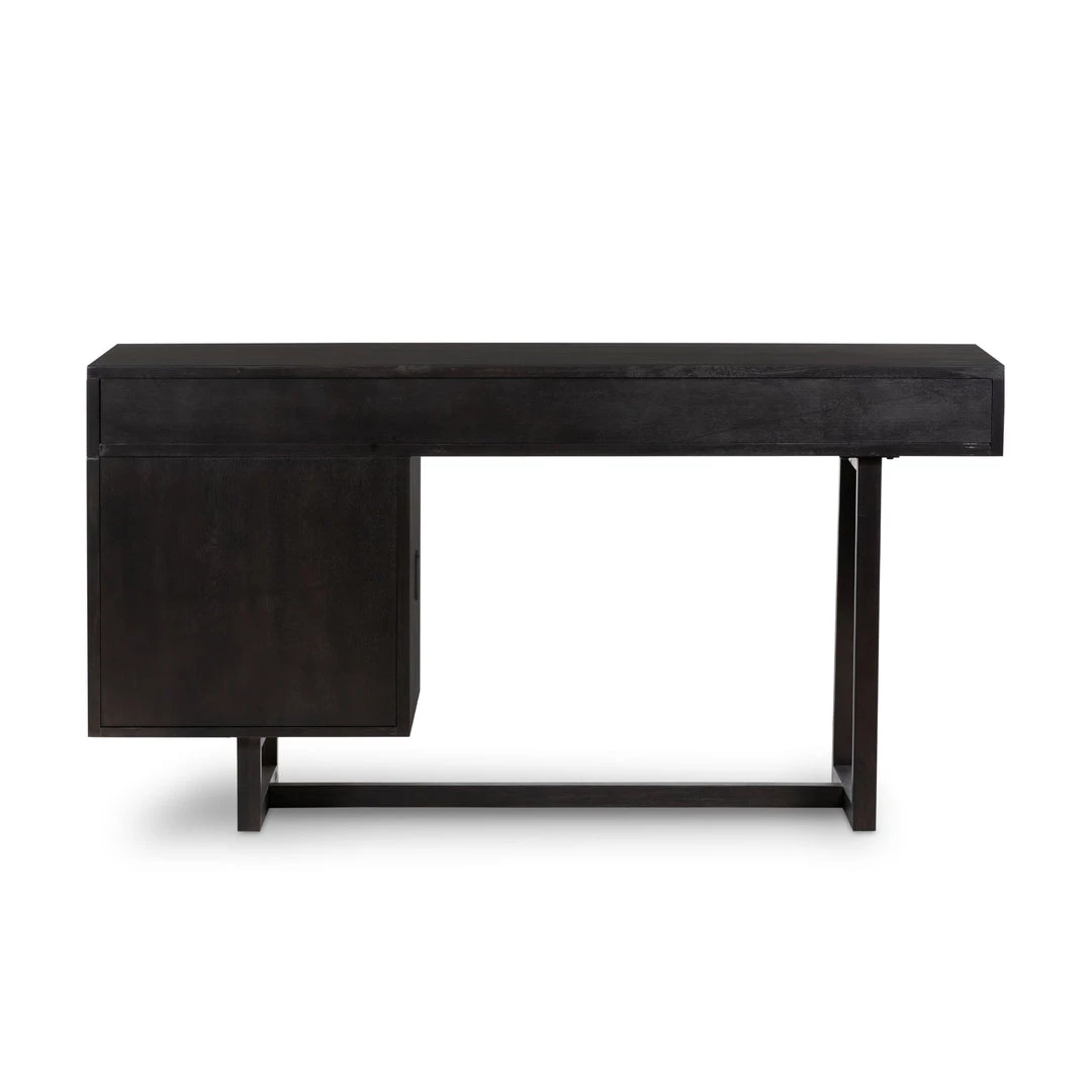 Mid century-spirited while beautifully on trend. A texture-driven desk of black-washed mango features three cane-covered drawers plus cabinetry for handy file storage.
