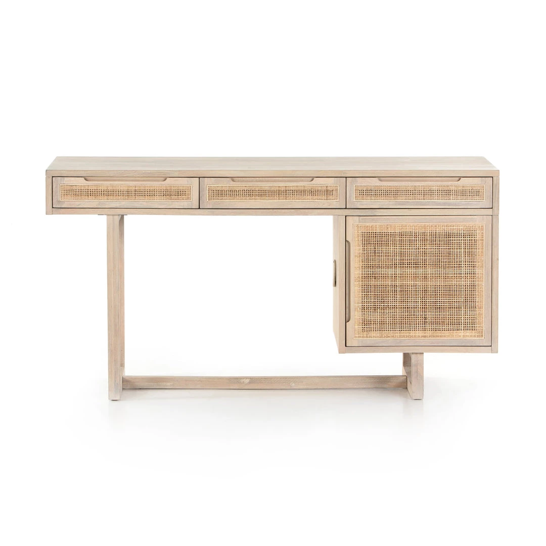 Mid century-spirited while beautifully on trend. A texture-driven desk of natural mango features three cane-covered drawers plus cabinetry for handy file storage.