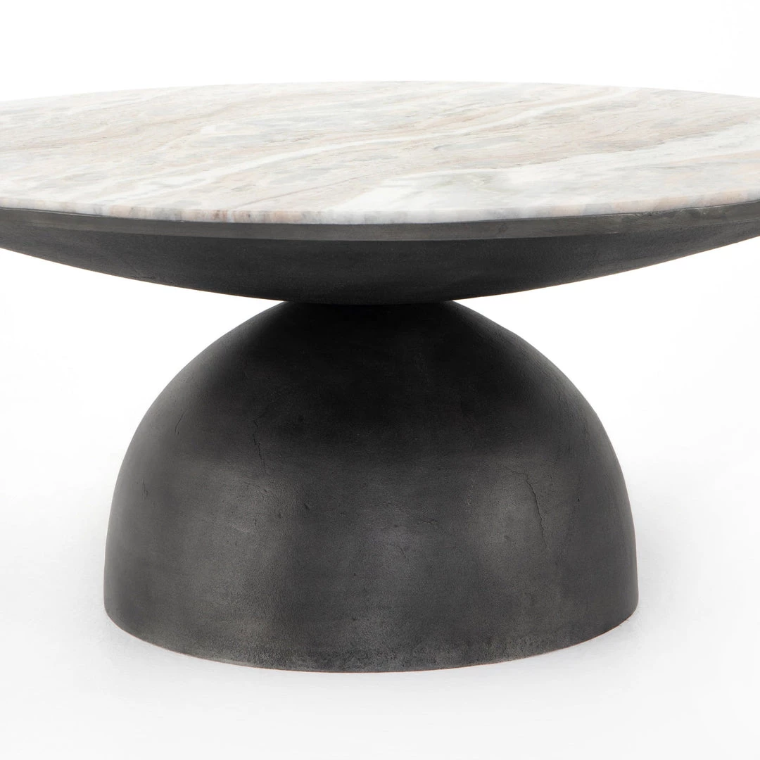 A sculptural play on shape. Hammered grey-finished aluminum base supports a grand, rounded tabletop of creamy taupe marble with beautiful natural veining.