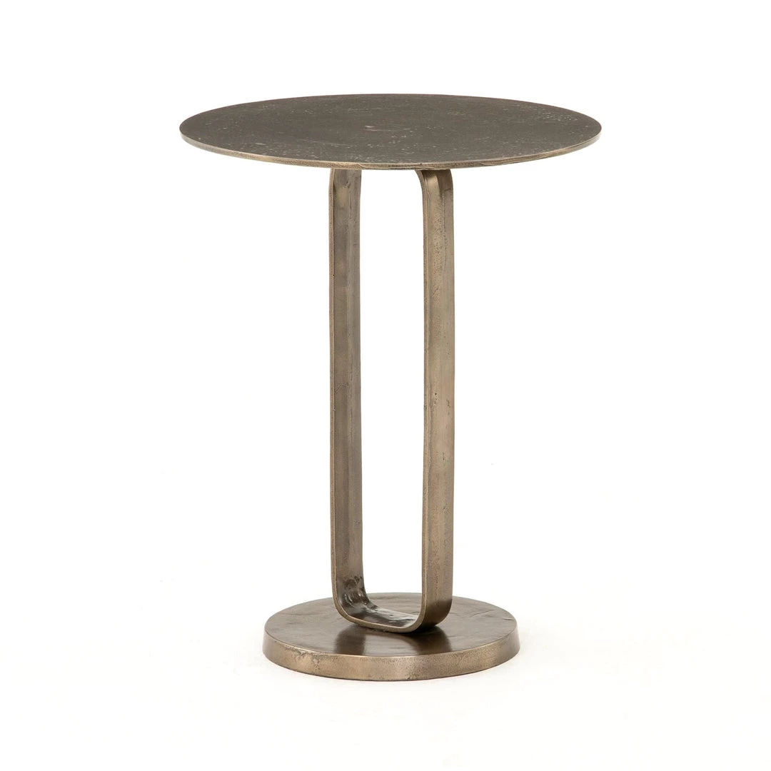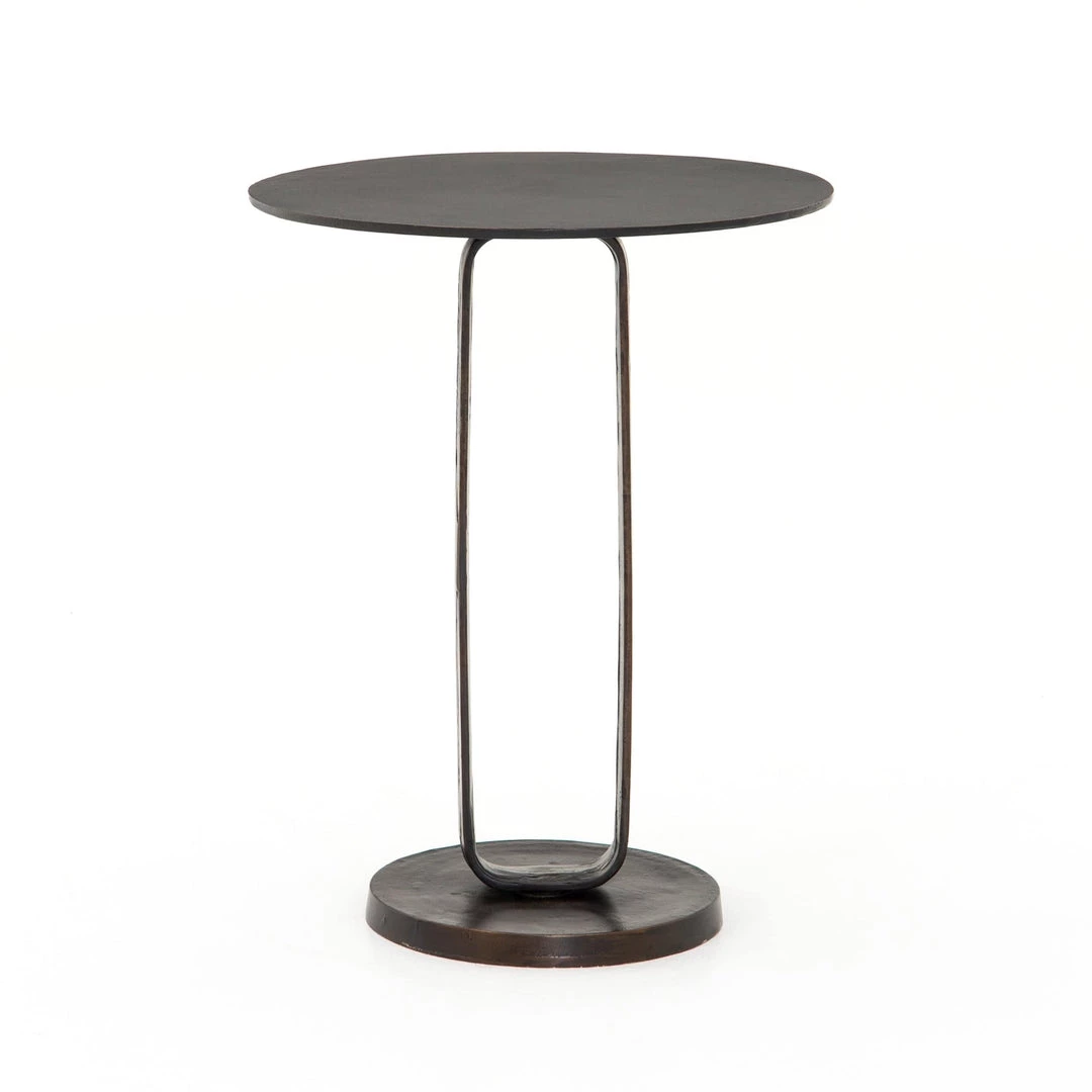 Precise curves with modern presence. Rounded base and tabletop of antique rust-finished aluminum are connected via a shapely ring, for an open look and fun blend of scale and proportion. Safe for outdoor spaces. Cover or store indoors during inclement weather and when not in use.