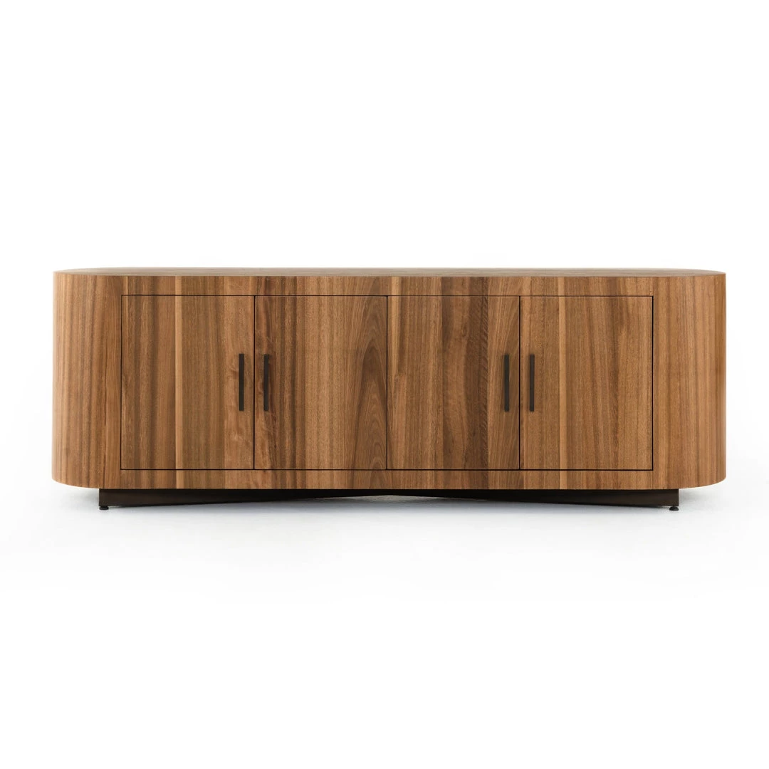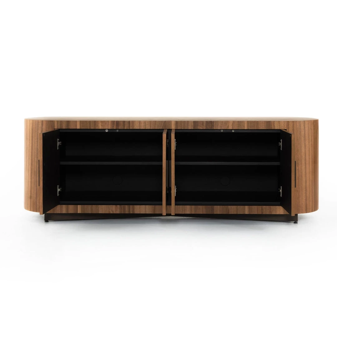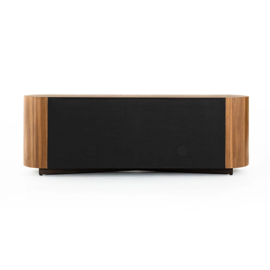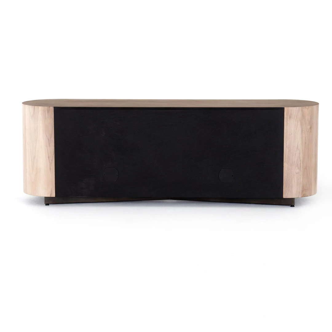 Stunning forces of nature are captured in a pill-shaped media console of ashen walnut. Generous interior space for media storage, plus rear cutouts for cord management. Reflective of woods’ natural character, a slight color variance is possible.