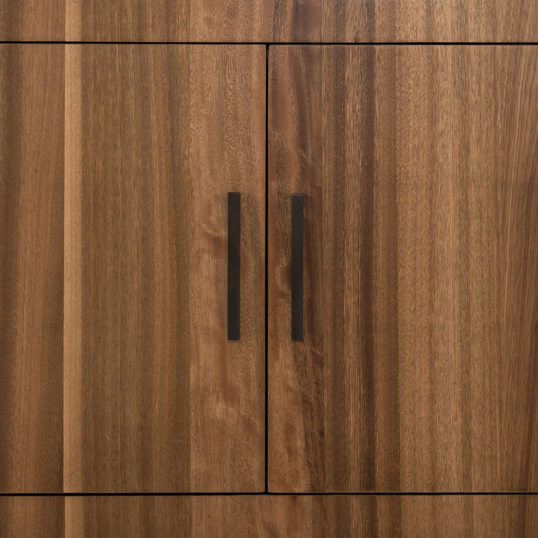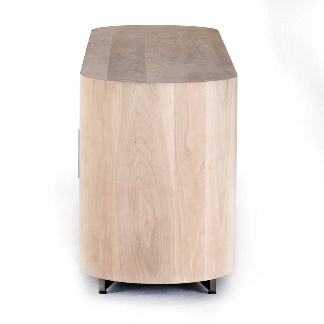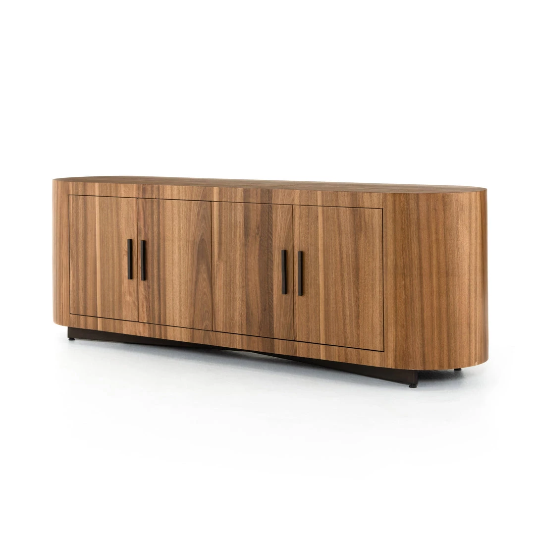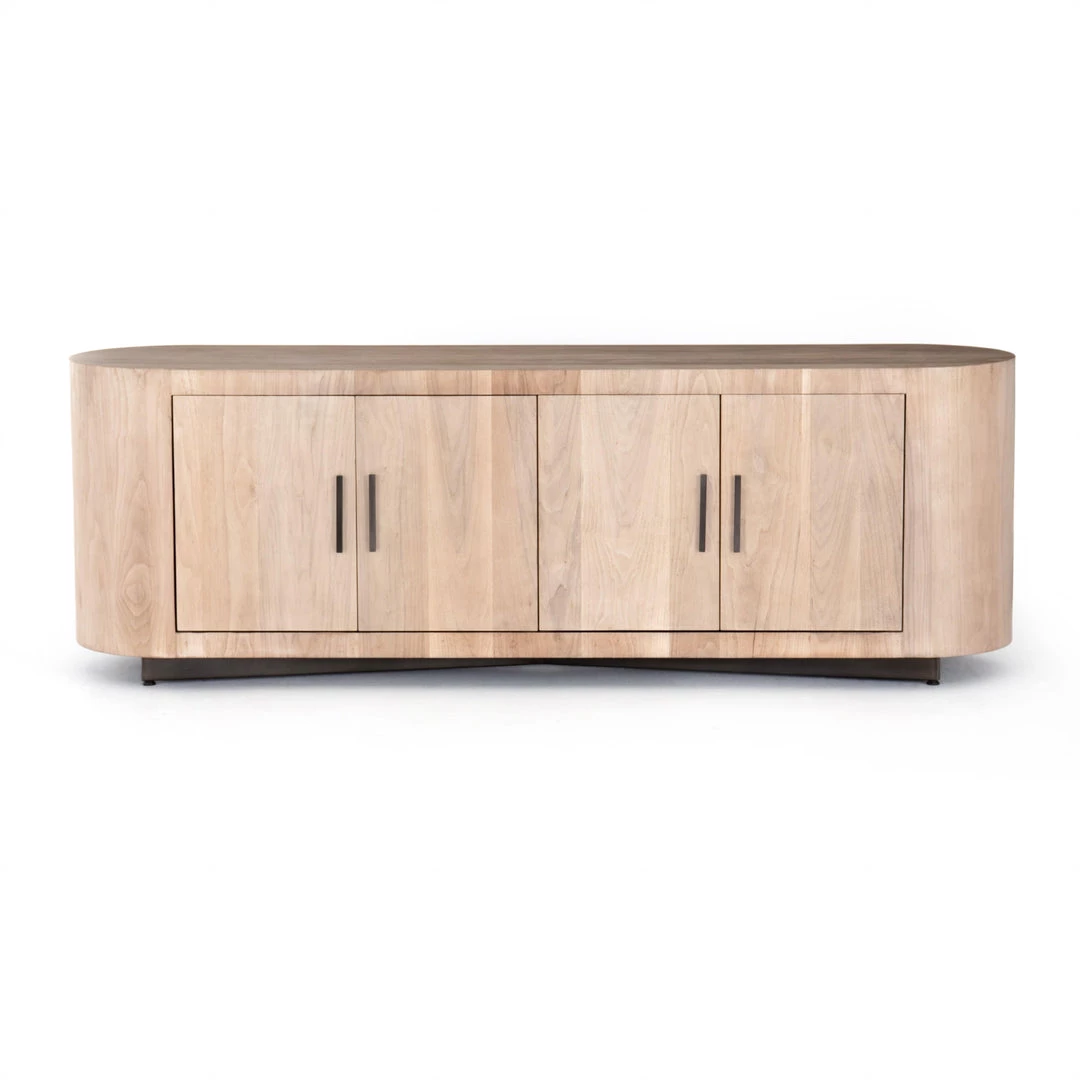 Stunning forces of nature are captured in a pill-shaped media console of ashen walnut. Generous interior space for media storage, plus rear cutouts for cord management. Reflective of woods’ natural character, a slight color variance is possible.