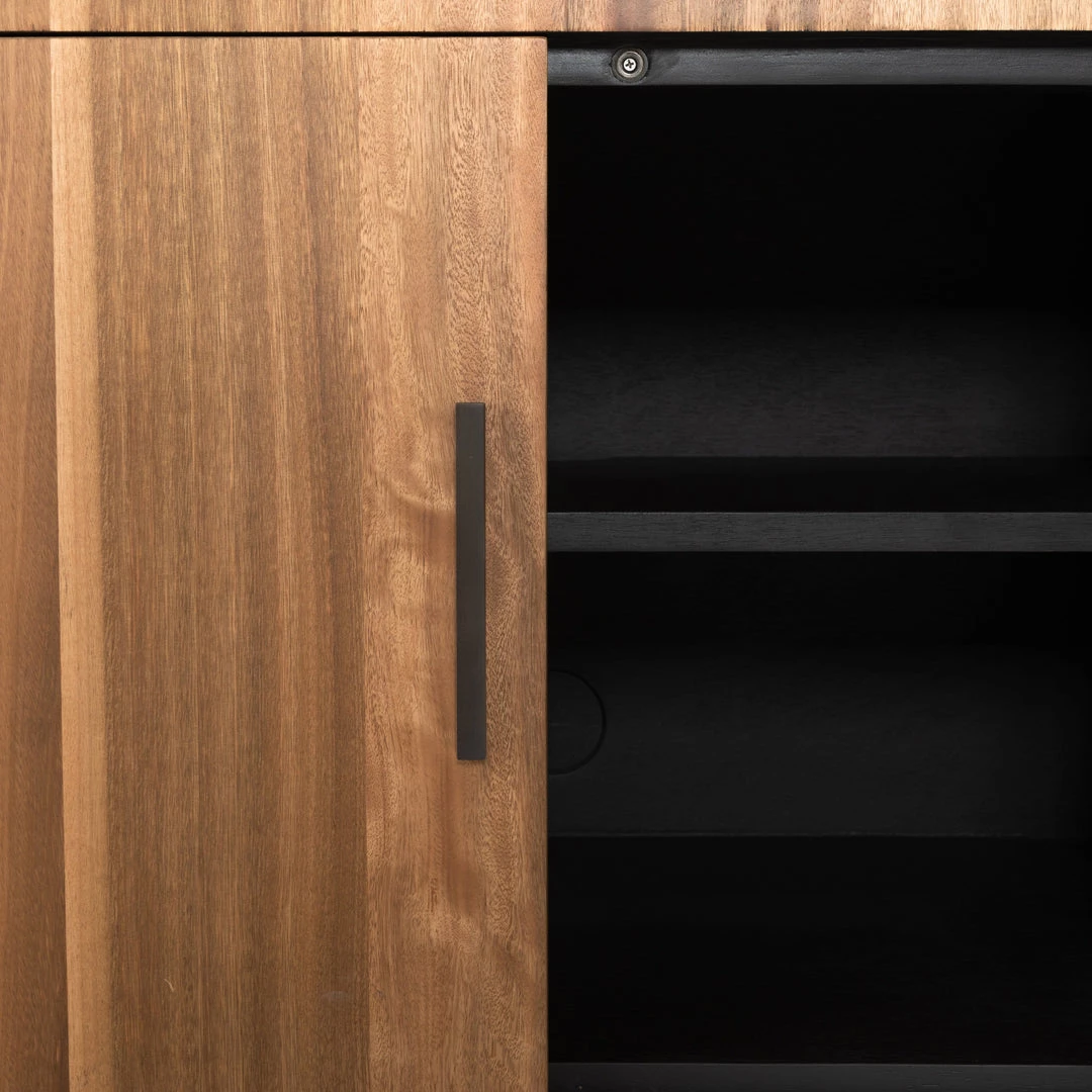Stunning forces of nature are captured in a pill-shaped media console of natural yukas, with black resin beautifully highlighting organic cracks and graining. Generous interior space for media storage, plus rear cutouts for cord management. Reflective of woods’ natural character, a slight color variance is possible.