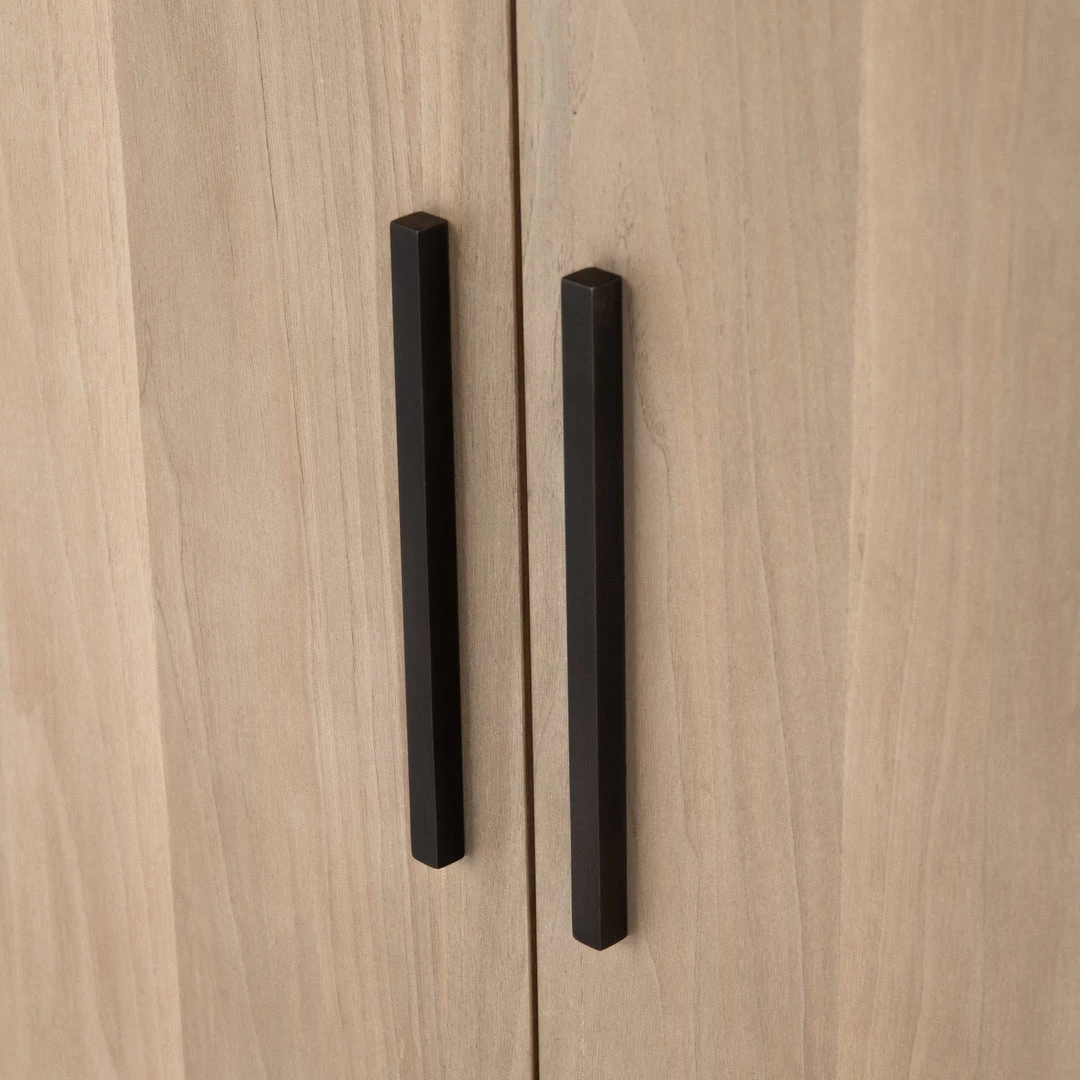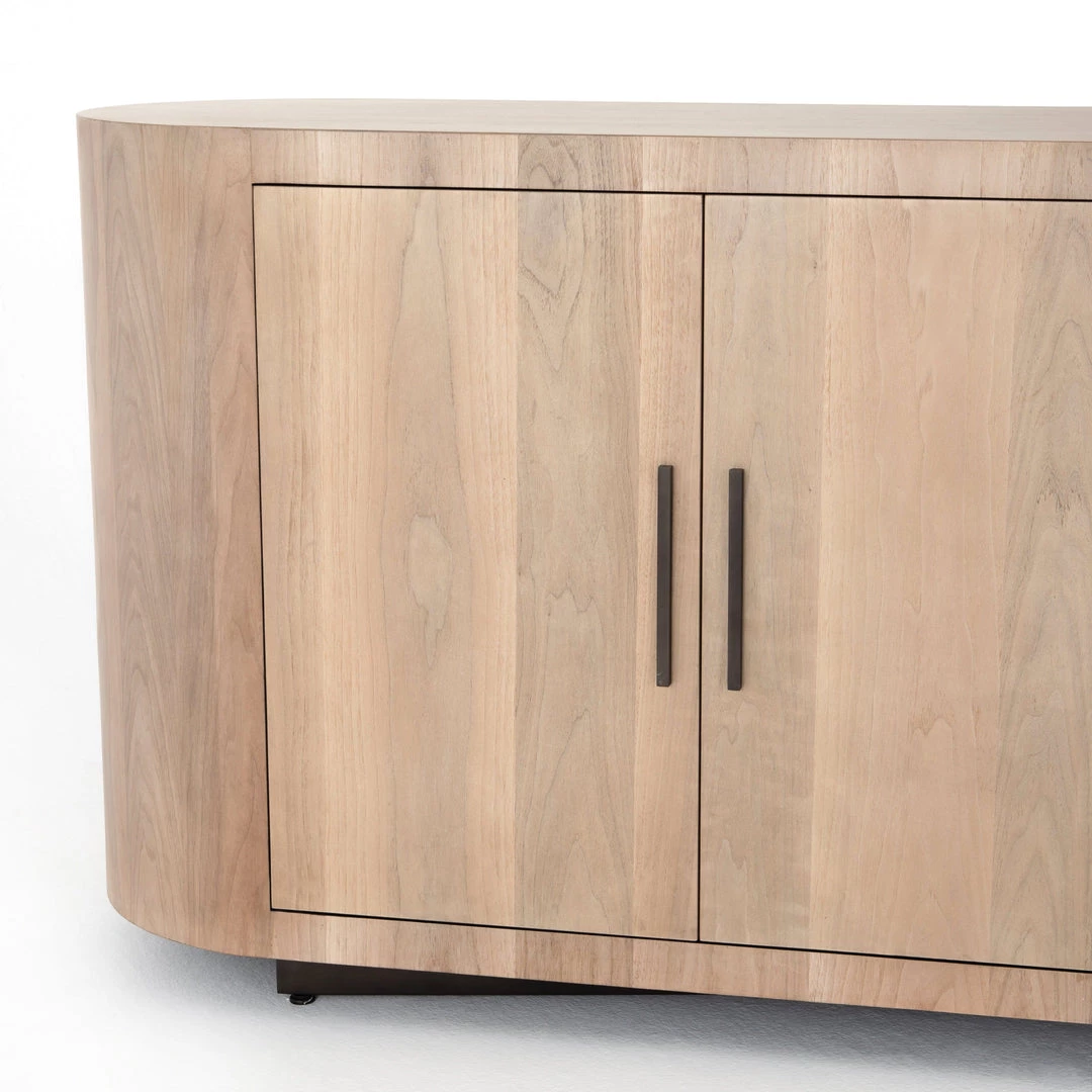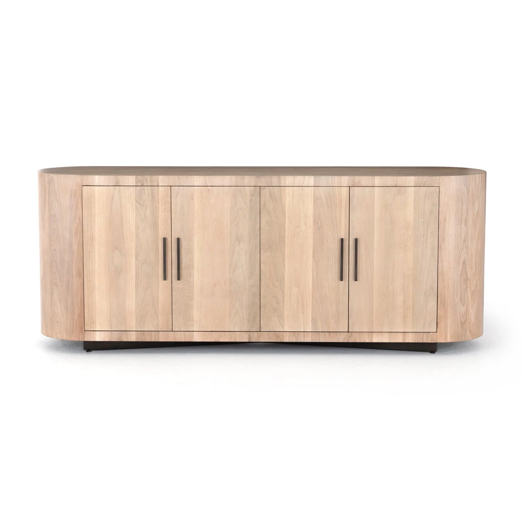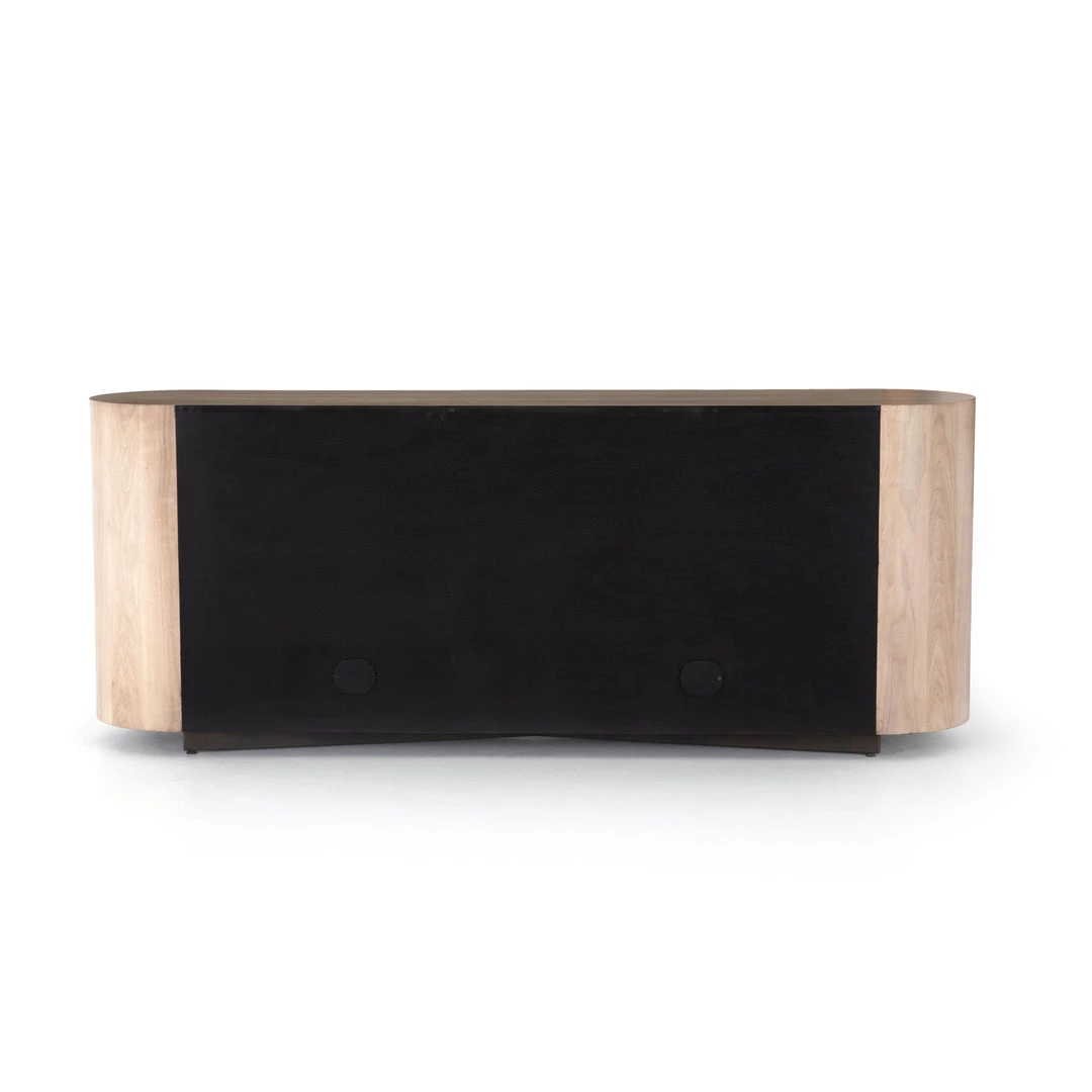 Stunning forces of nature are captured in a pill-shaped media console of ashen walnut atop an iron X base. Generous interior space for dining and entertaining essentials. Reflective of woods’ natural character, a slight color variance is possible.