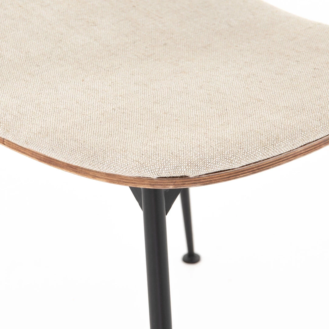 The traditional bent ply chair, reimagined, with cream linen seating, acorn-finished oak back and slim iron legs, finished in a dark rustic black.