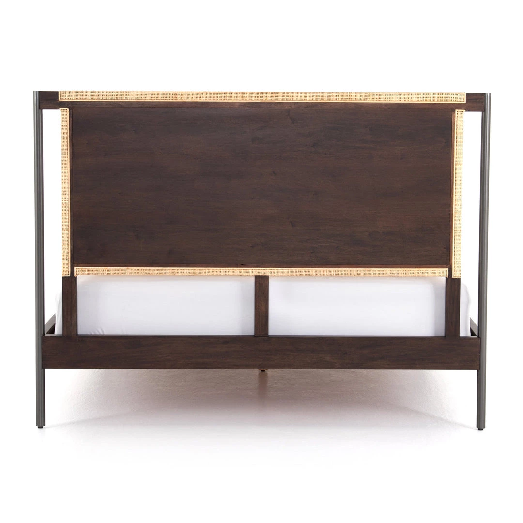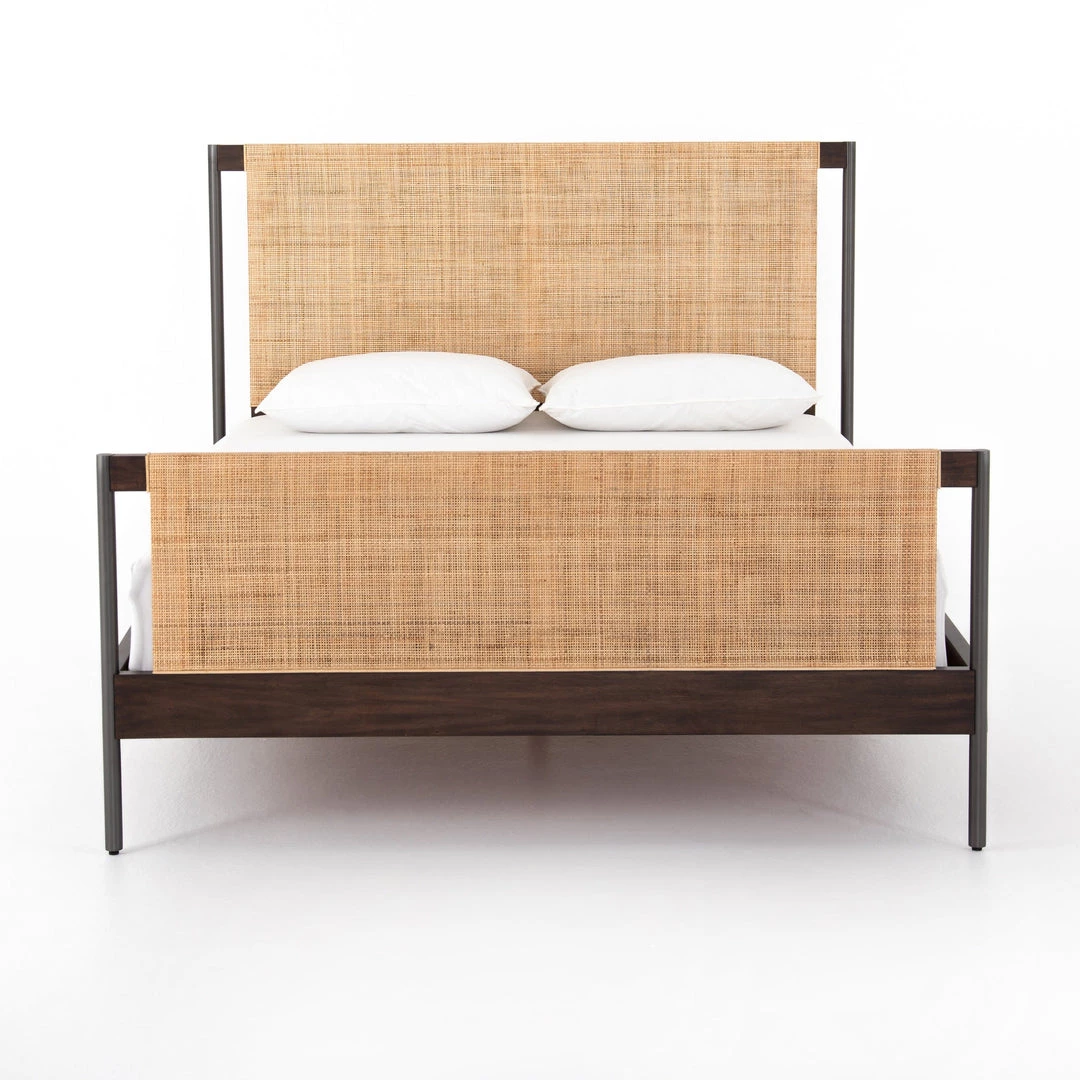 A float-like design brings a lightweight look to the bedroom. Natural cane head and foot boards, with mahogany backing for style and support. A charcoal-finished iron base with wooden stretchers offers a fresh, refined look with organic presence.