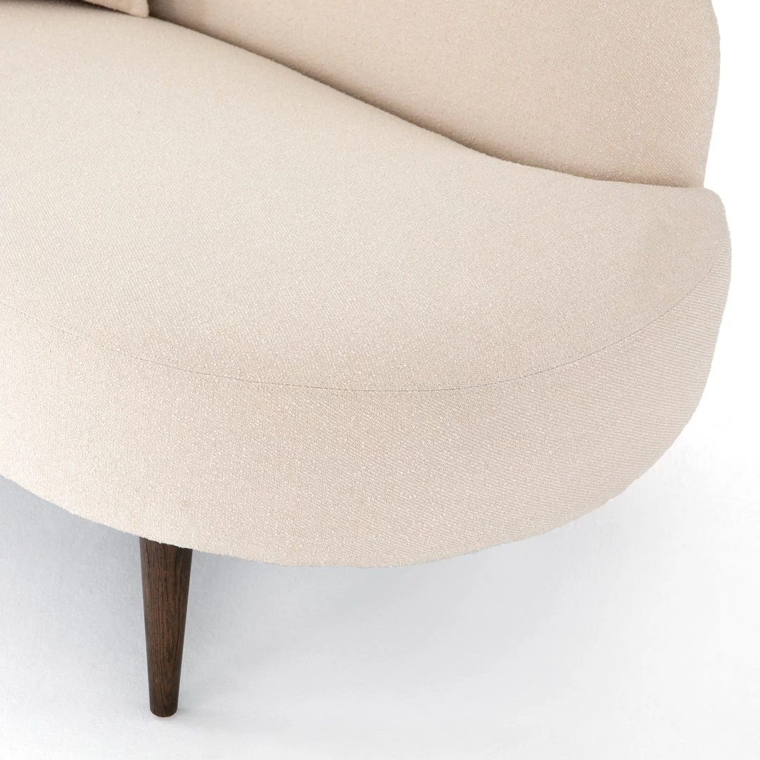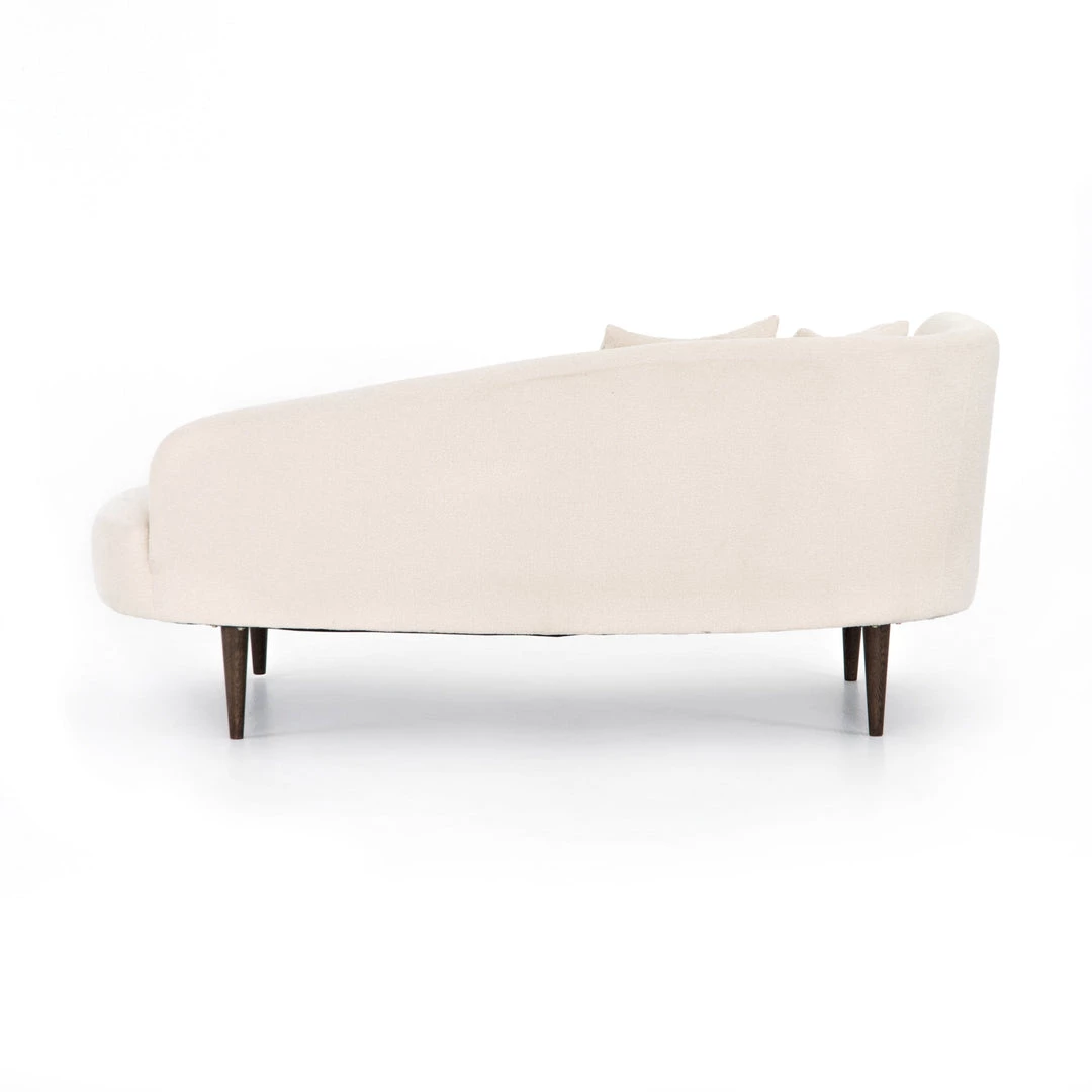 Curvy, Italian-inspired design exudes attitude. Exclusive performance-grade ivory boucle strikes a sultry S shape, with cone-tapered brown oak legs adding to this sculptural chaise’s formal air. Dual pillows for a fine finishing touch.