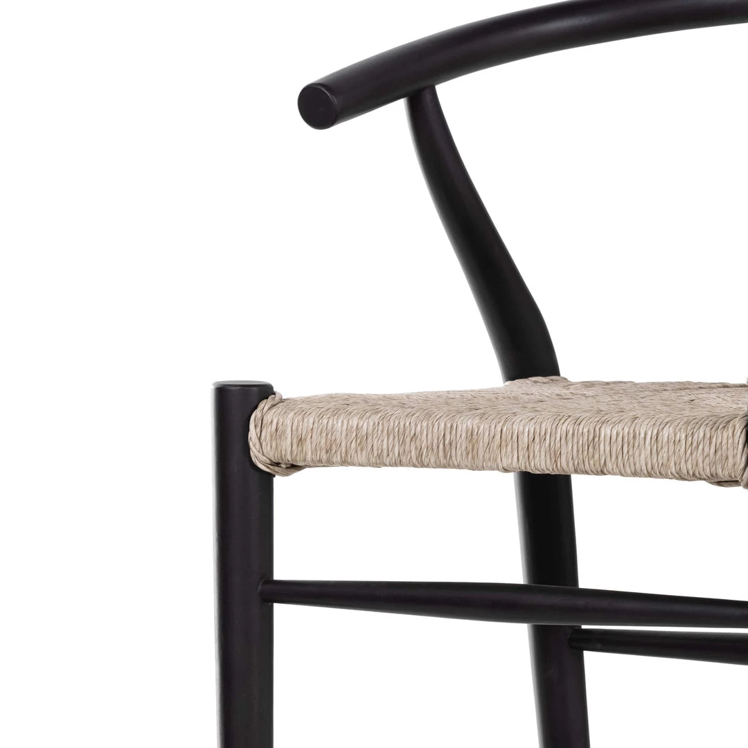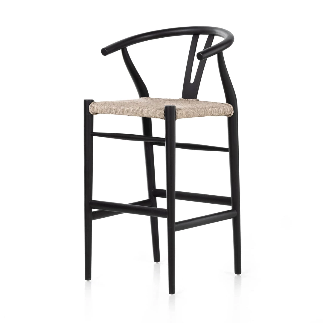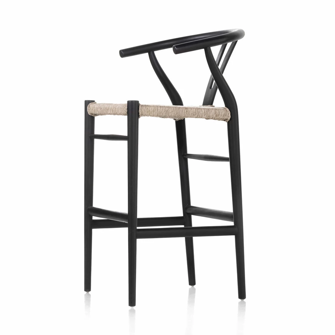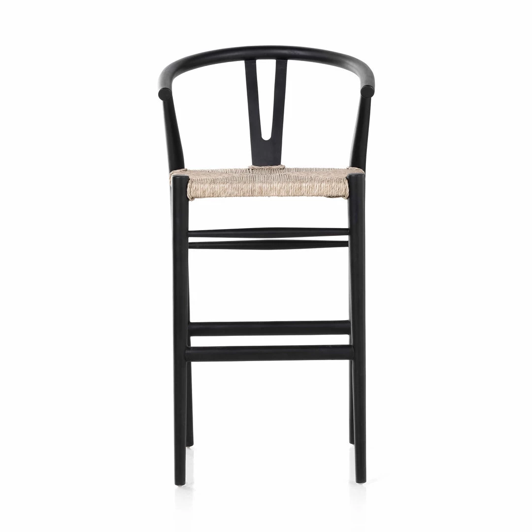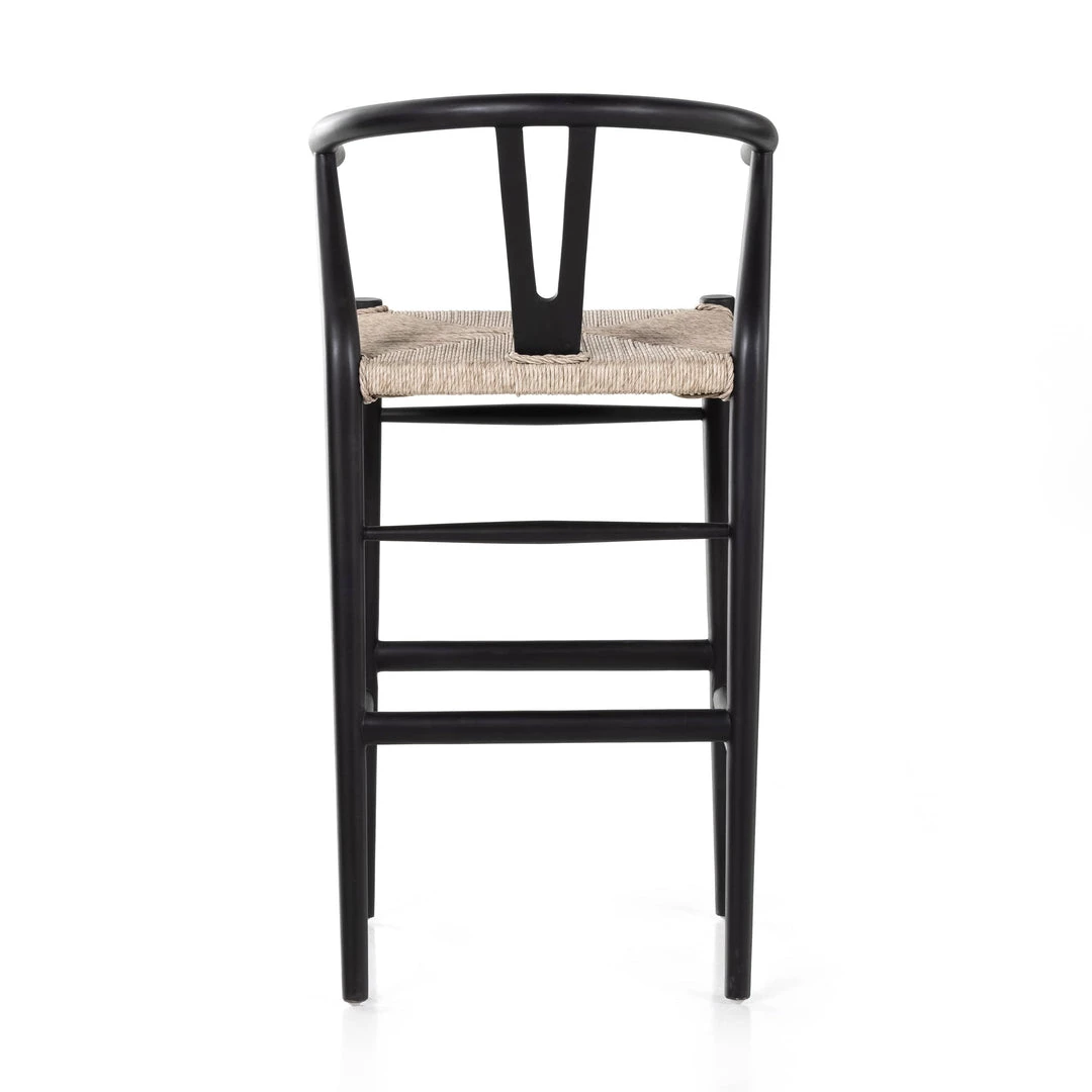 Modern curves redefine the classic wishbone-style bar stool. Vintage white all-weather wicker is woven for texture and contrast against black teak framing. For indoor use only.