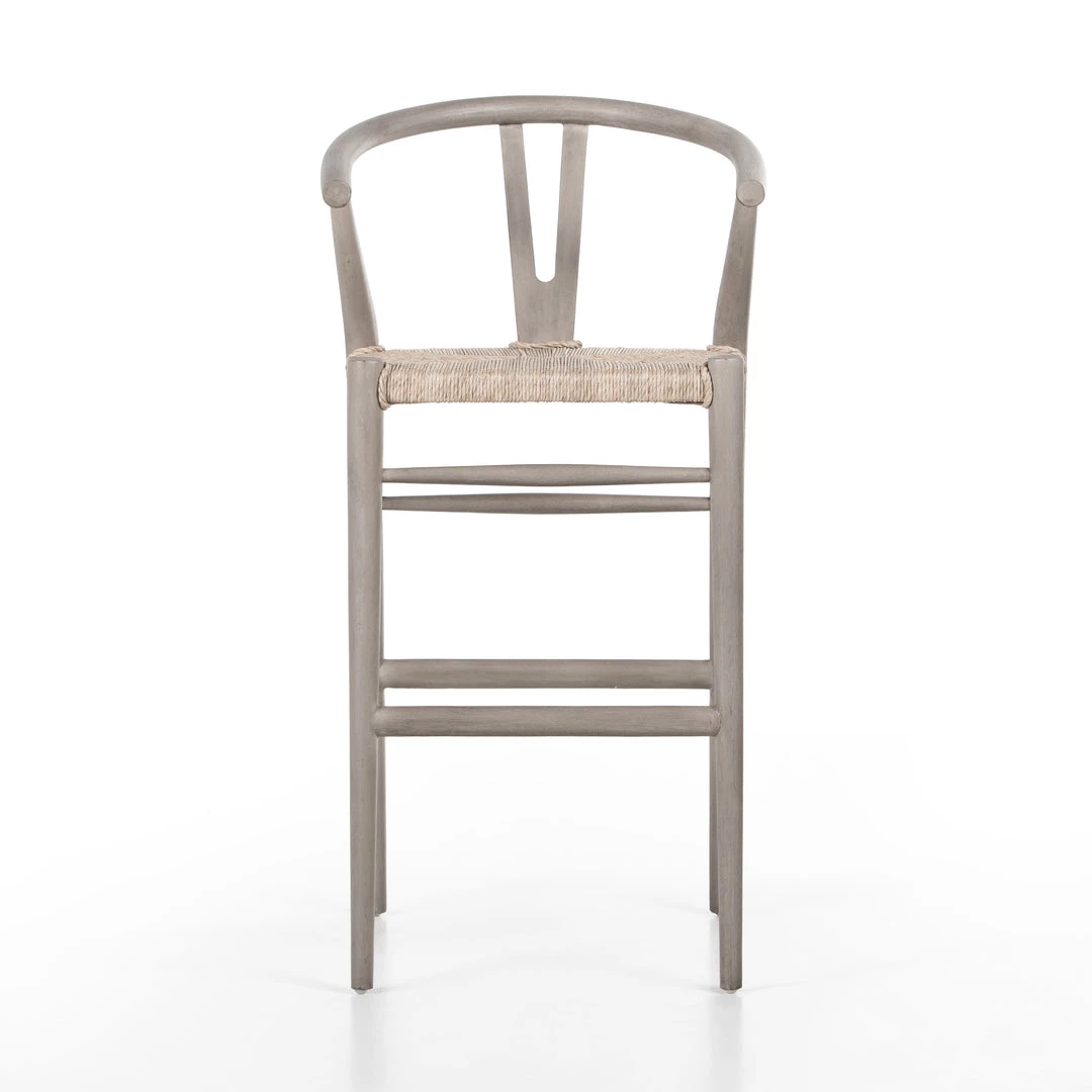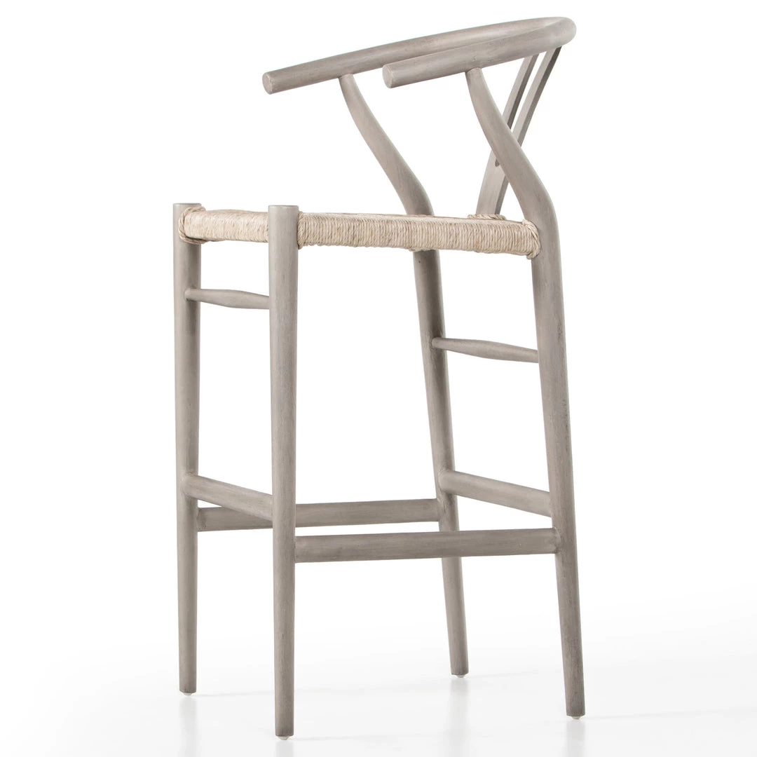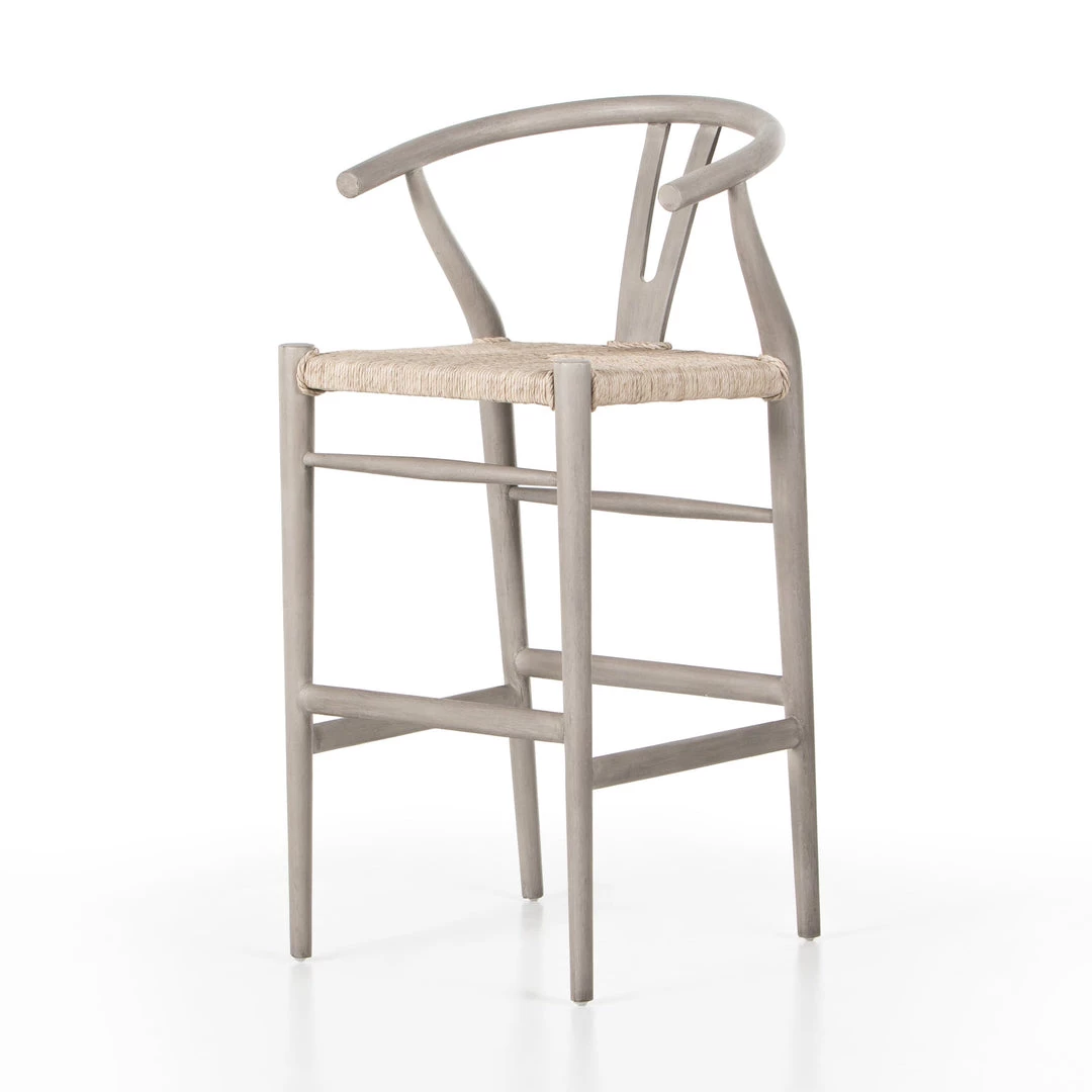 Modern curves redefine the classic wishbone-style bar stool. Vintage white all-weather wicker is woven for a dose of texture within weathered grey teak framing. Cover or store indoors during inclement weather and when not in use.