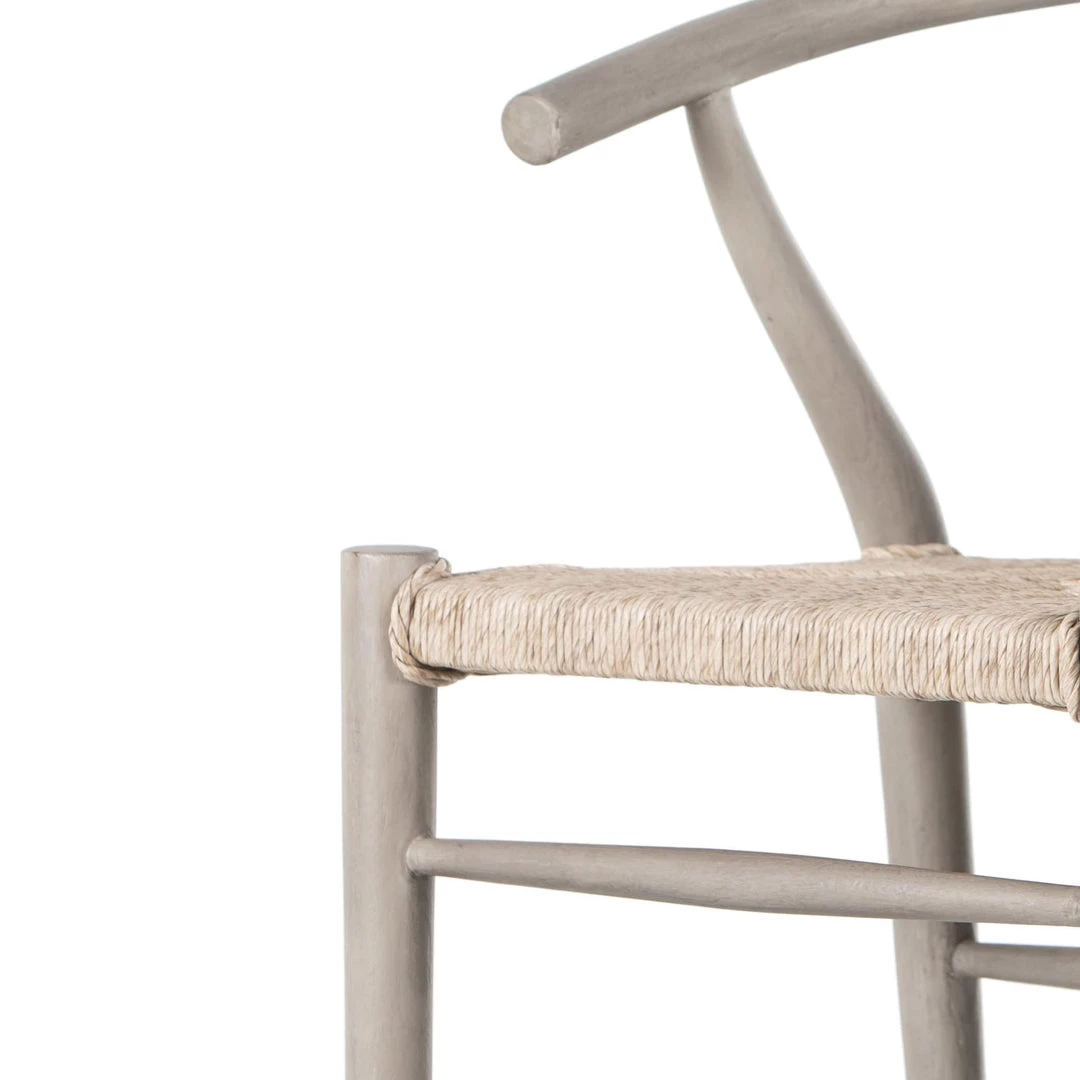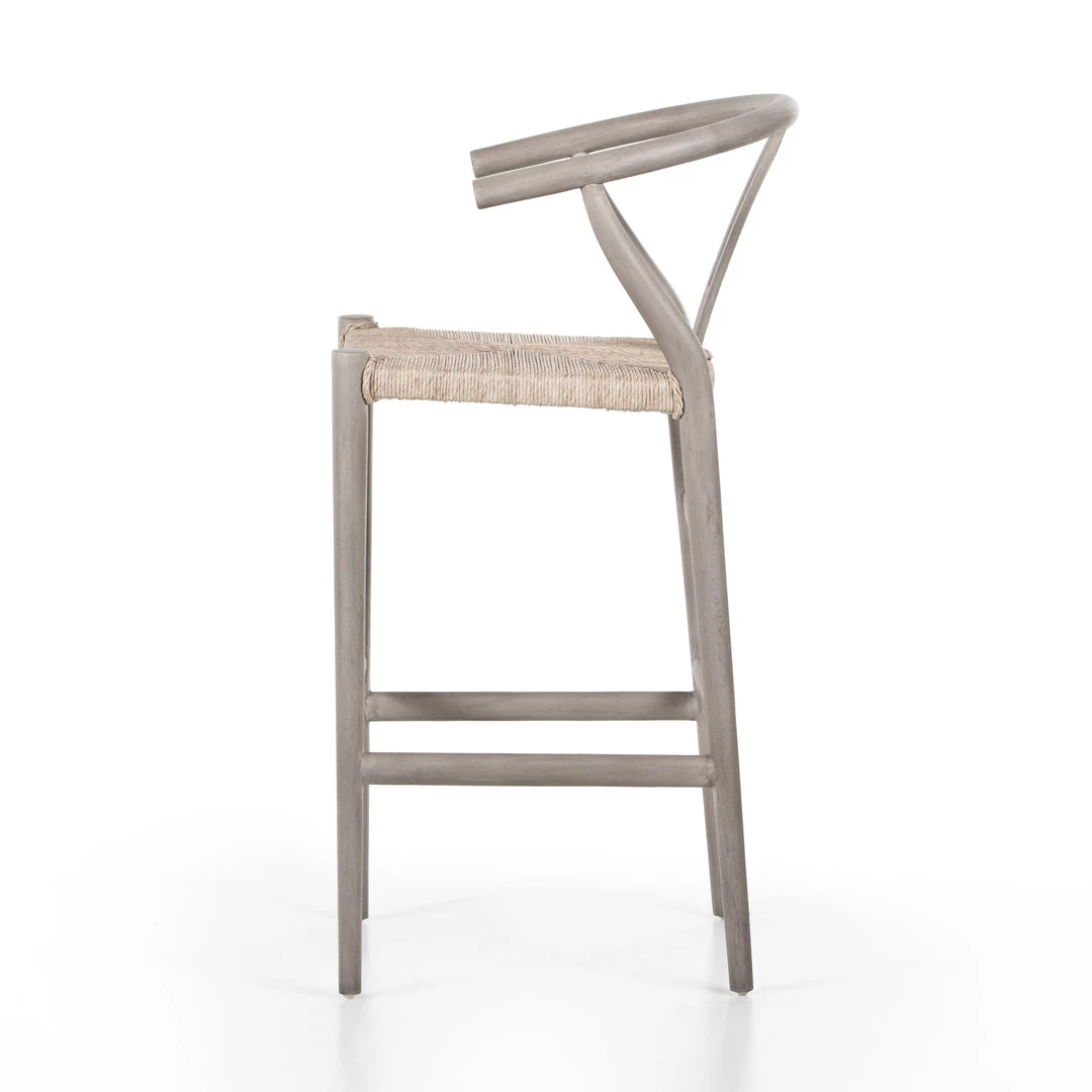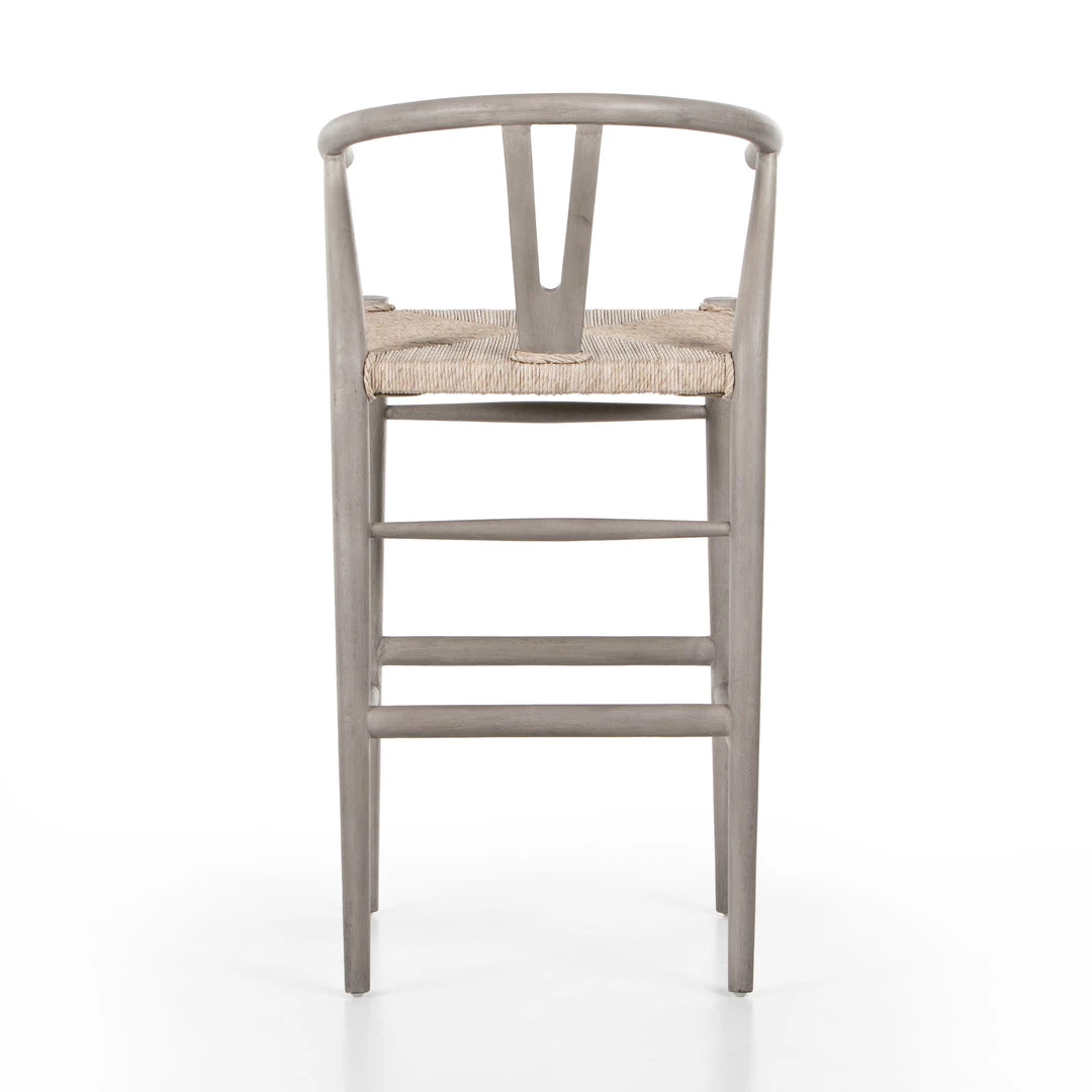 Modern curves redefine the classic wishbone-style bar stool. Vintage white all-weather wicker is woven for a dose of texture within weathered grey teak framing. Cover or store indoors during inclement weather and when not in use.